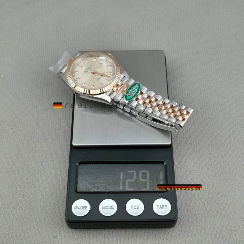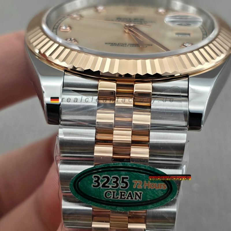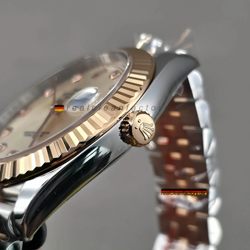 Die Datejust 41 in Everose Rolesor gilt als die eleganteste Konfiguration des modernen Klassikers. Clean Factory hat diese Referenz durch den Einsatz von echten Moissanit-Steinen auf dem Sundust-Zifferblatt perfektioniert. In Kombination mit der unübertroffenen Stabilität des Dandong 3235 Kalibers bietet dieses Modell ein kompromissloses 1:1 Luxuserlebnis.