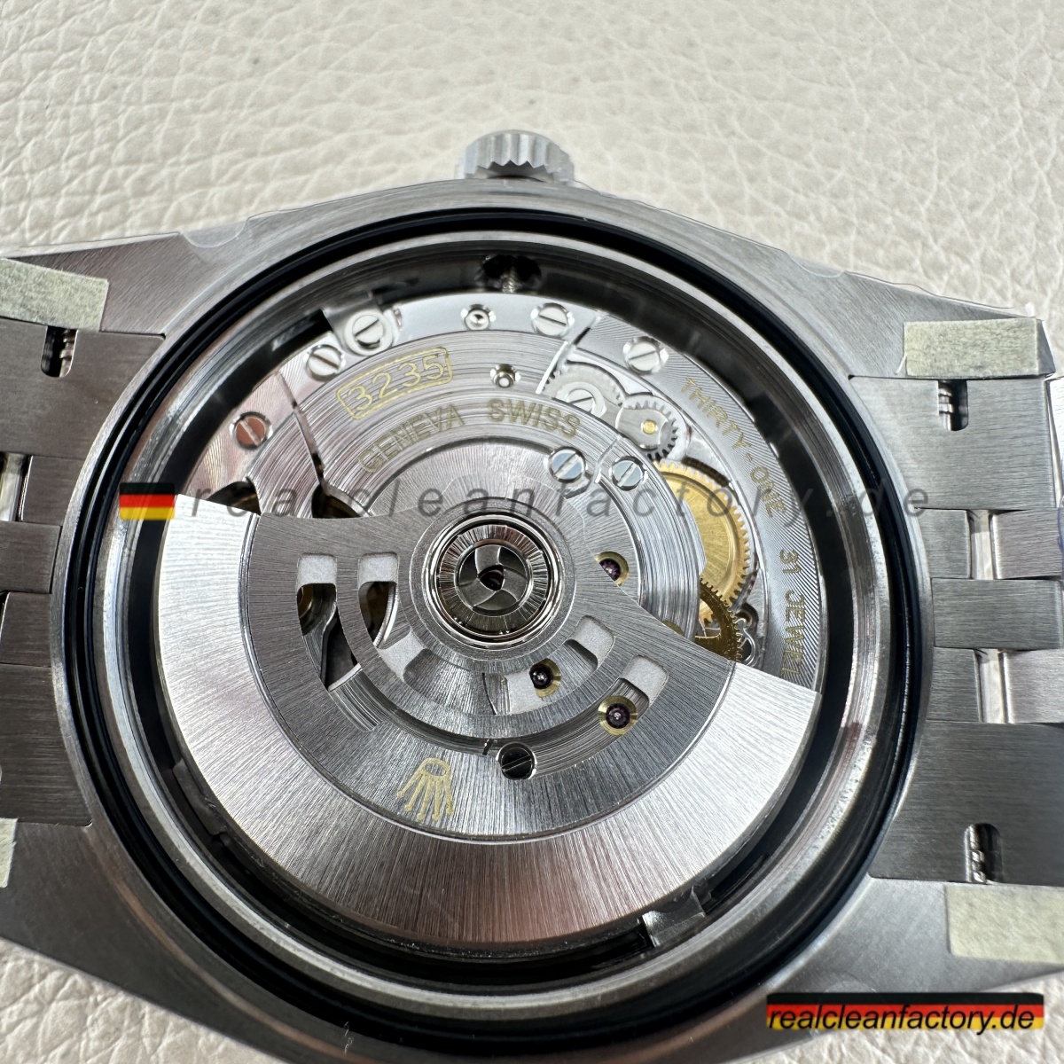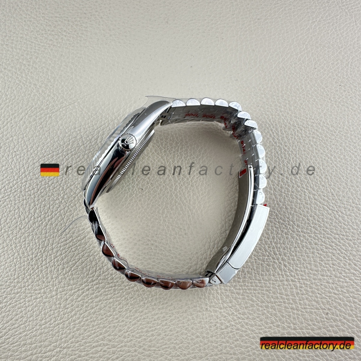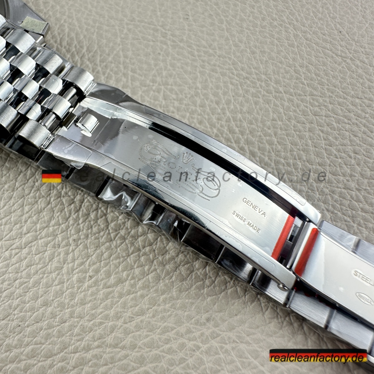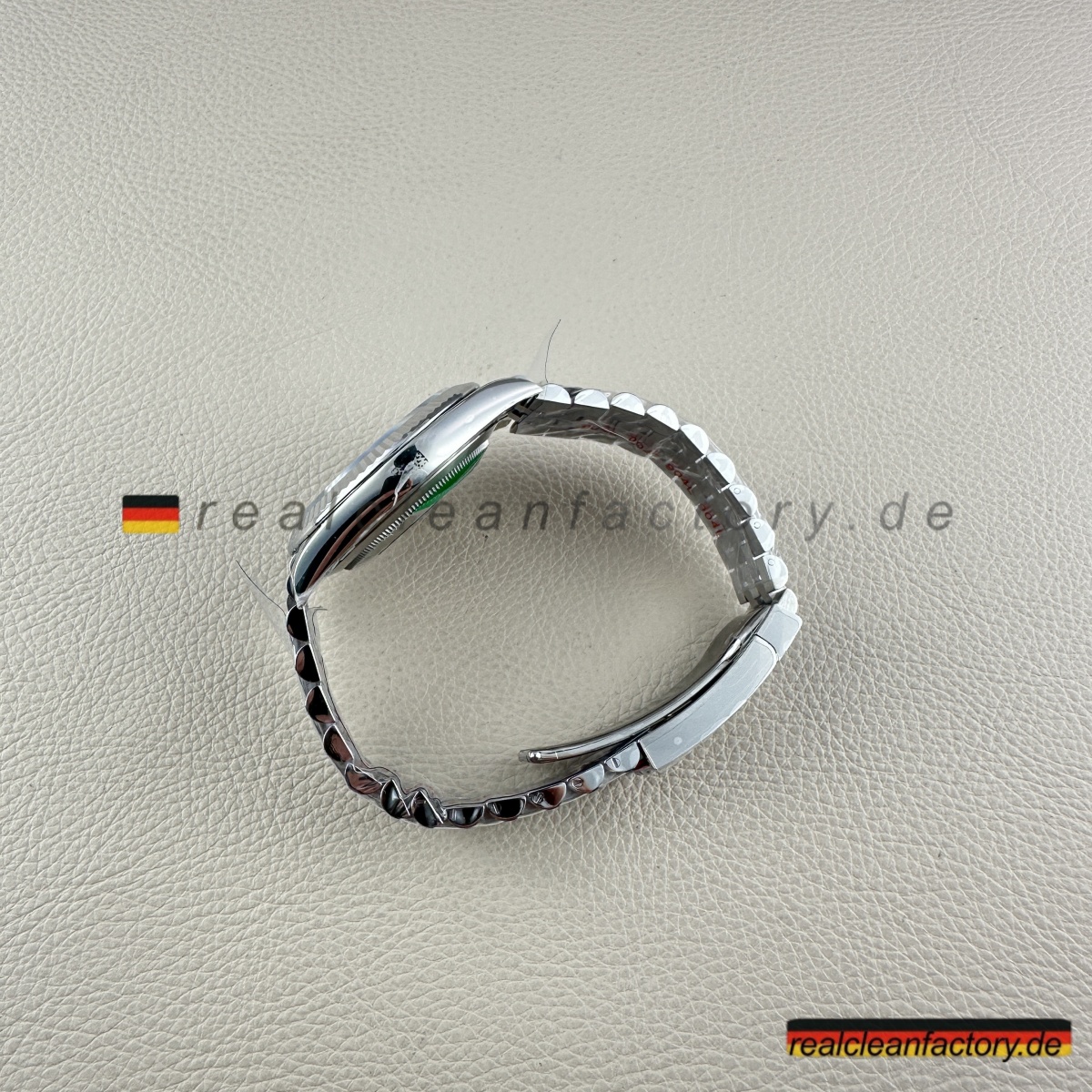 - Clean Factory’s Super Clone Rolex Datejust 126334-0032 kombiniert das faszinierende grüne Fluted-Muster Zifferblatt mit dem eleganten Jubilee-Armband und zeigt damit, dass Komplexität nicht auf Kosten der Alltagstauglichkeit gehen muss. Dieses Modell beweist, dass man Eleganz nicht opfern muss, nur weil man eine auffälligere Farbe möchte. Die meisten Fabriken können dieses Zifferblatt nicht einmal ansatzweise nachahmen, geschweige denn zusammen mit einem korrekt gefertigten Jubilee-Armband. Hier liefert Clean Factory ein Ergebnis, das so überzeugend ist, dass es unbemerkt neben dem echten Rolex-Modell bestehen könnte.