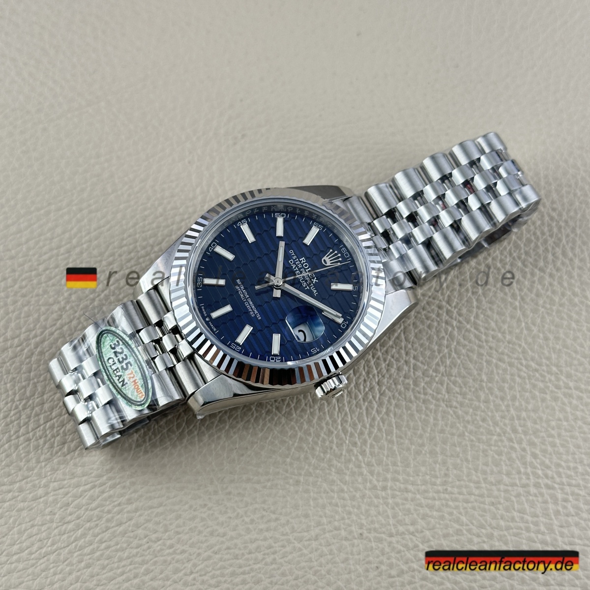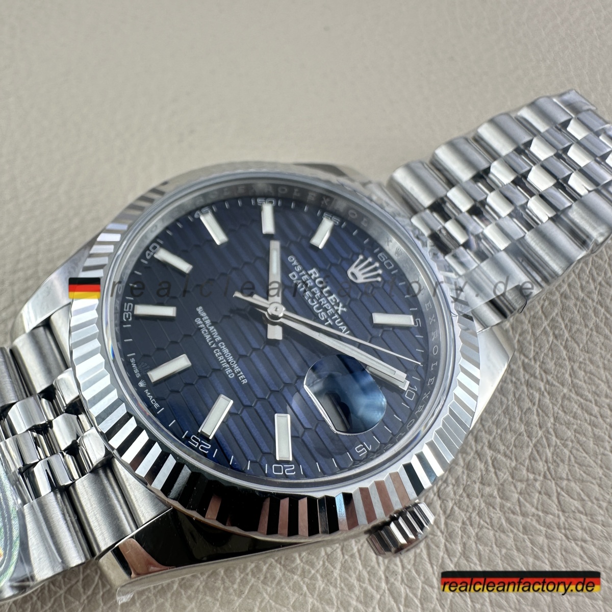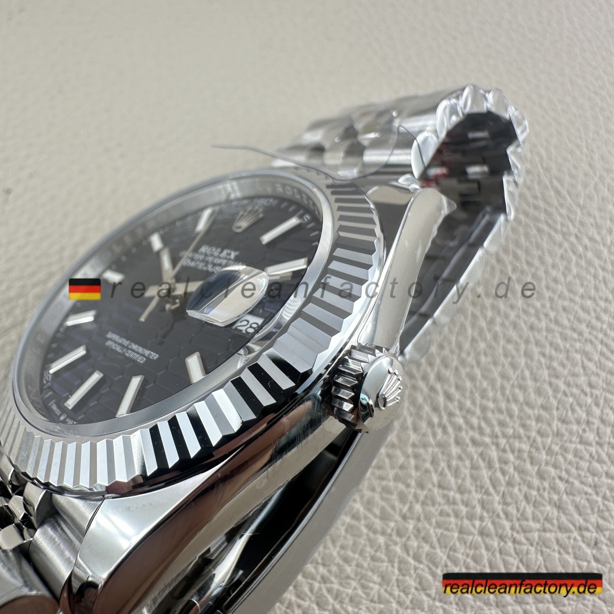 - Clean Factory’s Super Clone Rolex Datejust 126334-0032 kombiniert das faszinierende grüne Fluted-Muster Zifferblatt mit dem eleganten Jubilee-Armband und zeigt damit, dass Komplexität nicht auf Kosten der Alltagstauglichkeit gehen muss. Dieses Modell beweist, dass man Eleganz nicht opfern muss, nur weil man eine auffälligere Farbe möchte. Die meisten Fabriken können dieses Zifferblatt nicht einmal ansatzweise nachahmen, geschweige denn zusammen mit einem korrekt gefertigten Jubilee-Armband. Hier liefert Clean Factory ein Ergebnis, das so überzeugend ist, dass es unbemerkt neben dem echten Rolex-Modell bestehen könnte.