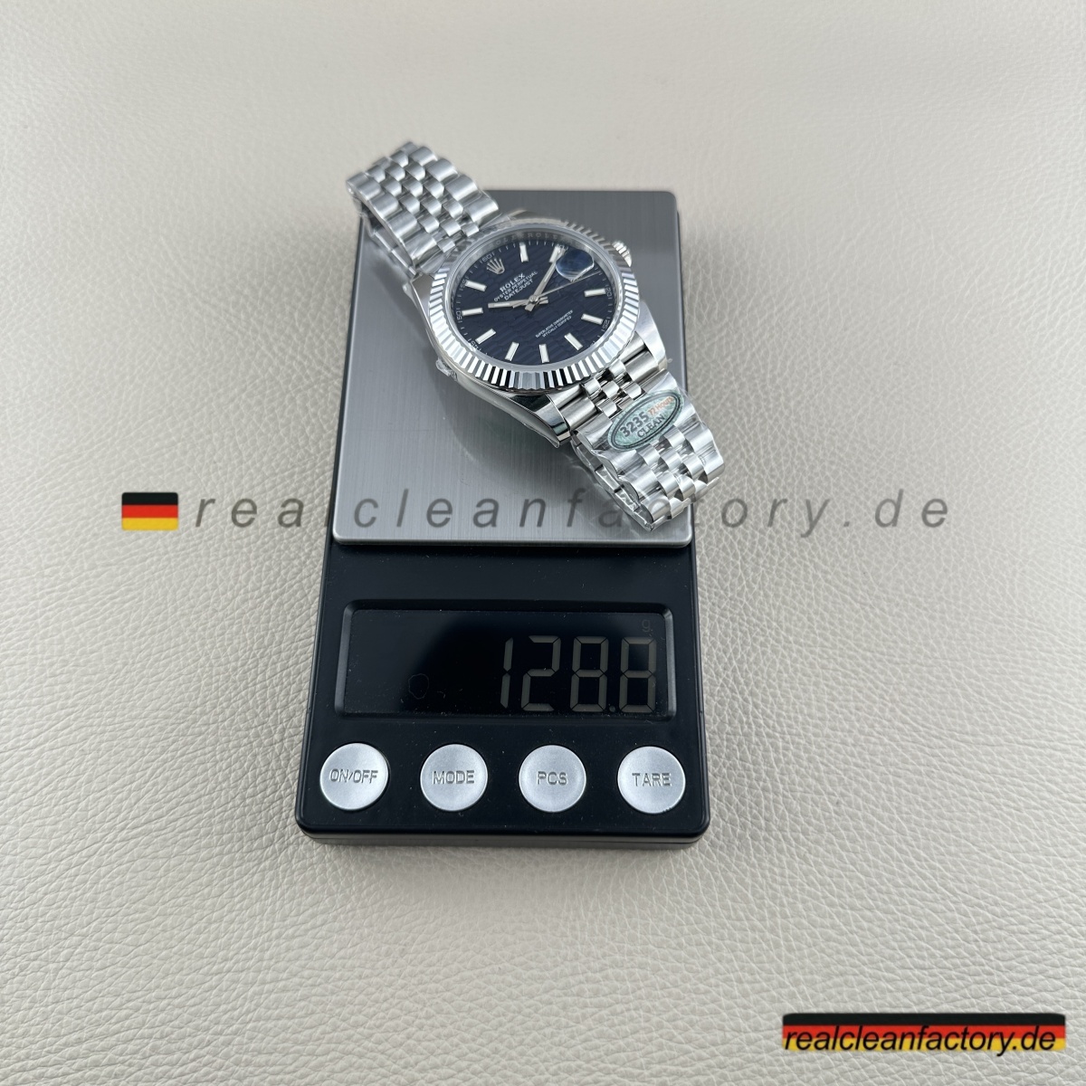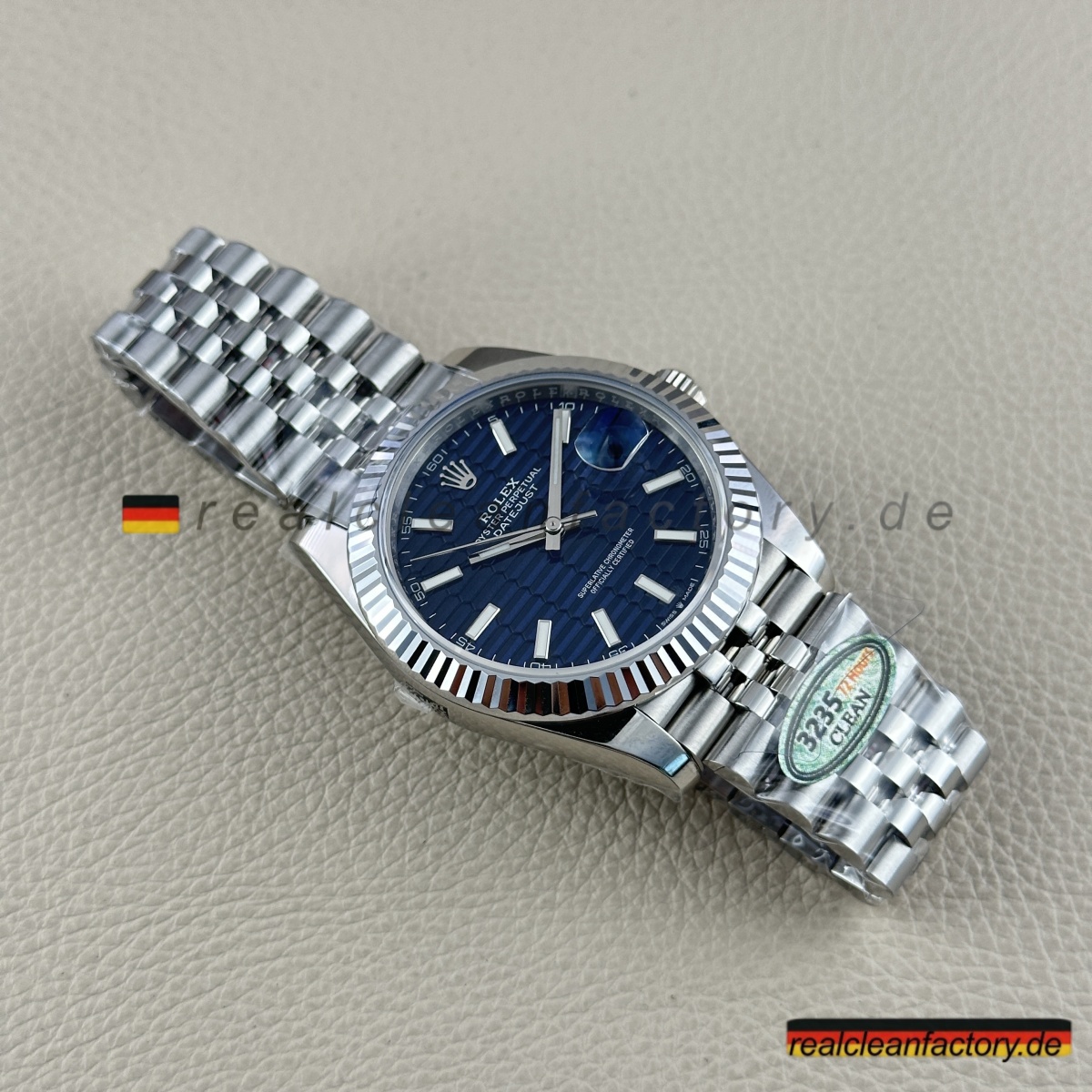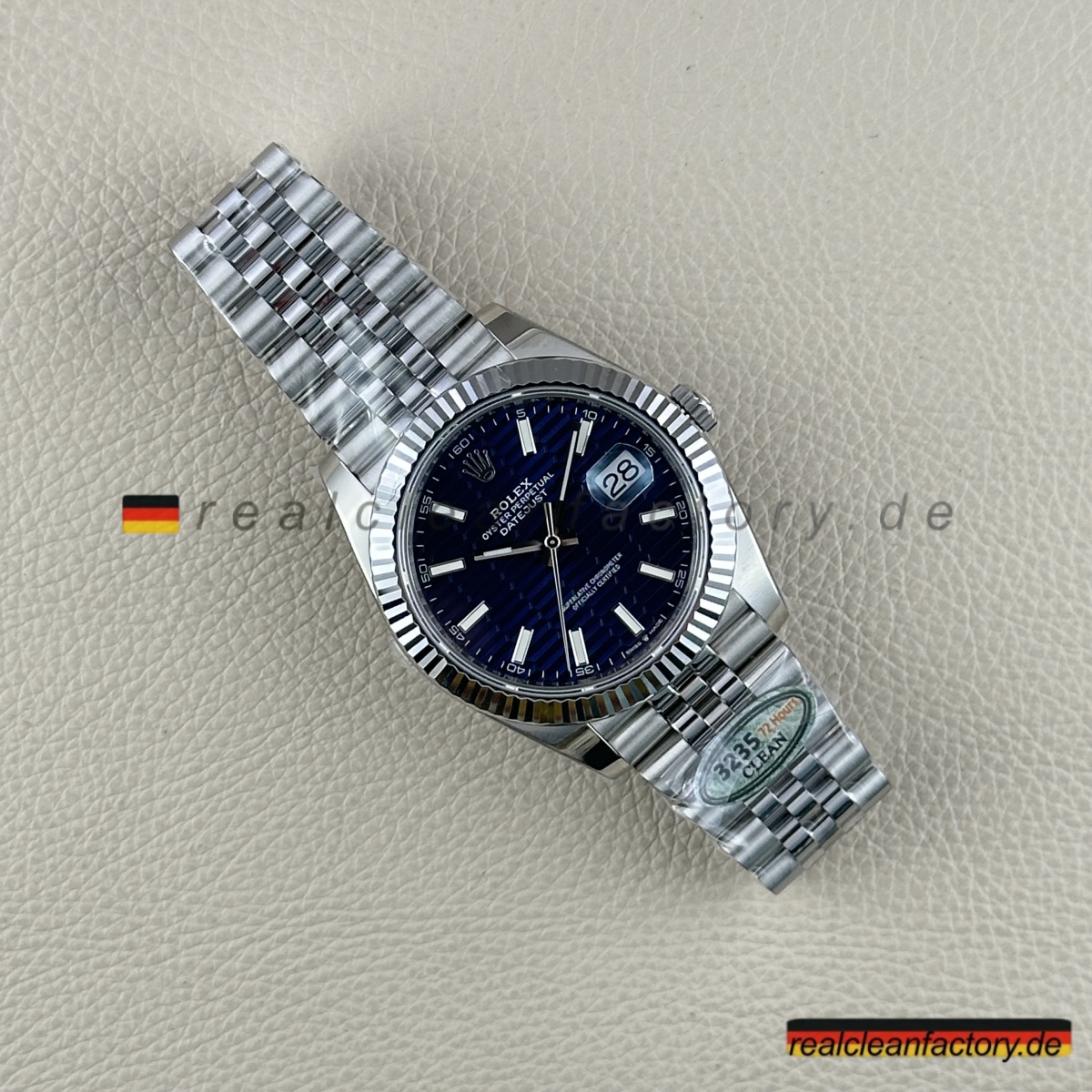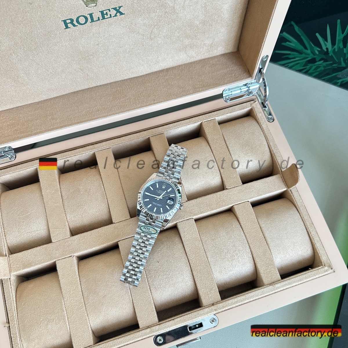 - Clean Factory’s Super Clone Rolex Datejust 126334-0032 kombiniert das faszinierende grüne Fluted-Muster Zifferblatt mit dem eleganten Jubilee-Armband und zeigt damit, dass Komplexität nicht auf Kosten der Alltagstauglichkeit gehen muss. Dieses Modell beweist, dass man Eleganz nicht opfern muss, nur weil man eine auffälligere Farbe möchte. Die meisten Fabriken können dieses Zifferblatt nicht einmal ansatzweise nachahmen, geschweige denn zusammen mit einem korrekt gefertigten Jubilee-Armband. Hier liefert Clean Factory ein Ergebnis, das so überzeugend ist, dass es unbemerkt neben dem echten Rolex-Modell bestehen könnte.