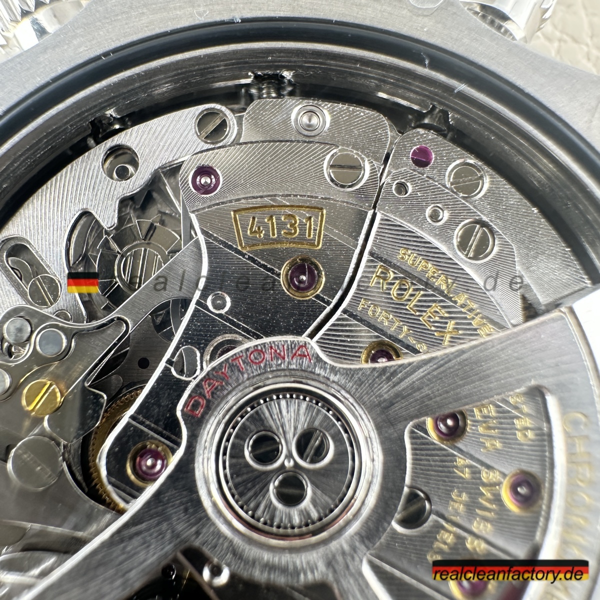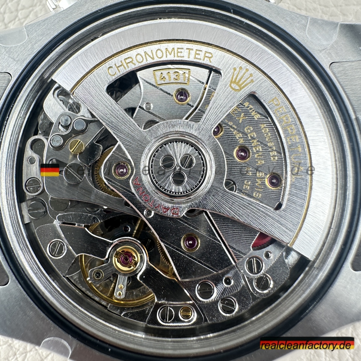 • Innen wird es richtig verrückt. 4131-Klon-Uhrwerk. Nicht eine "sieht irgendwie so aus"-Version --- wir haben das echte 4131 zerlegt, jeden Edelstein, Zahnrad und Feder kartiert. Start/Stopp/Reset am Chronographen? Geschmeidig, klickig, straff --- wie das echte Ding. Kein Lag, kein Spiel. Wir haben es sogar an einem Track Day laufen lassen. Totgenau.