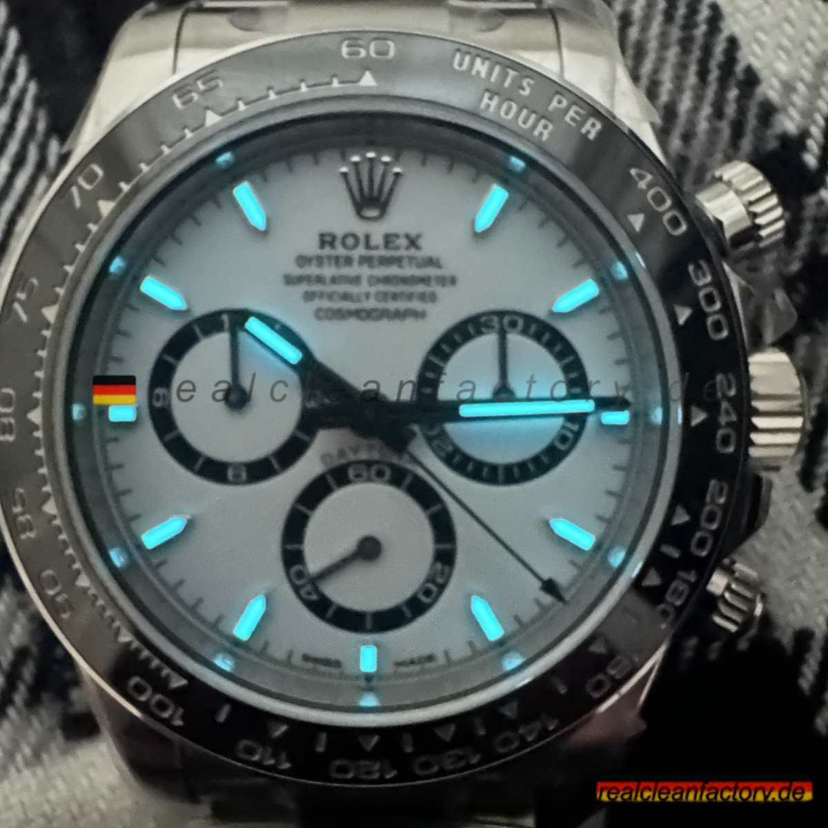 • Die Rolex Daytona Panda? Das war fast zu ehrgeizig zum Anfassen. Die Clean Factory 126500LN-0001 --- weißes Zifferblatt, schwarze Subdials, die Ikone, die alle anstarren --- und wir sind voll reingegangen. Der beängstigende Teil? Es kam so nah raus, dass echte Uhrmacher uns anrufen, um unsere Teile für echte Reparaturen zu kaufen.