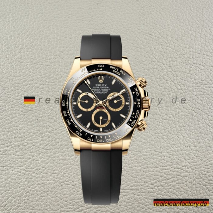 - Das ist das Besondere an wahrer Meisterschaft --- sie braucht keine Farbe, um Aufmerksamkeit zu befehlen, sie dominiert durch pure Raffinesse und perfekte Ausführung. Die Clean Factory 126518LN-0008 "Schwarz Gold Meisterwerk" ist nicht einfach nur eine weitere monochromatische Uhr. Dies ist die Rolex Daytona, die kühne Eleganz mit diesem tiefen schwarzen Zifferblatt, passenden schwarzen Hilfszifferblättern mit exquisiter Gelbgold-Schnecken-Veredelung und kommandanter Gelbgold-Präsenz einfängt.