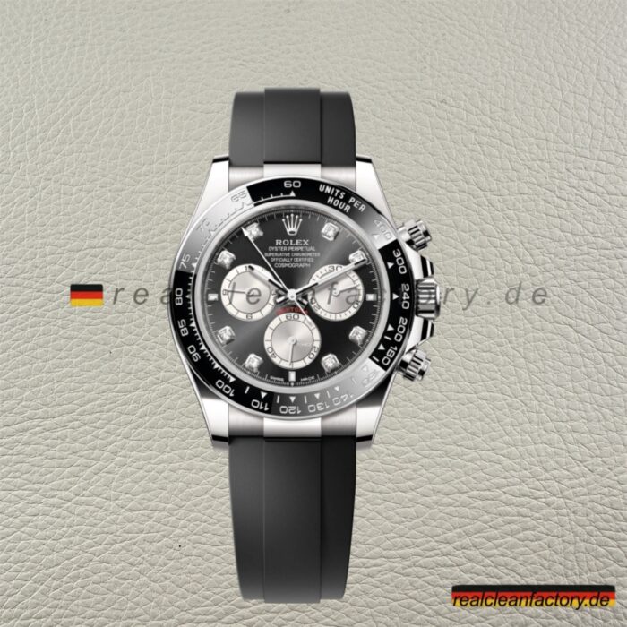 - Erleben Sie die ultimative Luxus-Replika der **Rolex Daytona 126519LN-0004** mit **18k Weißgold** und **Moissanit-Diamanten**. Diese **Super Clone**-Replika von Clean Factory bietet präzise Details und Handwerkskunst, die mit echten Rolex-Uhren konkurrieren. Mit ihrem tiefschwarzen Zifferblatt und den kontrastierenden silbernen Subdials ist diese Uhr sowohl elegant als auch sportlich – ein wahres Meisterwerk der Uhrmacherkunst.