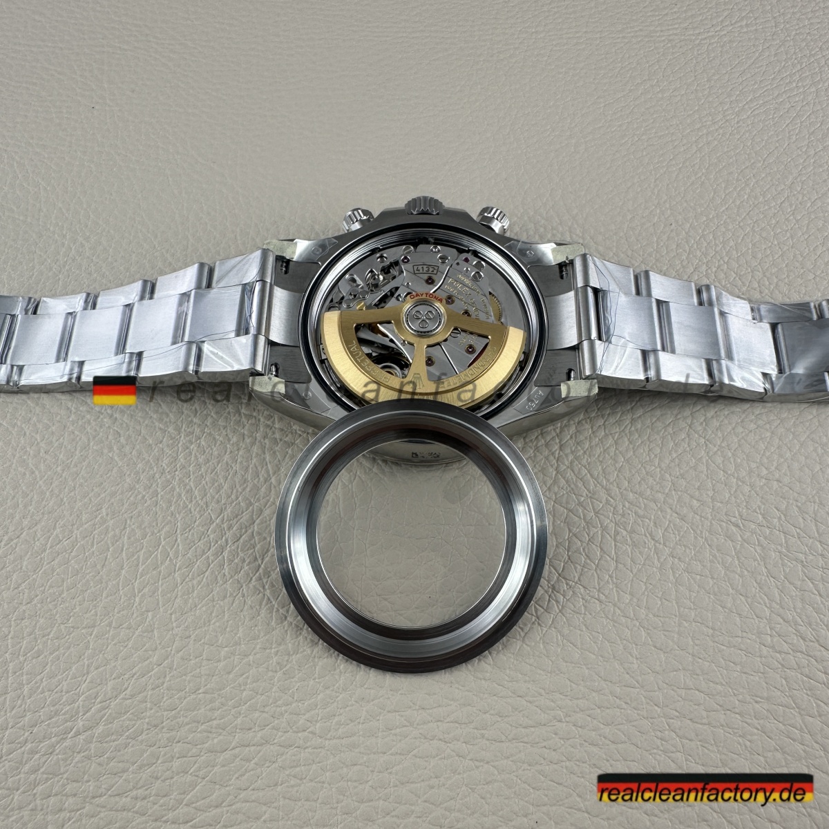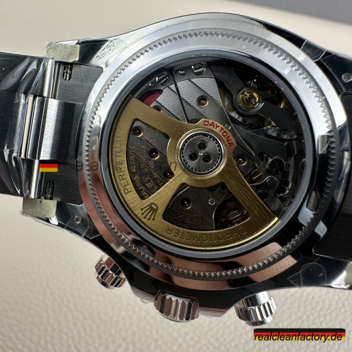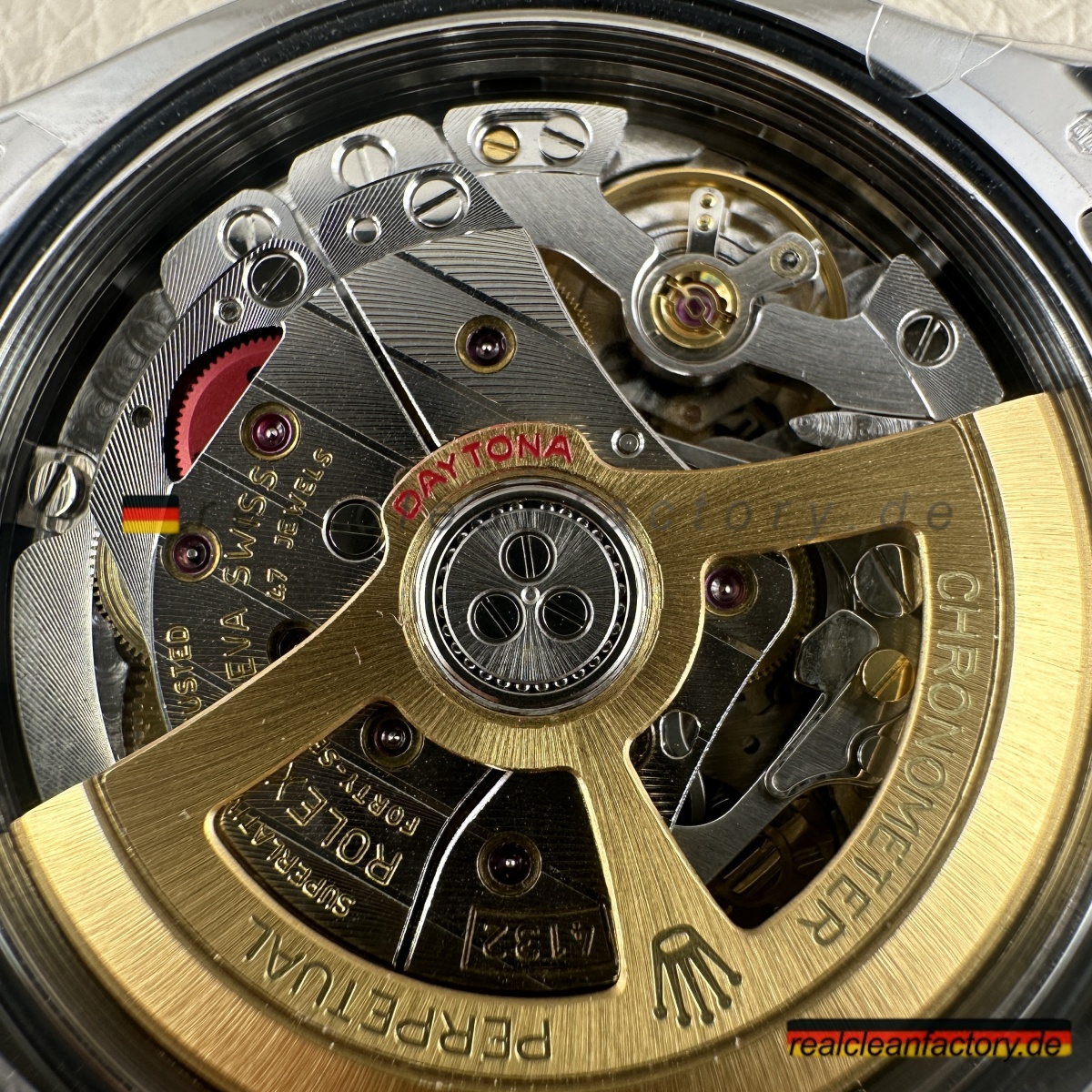 • <p><strong>Hier wird Clean Factorys technische Überlegenheit unbestreitbar sichtbar</strong> – das exklusive 4132 Uhrwerk. Während BTF, VSF und andere Standard-4130 oder 4131 Werke verbauen, die nur 12 Stunden messen können, entwickelte Clean Factory das 4132 speziell für diese Le Mans Edition. Die Werkstruktur ist identisch zum echten Rolex – echte 24-Stunden-Chronographen-Fähigkeit durch modifizierte Zahnräder und zusätzliche Komponenten. Das ist kein Fake-Zifferblatt auf einem 12-Stunden-Werk – das ist echte 24-Stunden-Architektur.</p>