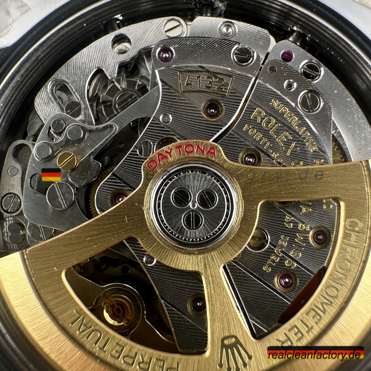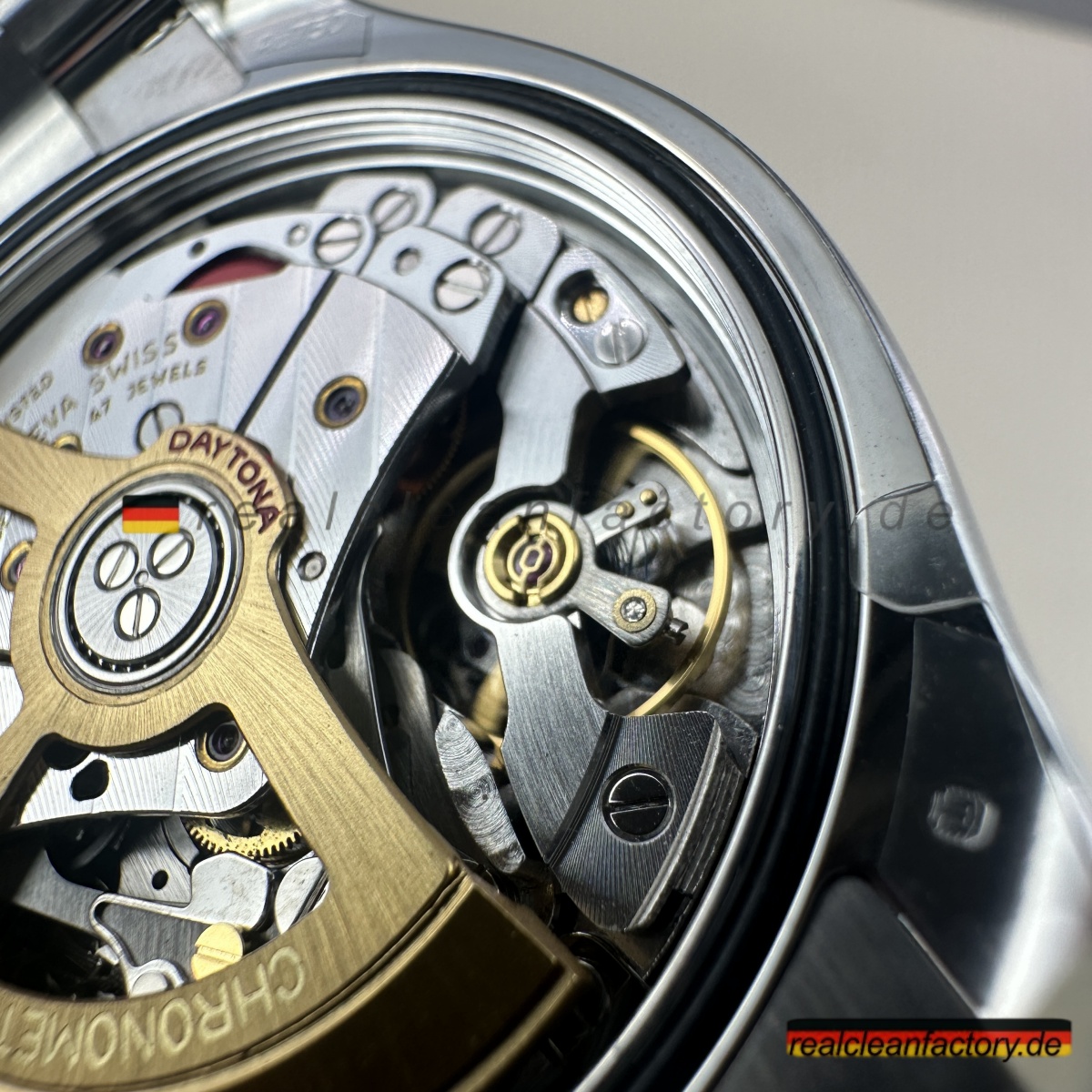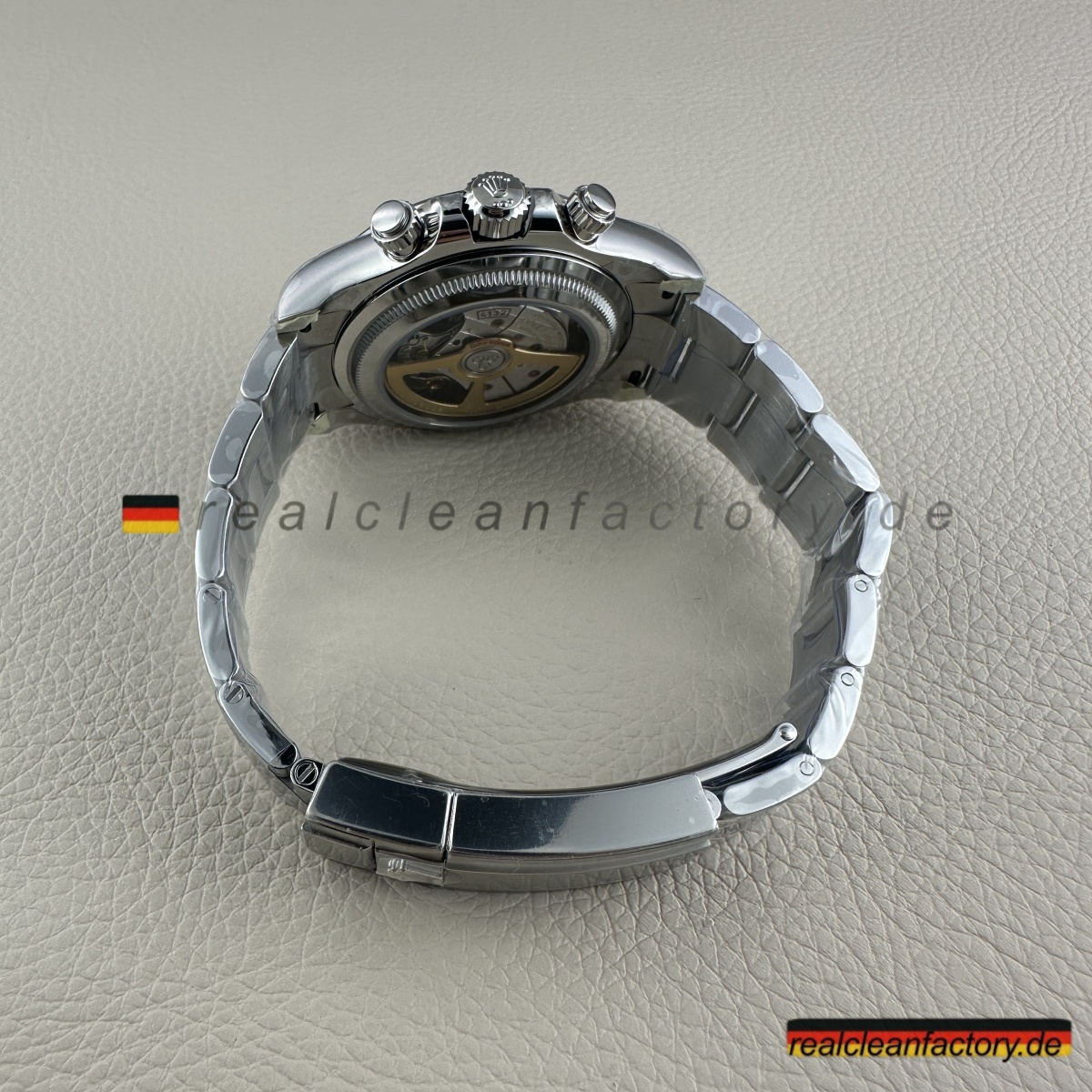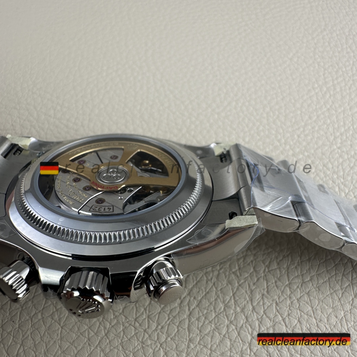 • <p><strong>Hier wird Clean Factorys technische Überlegenheit unbestreitbar sichtbar</strong> – das exklusive 4132 Uhrwerk. Während BTF, VSF und andere Standard-4130 oder 4131 Werke verbauen, die nur 12 Stunden messen können, entwickelte Clean Factory das 4132 speziell für diese Le Mans Edition. Die Werkstruktur ist identisch zum echten Rolex – echte 24-Stunden-Chronographen-Fähigkeit durch modifizierte Zahnräder und zusätzliche Komponenten. Das ist kein Fake-Zifferblatt auf einem 12-Stunden-Werk – das ist echte 24-Stunden-Architektur.</p>