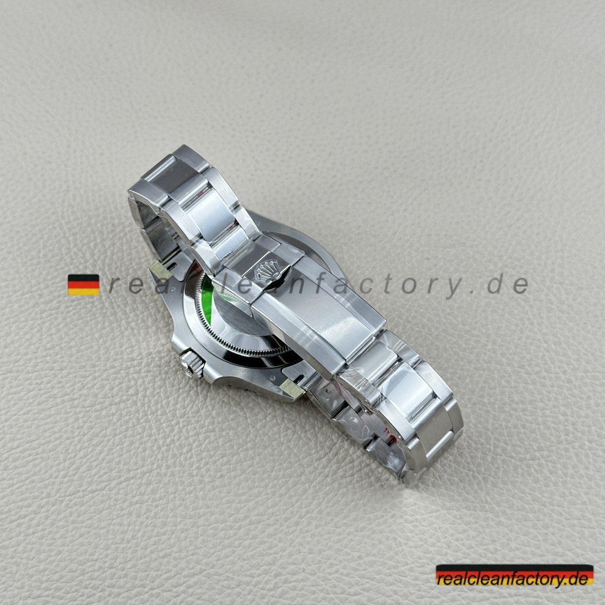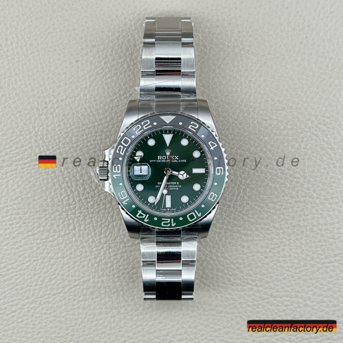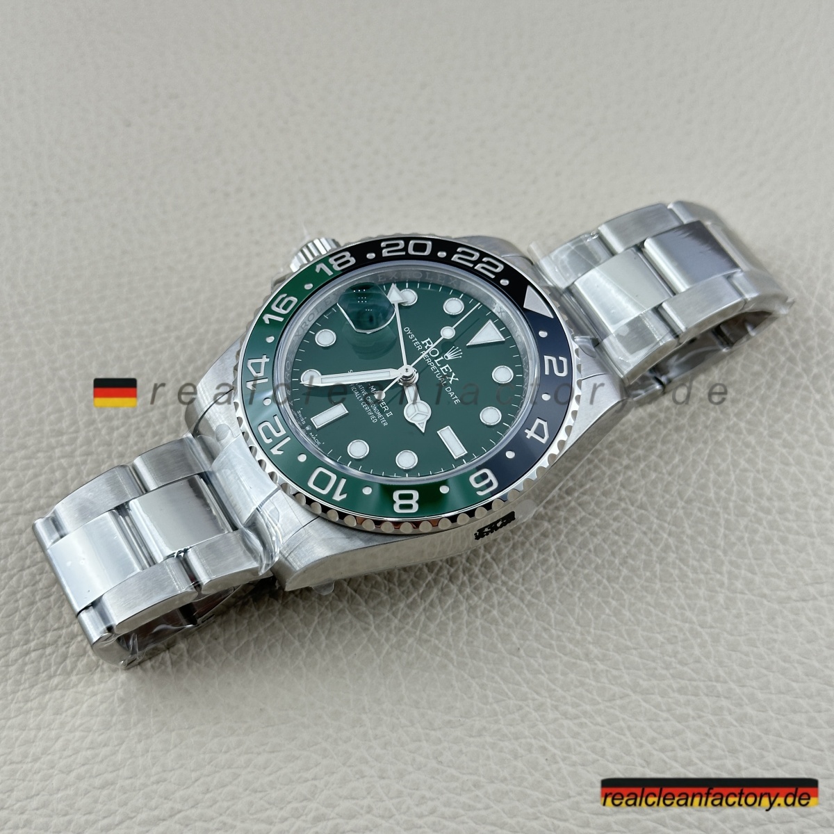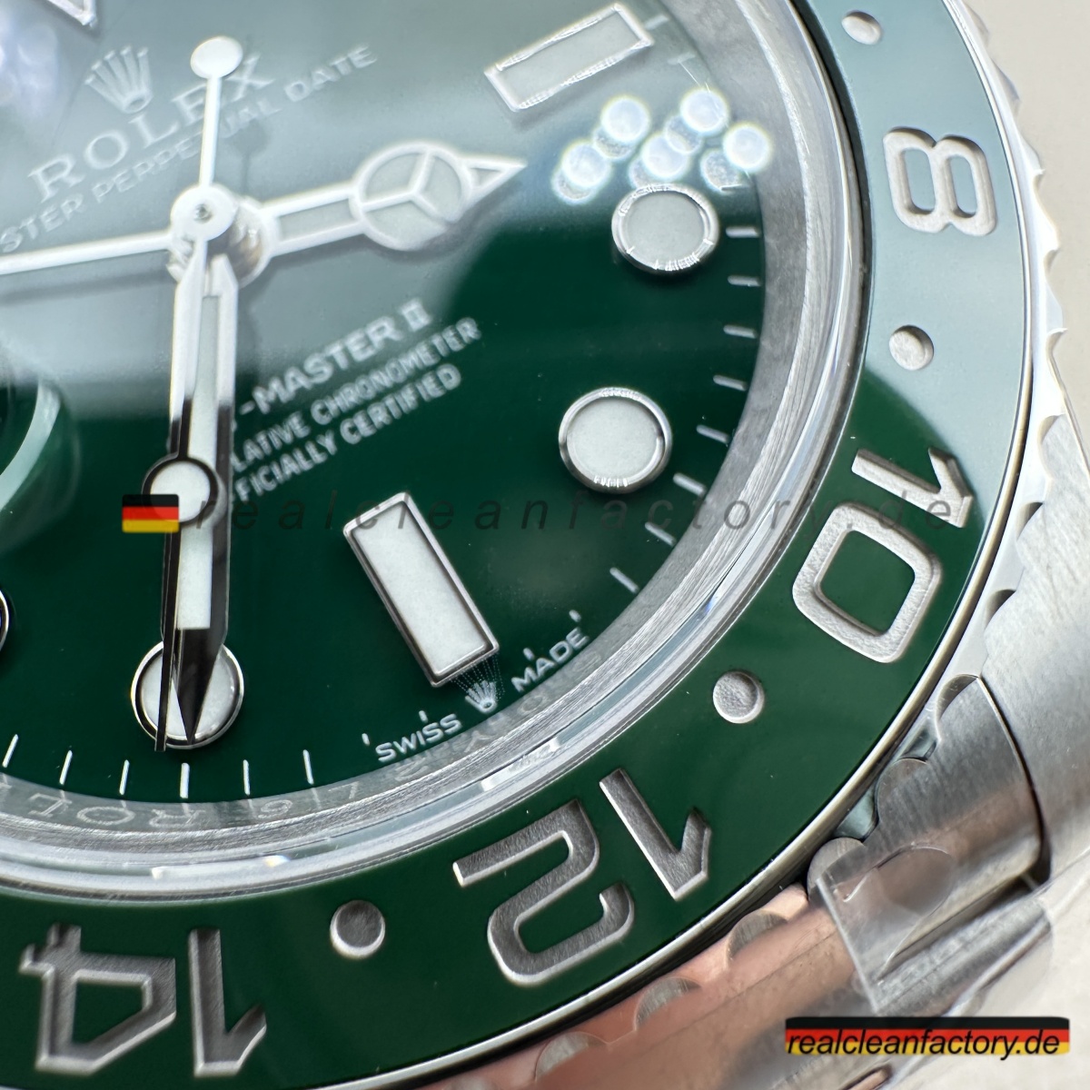 - Diese grüne Zifferblatt-Linkshänder-GMT ist die Uhr, mit der niemand gerechnet hat - nicht einmal 2022, als Rolex alle mit der originalen schwarzen Zifferblatt-Sprite schockierte. Rolex wartete bis 2025, um diese grüne Zifferblatt-Version herauszubringen, und wir haben sie bereits perfekt umgesetzt. Alles, was das Original besonders macht, ist hier vorhanden, mit einer Präzision ausgeführt, die unsere Version praktisch ununterscheidbar vom 20.000+ € Original macht.