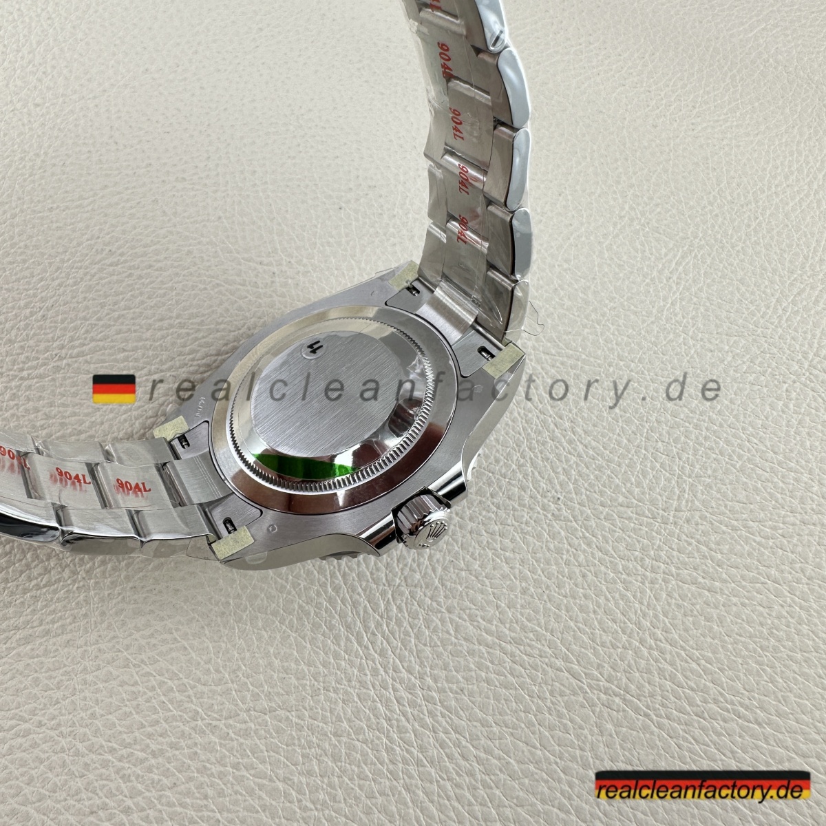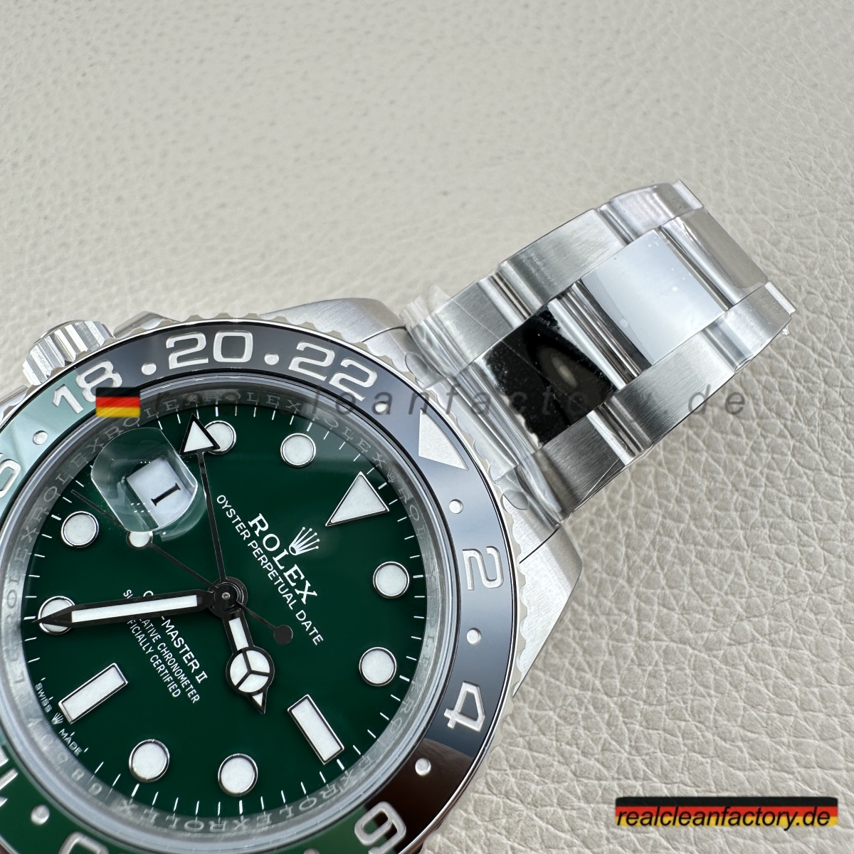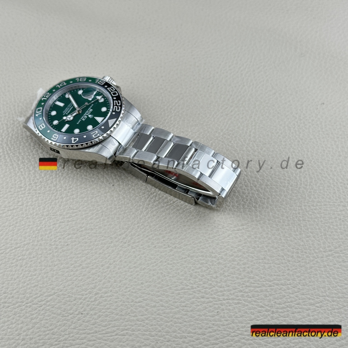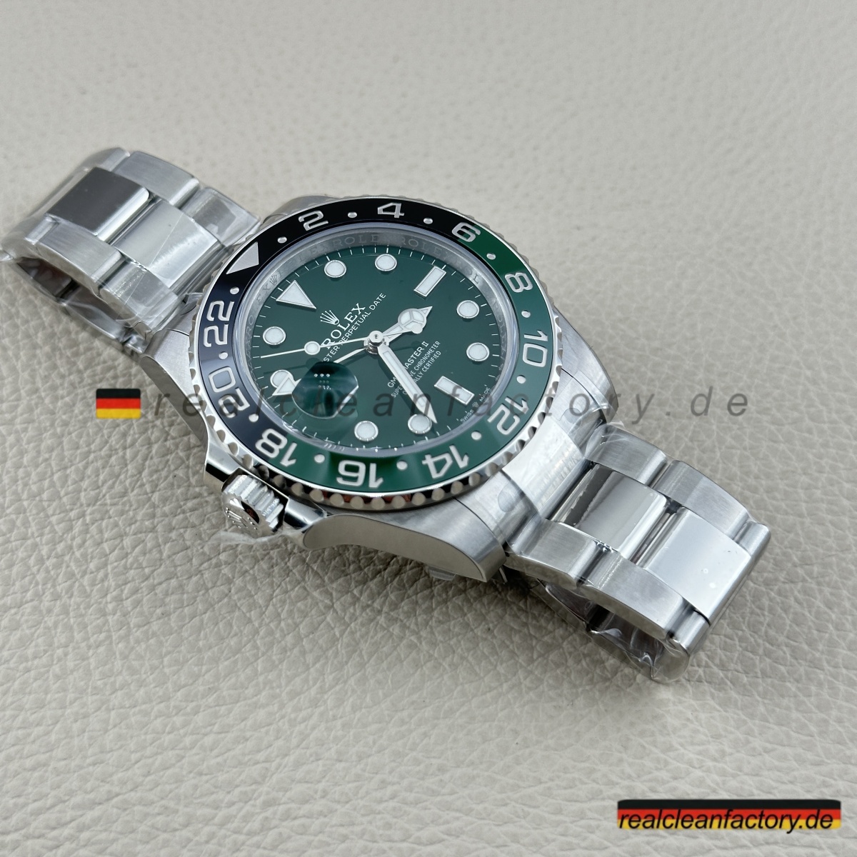 - Diese grüne Zifferblatt-Linkshänder-GMT ist die Uhr, mit der niemand gerechnet hat - nicht einmal 2022, als Rolex alle mit der originalen schwarzen Zifferblatt-Sprite schockierte. Rolex wartete bis 2025, um diese grüne Zifferblatt-Version herauszubringen, und wir haben sie bereits perfekt umgesetzt. Alles, was das Original besonders macht, ist hier vorhanden, mit einer Präzision ausgeführt, die unsere Version praktisch ununterscheidbar vom 20.000+ € Original macht.