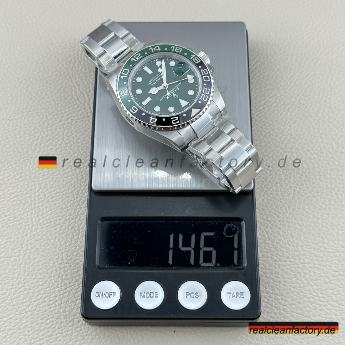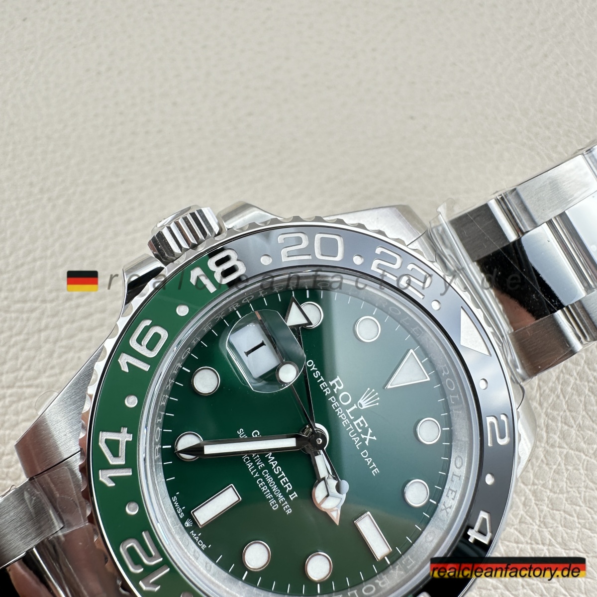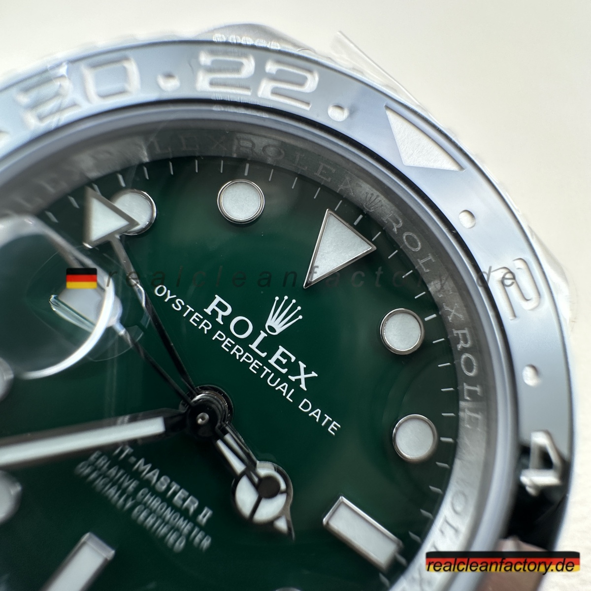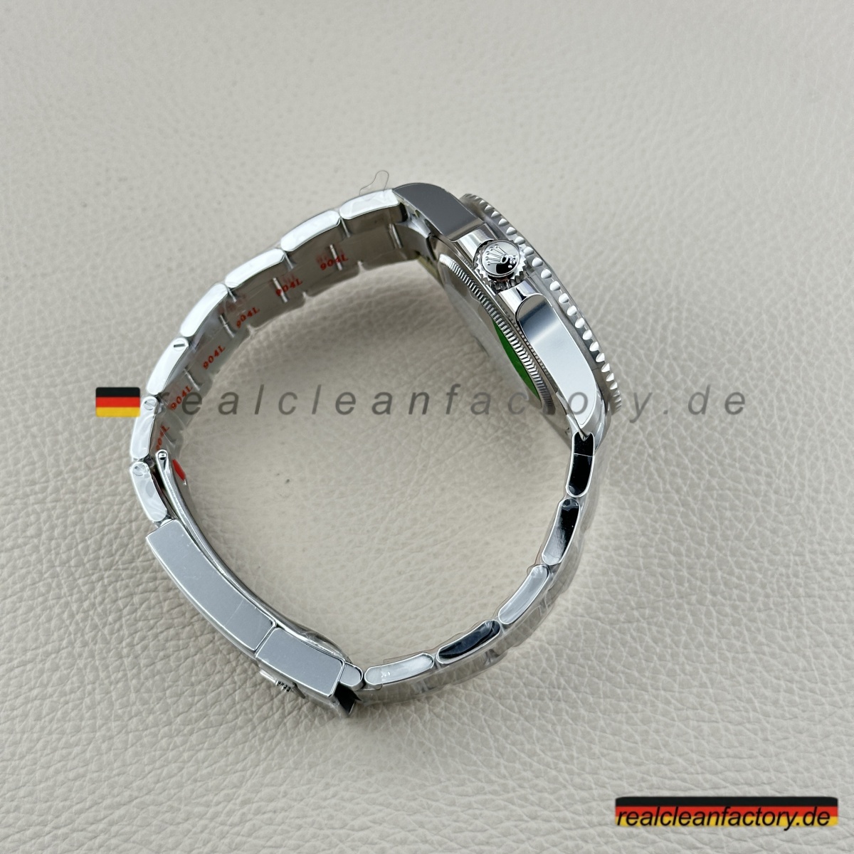 - Diese grüne Zifferblatt-Linkshänder-GMT ist die Uhr, mit der niemand gerechnet hat - nicht einmal 2022, als Rolex alle mit der originalen schwarzen Zifferblatt-Sprite schockierte. Rolex wartete bis 2025, um diese grüne Zifferblatt-Version herauszubringen, und wir haben sie bereits perfekt umgesetzt. Alles, was das Original besonders macht, ist hier vorhanden, mit einer Präzision ausgeführt, die unsere Version praktisch ununterscheidbar vom 20.000+ € Original macht.