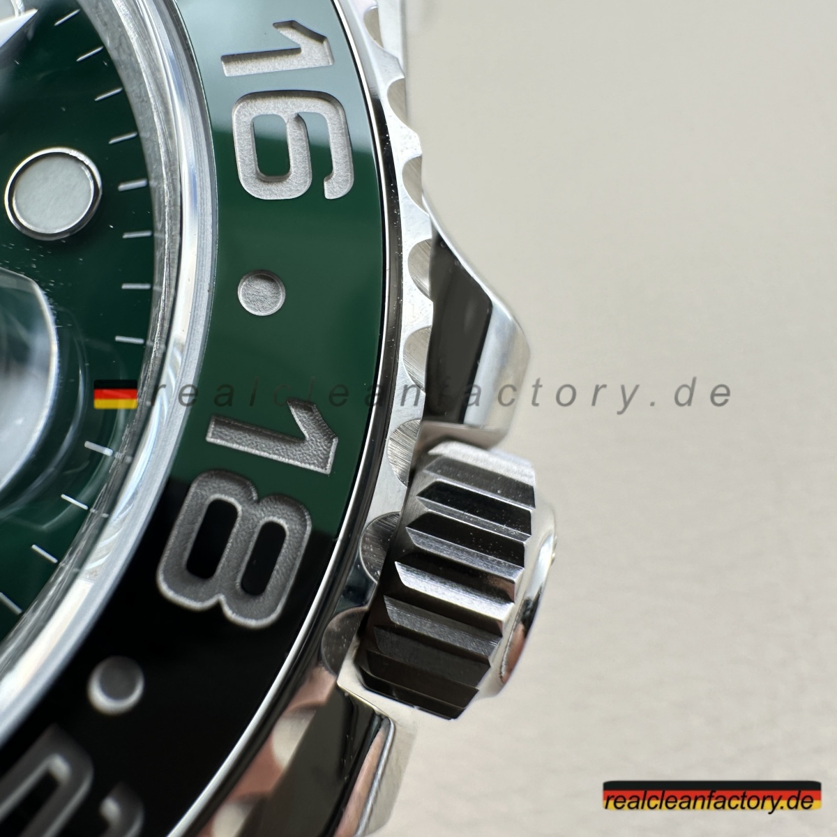 - Unsere Keramiklünette ist die beste auf dem Markt - wir sind die einzige Fabrik, die nicht nur die Farben und den Übergang zwischen Schwarz und Grün, sondern auch das Gefühl der Rotation perfekt getroffen hat. Diese 24 Klicks haben genau den gleichen Widerstand wie das Original, und du wirst niemals Rückspiel oder Wackeln spüren, das minderwertigere Versionen verrät. Die platinierten Ziffern haben diesen subtilen Glanz, der identisch mit dem Original ist - nicht zu reflektierend, nicht zu matt.