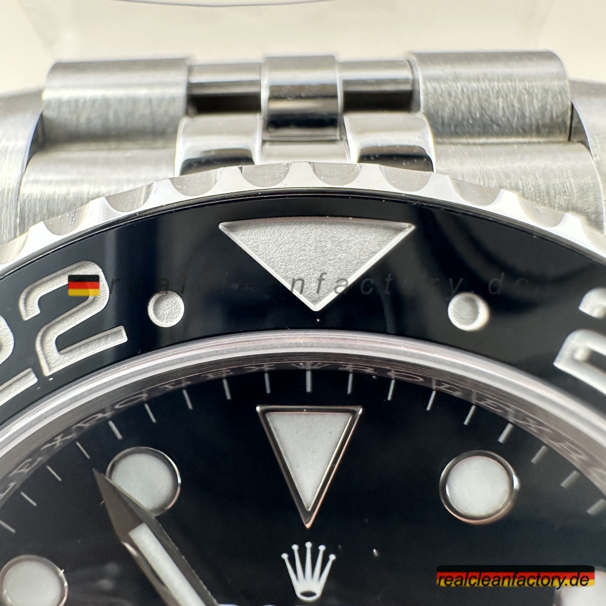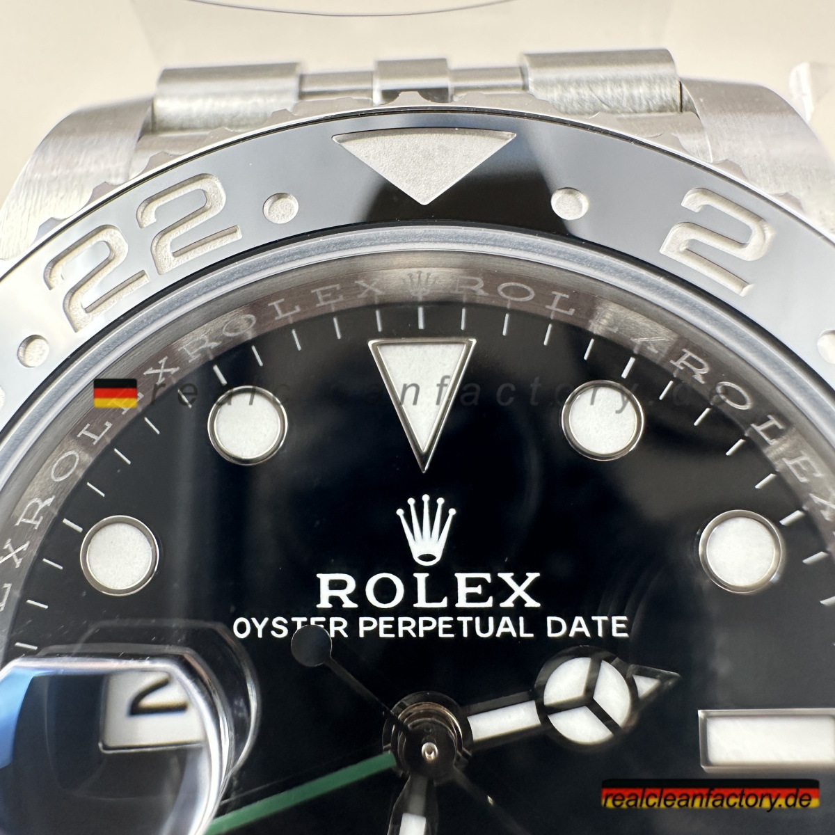 • Diese linkshändige "Sprite" GMT mit Jubilee-Armband ist Rolex' rebellischste moderne Uhr, und wir haben sie absolut perfekt umgesetzt. Als Rolex 2022 die 126720VTNR vorstellte, war jeder schockiert - nicht nur wegen der umwerfenden schwarz-grünen Lünettenkombination, sondern weil sie das gesamte Gehäuse umgedreht und die Krone auf die linke Seite gesetzt haben. Es ist die Uhr, mit der niemand gerechnet hat, und Clean Factory hat jedes einzelne Detail erfasst, das dieses Stück besonders macht.