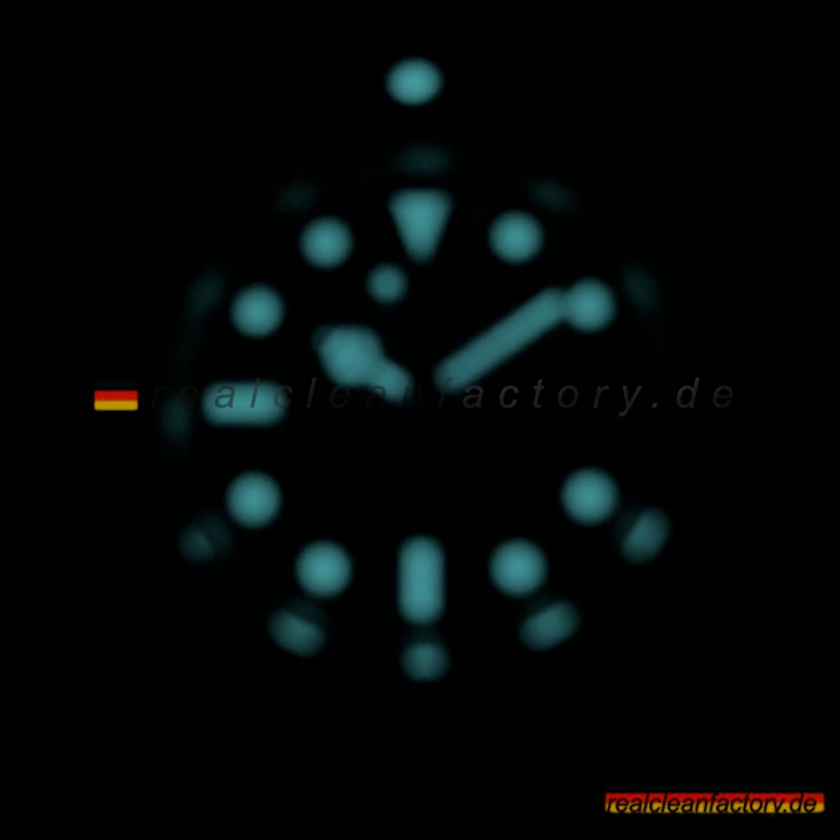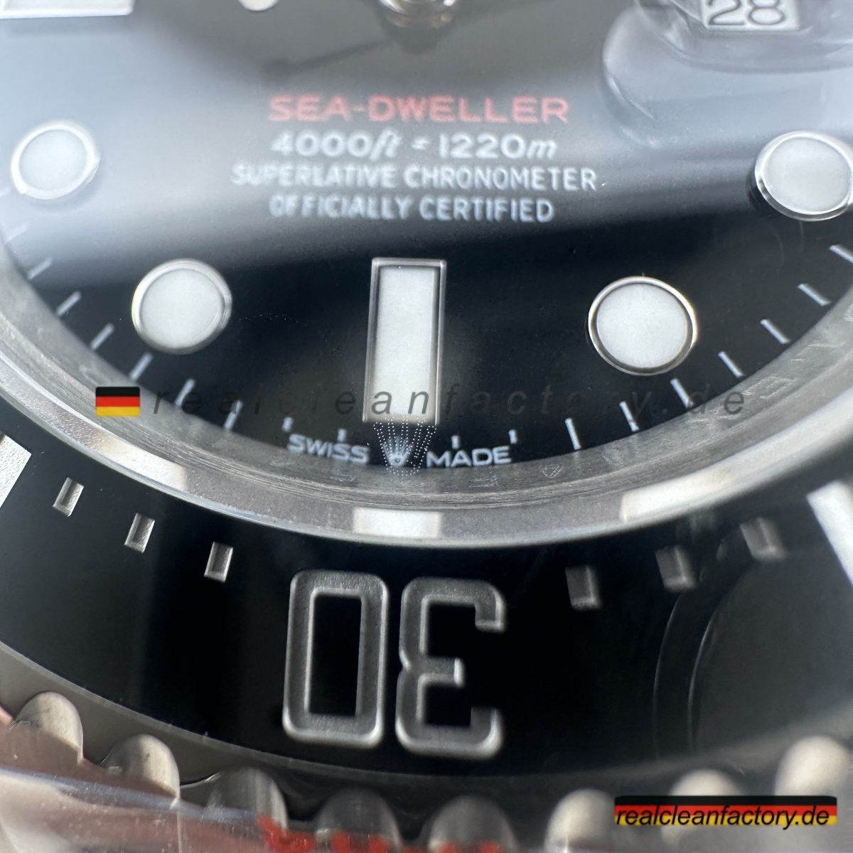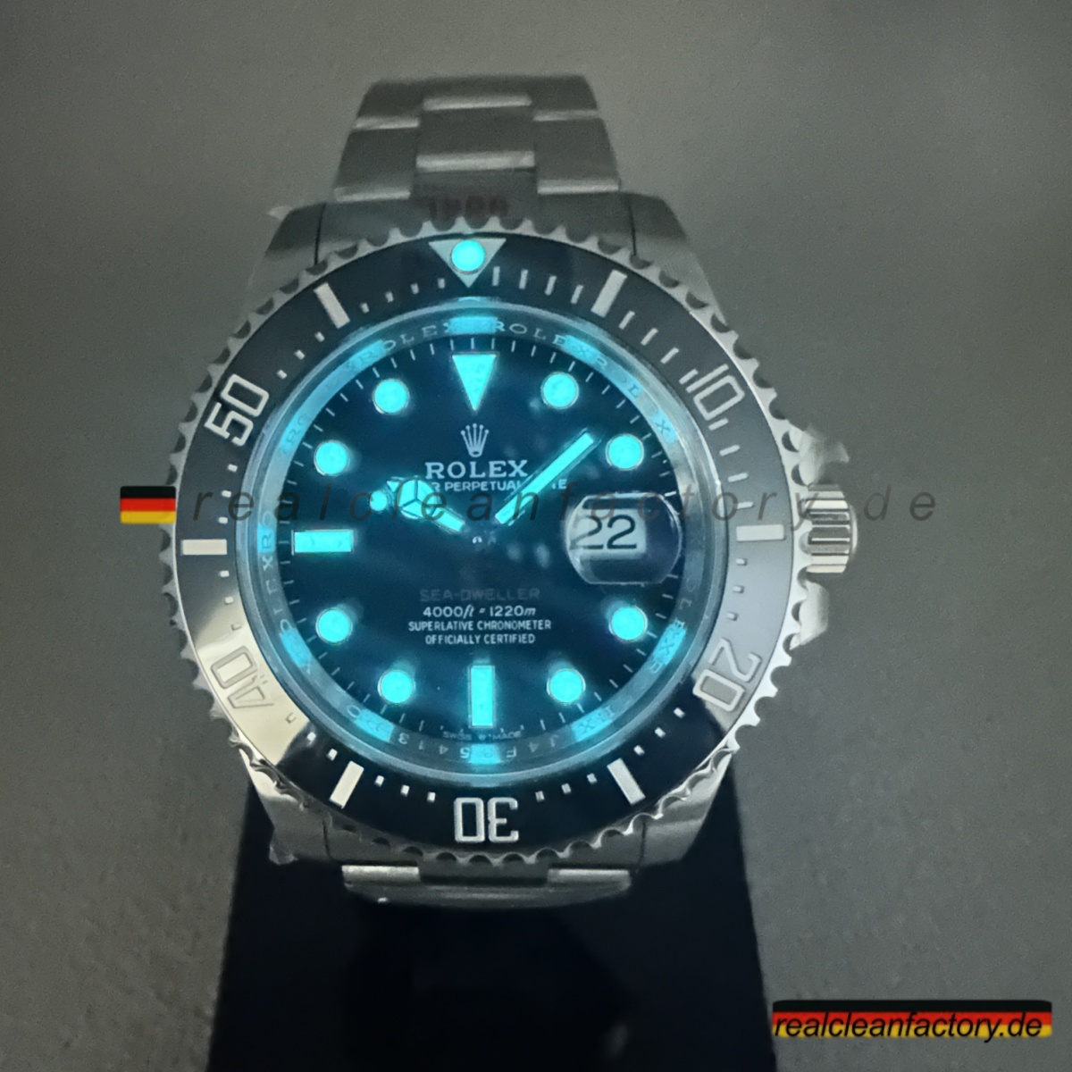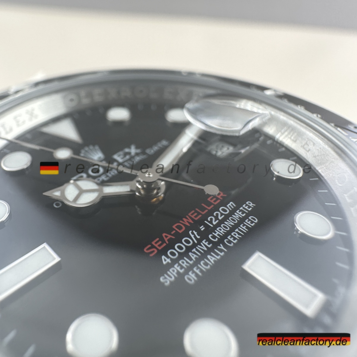 - Hier wird die Überlegenheit von Clean Factory unübersehbar – beim Druck des Zifferblatts. Mit echter Schweizer Ölfarbe und Präzisions-Tampondruck stimmen alle Buchstabenformen exakt mit dem Original überein. Schauen Sie sich das „SEA-DWELLER“ genau an: die geschwungene Linie des „S“, die Stärke des „D“, selbst die winzigen Serifen – alles perfekt repliziert. Die meisten Hersteller verwenden billigen Siebdruck, der dicke, unscharfe Buchstaben erzeugt. Clean Factory hat in Schweizer Drucktechnik investiert, um Buchstaben zu schaffen, die vom Original nicht zu unterscheiden sind. Diese Präzision trennt echte Super Clones von einfachen Imitationen.