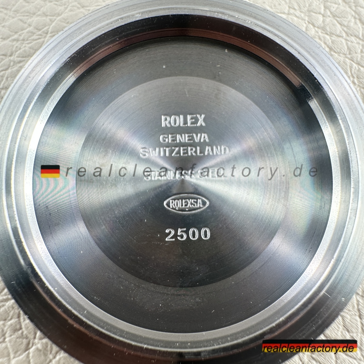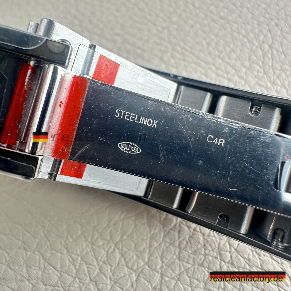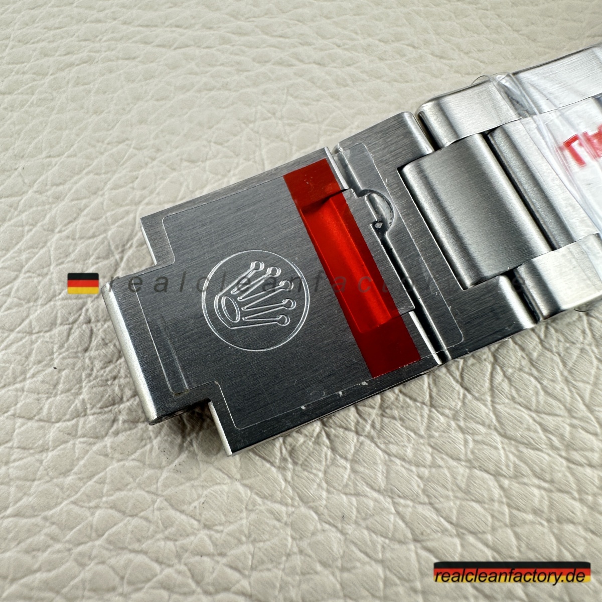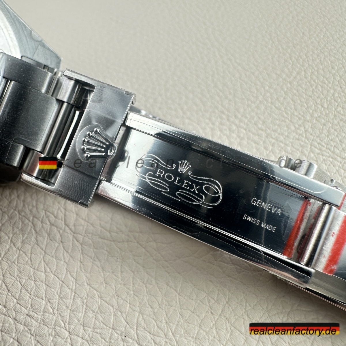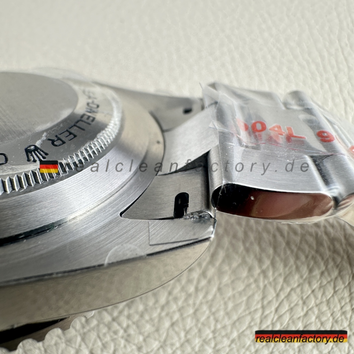 - Die Zyklop-Lupe über dem Datum zeigt ein weiteres Detail, bei dem Präzision zählt. Clean Factory erreicht exakt die 2,5-fache Vergrößerung mit perfekter Entspiegelung. Die Schrift auf dem Datumsring? Ein identisches Match zum Original, gedruckt mit denselben Schweizer Techniken. Sogar die Farbe der Datumsscheibe stimmt bis ins Detail – nicht reinweiß, nicht grau, sondern dieses typische, leicht warme Off-White von Rolex.
