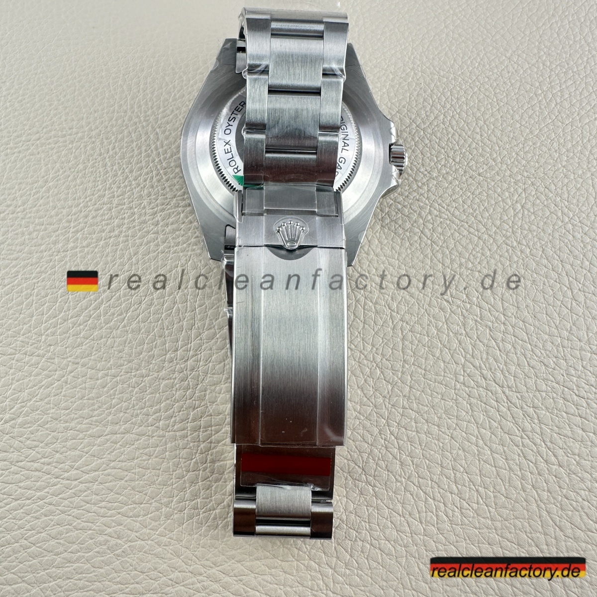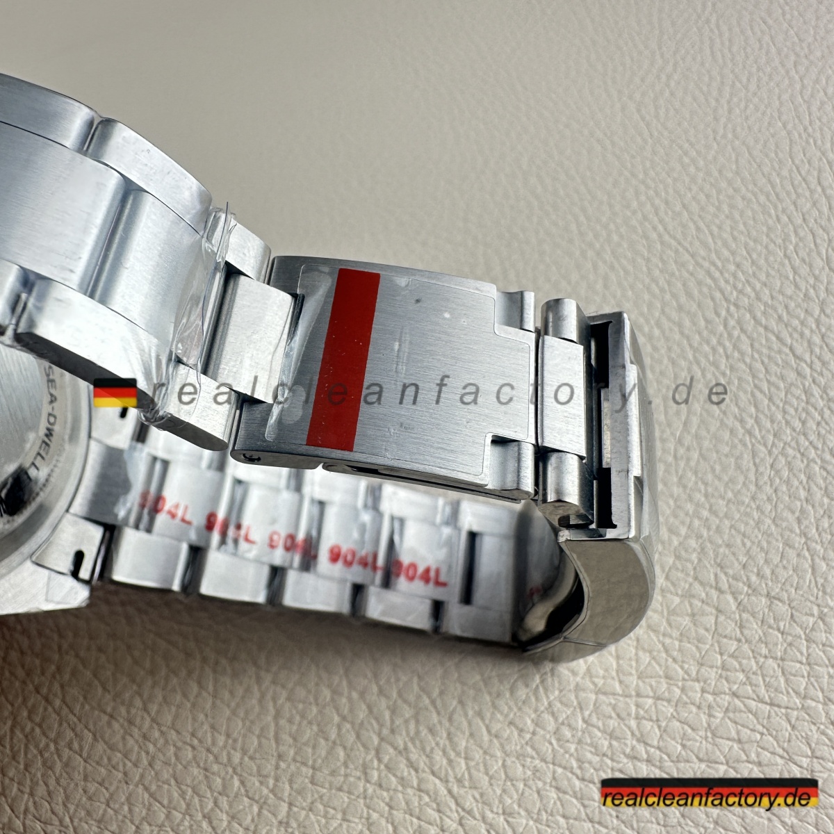 - Der rote Schriftzug verändert den gesamten Charakter dieser Sea-Dweller. Auf dem tiefschwarzen Zifferblatt erzeugt die einzelne rote Linie sofort Wiedererkennung und eine Verbindung zur Rolex-Historie. Clean Factory hat Monate damit verbracht, exakt diesen Farbton zu perfektionieren – nicht zu leuchtend wie ein Stoppschild, nicht zu dunkel wie getrocknetes Blut. Es ist genau dieses perfekte Rolex-Rot, dem Vintage-Sammler seit Jahrzehnten nachjagen, jetzt umgesetzt auf einer zeitgemäßen Uhr.