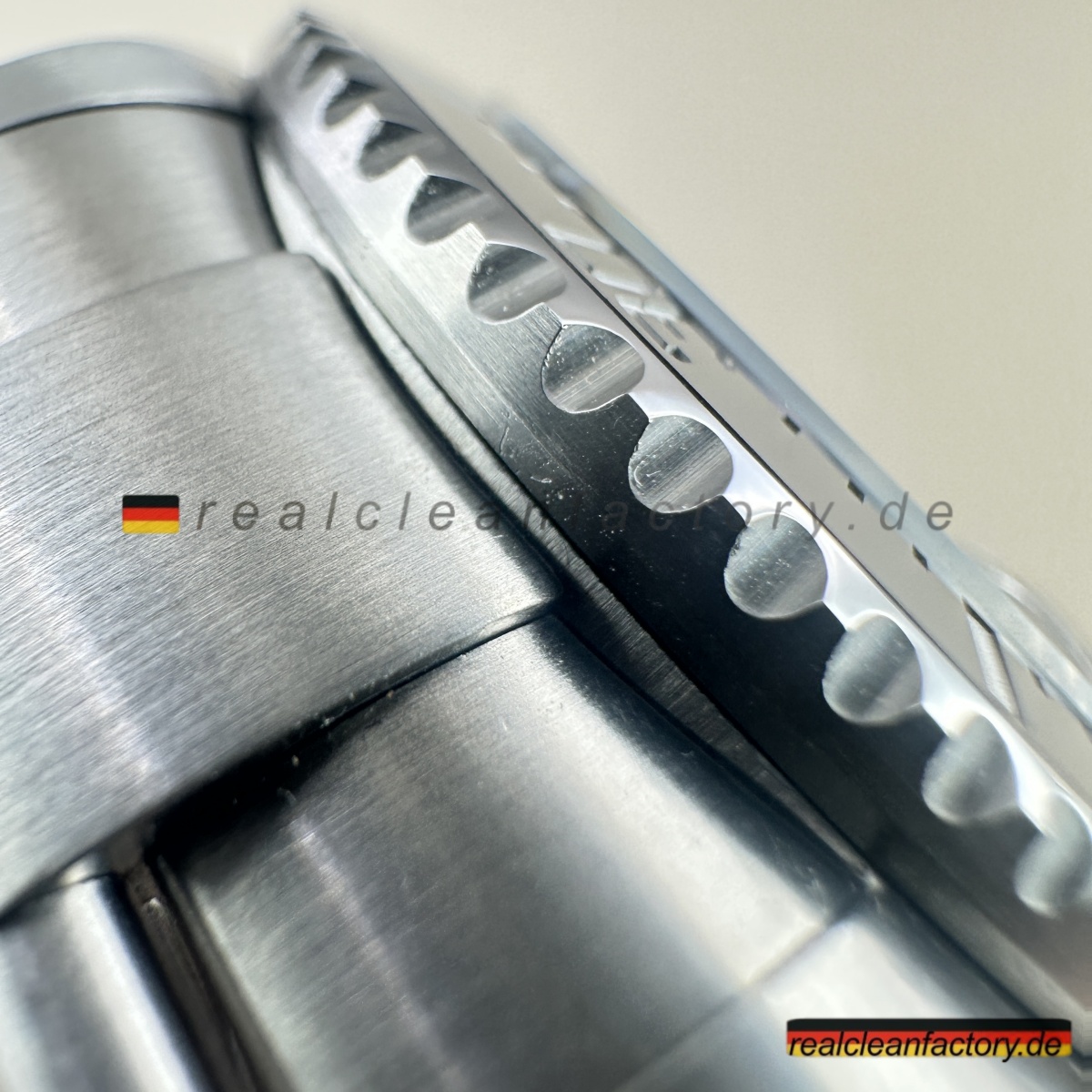 - Die Keramiklünette repräsentiert modernste Tauchuhren-Technologie. Die tiefschwarze Cerachrom-Einlage bleicht nicht aus, verkratzt nicht und enttäuscht nicht. Die platinverfüllten Ziffern sind messerscharf und perfekt ausgerichtet. Wer genau hinschaut, erkennt: Die Schriftstärke, die Gravurtiefe, das Dreieck bei 12 Uhr – jedes Detail entspricht exakt den Original-Spezifikationen.