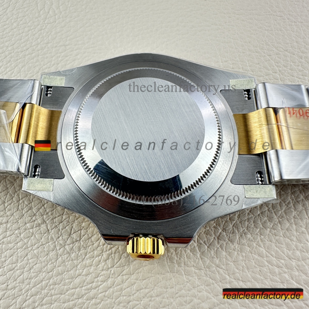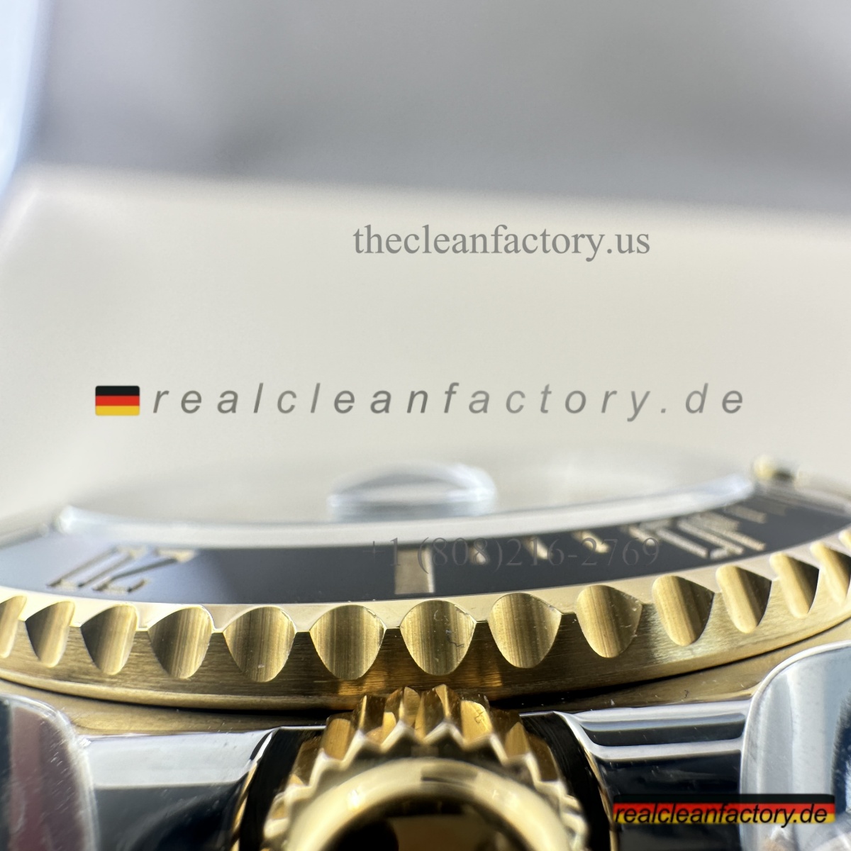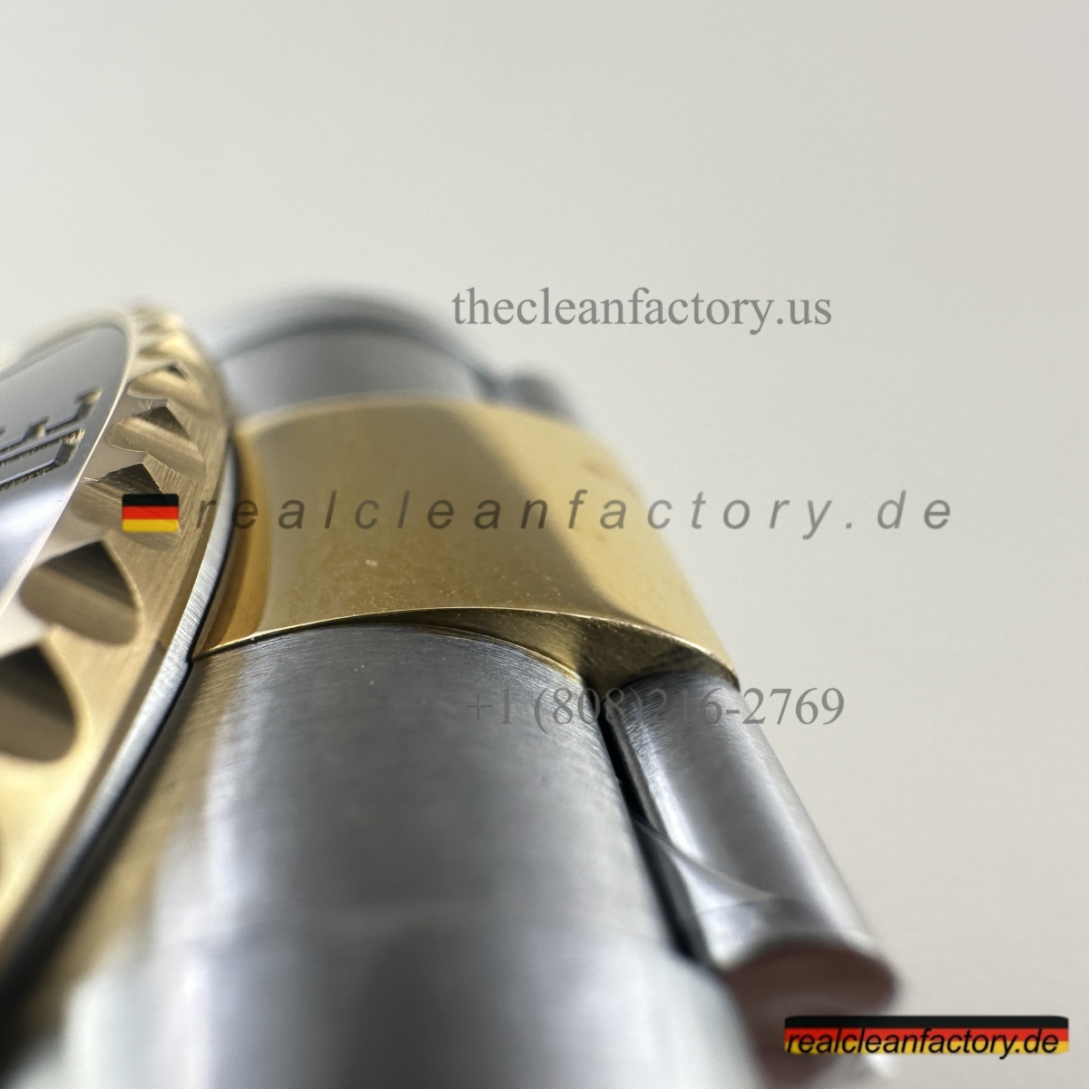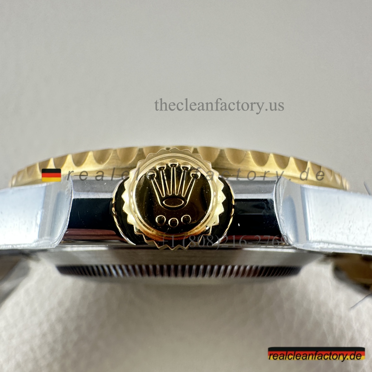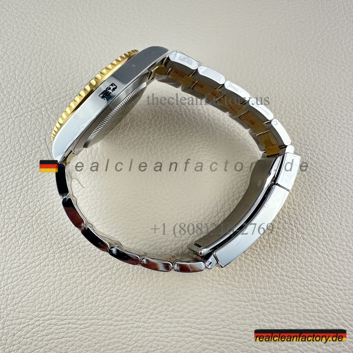 • Was unser Bicolor-Modell auszeichnet, ist unser Gold. Kein billiger, gelblicher Messingfarbton - wir verwenden einen speziellen Prozess mit PVD-Beschichtung als Basis und darüber eine echte 18K-Goldummantelung. Das Ergebnis? Gold, das exakt wie das von Rolex aussieht, aber nicht verblasst oder bei Abnutzung die Farbe ändert.