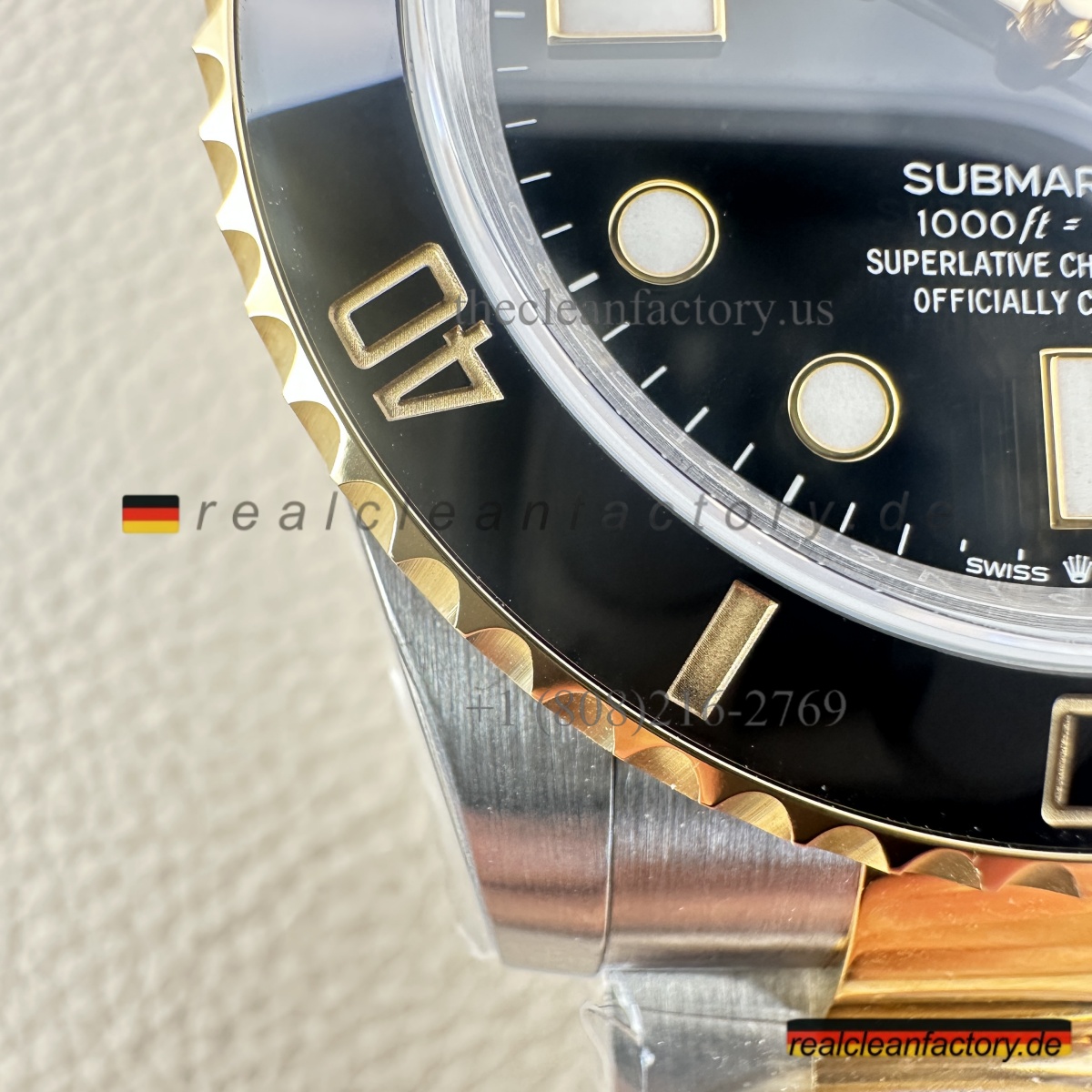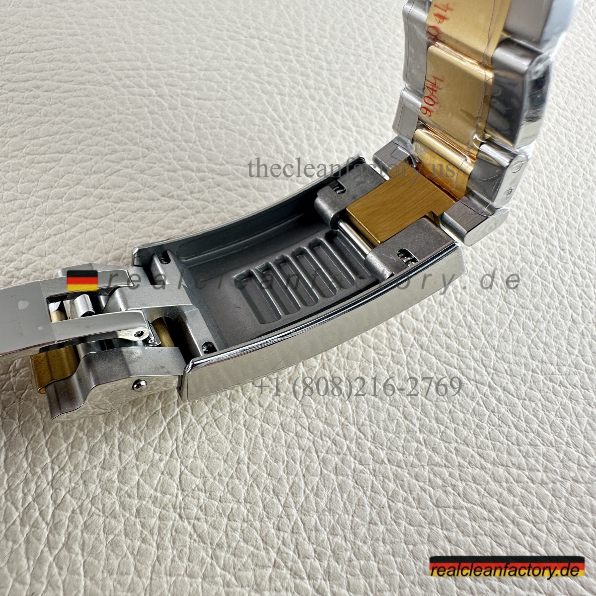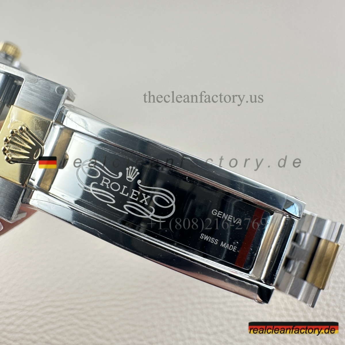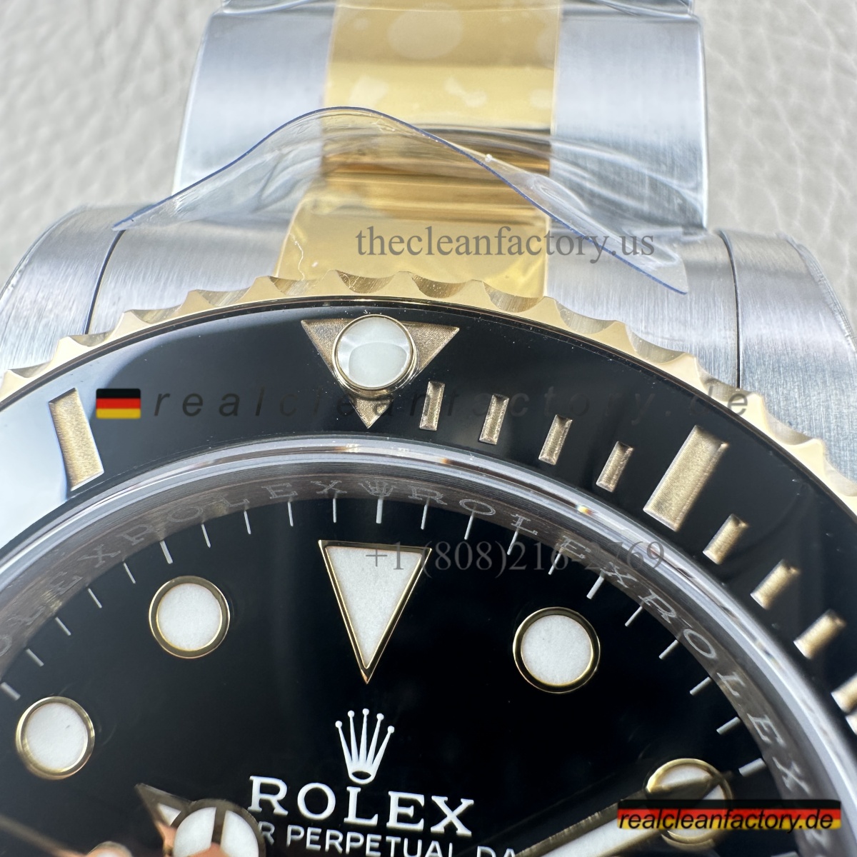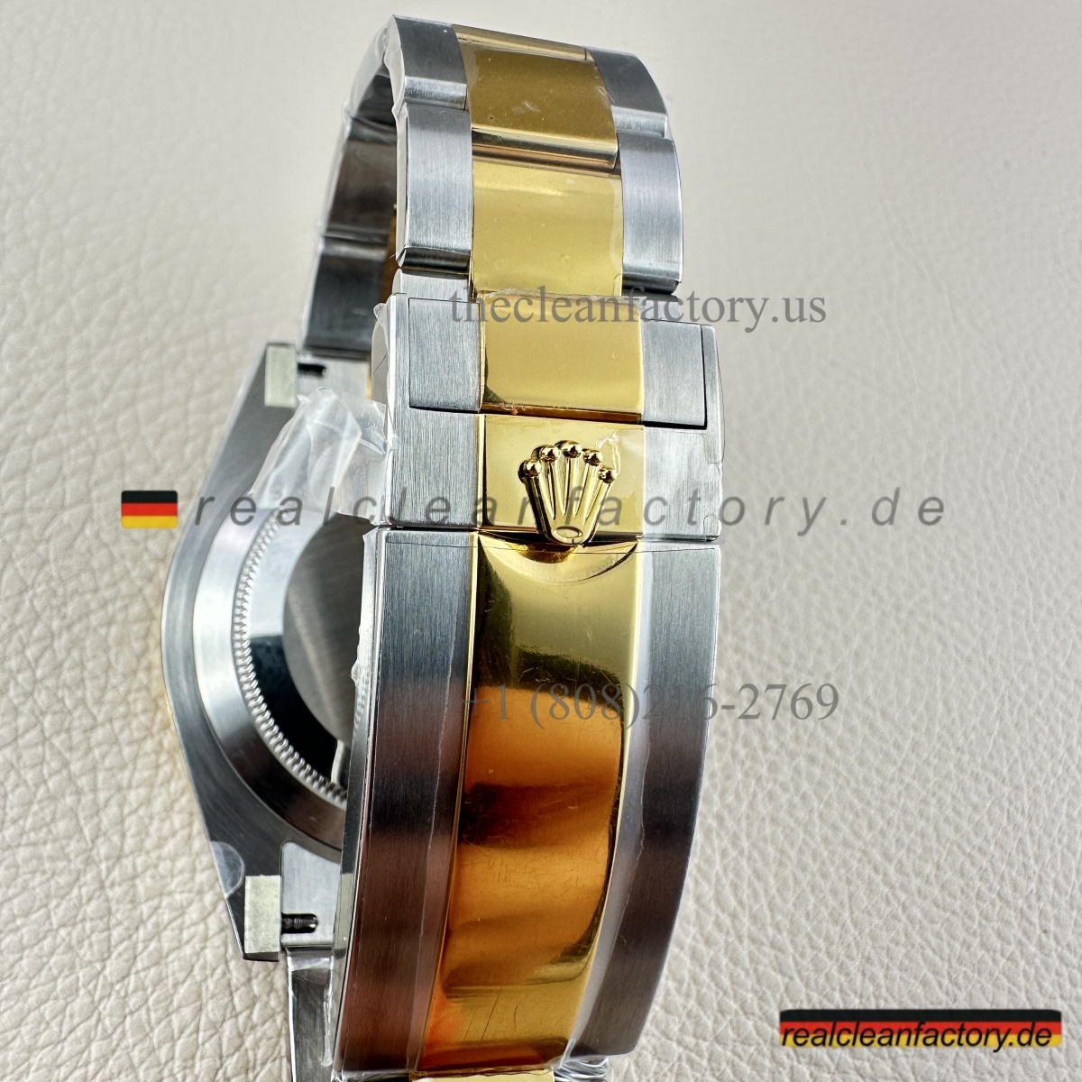 • Was unser Bicolor-Modell auszeichnet, ist unser Gold. Kein billiger, gelblicher Messingfarbton - wir verwenden einen speziellen Prozess mit PVD-Beschichtung als Basis und darüber eine echte 18K-Goldummantelung. Das Ergebnis? Gold, das exakt wie das von Rolex aussieht, aber nicht verblasst oder bei Abnutzung die Farbe ändert.