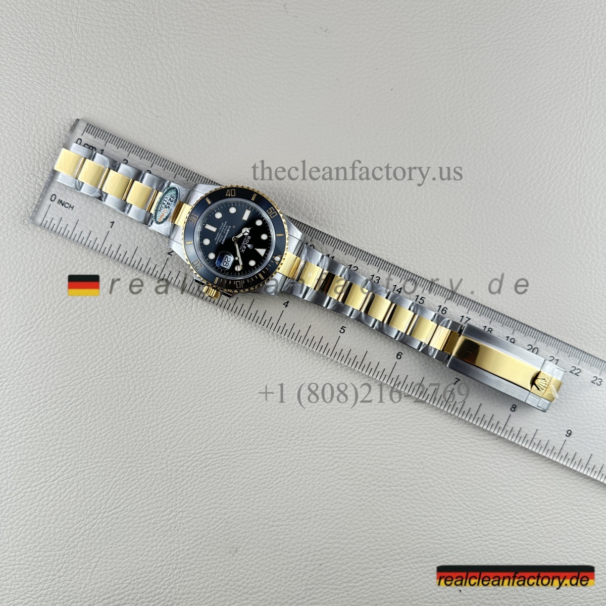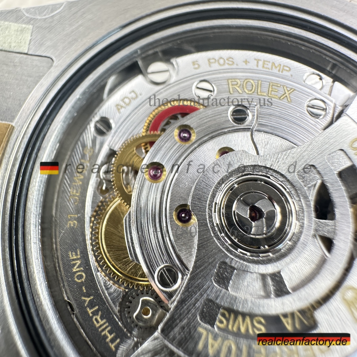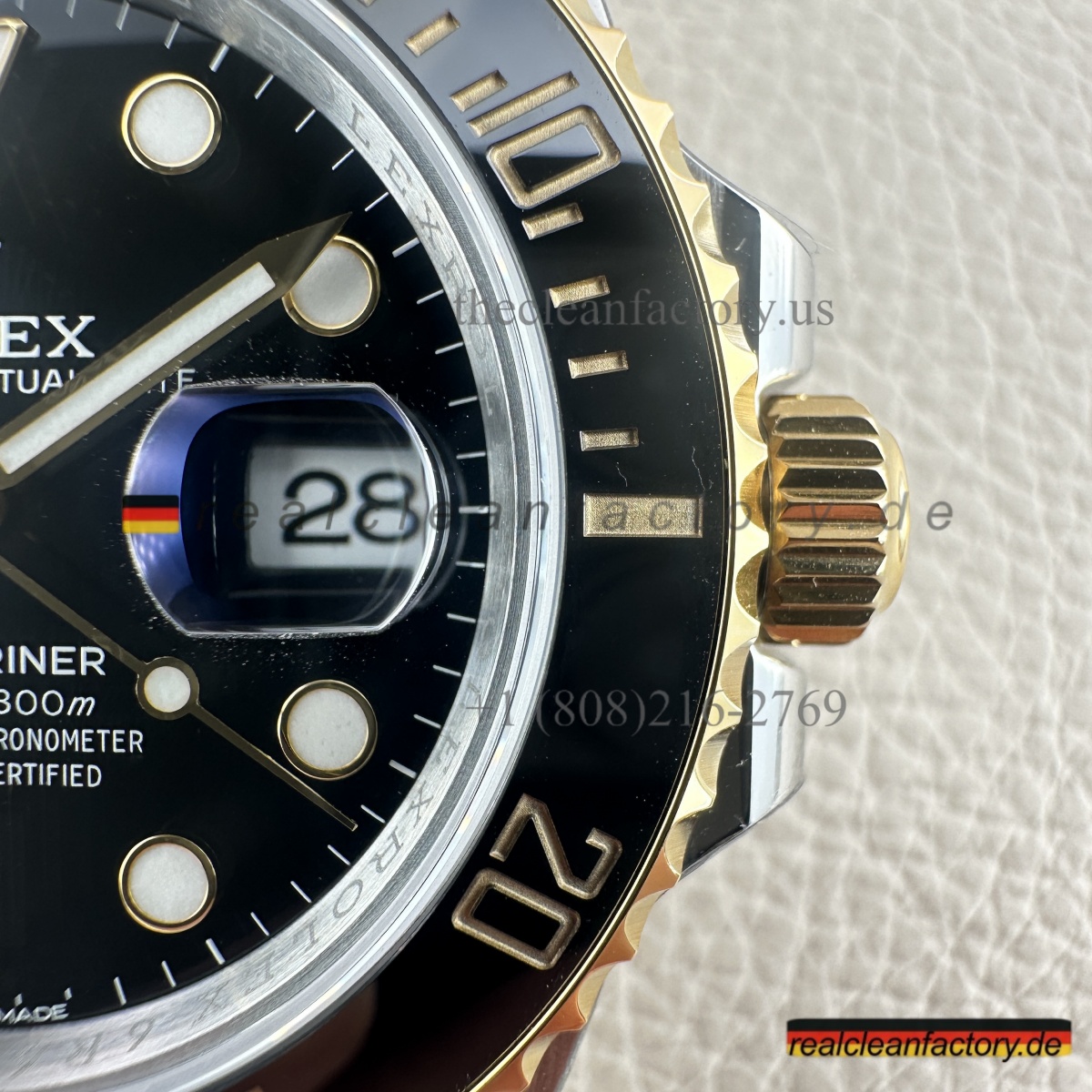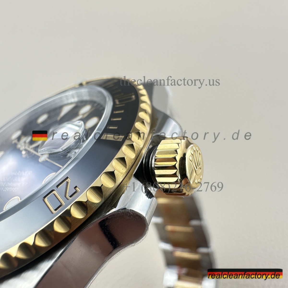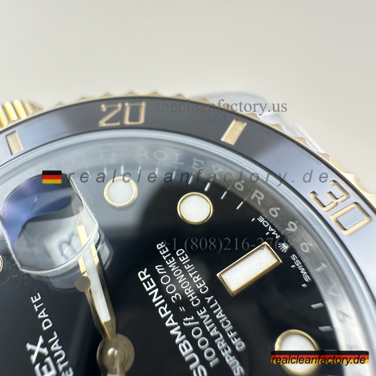 • Was unser Bicolor-Modell auszeichnet, ist unser Gold. Kein billiger, gelblicher Messingfarbton - wir verwenden einen speziellen Prozess mit PVD-Beschichtung als Basis und darüber eine echte 18K-Goldummantelung. Das Ergebnis? Gold, das exakt wie das von Rolex aussieht, aber nicht verblasst oder bei Abnutzung die Farbe ändert.