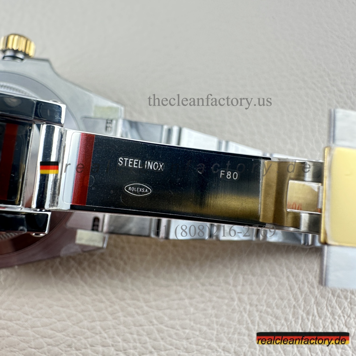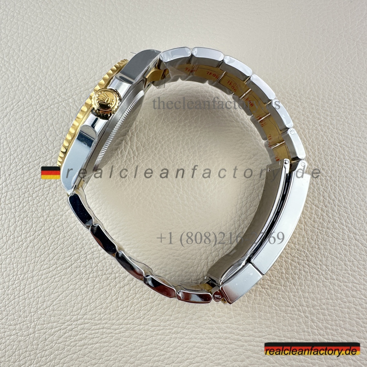 Der Kontrast zwischen gebürstetem Edelstahl und polierten Mittelgliedern in Gelbgold ist exakt wie bei Rolex. Die Oberflächen sind messerscharf voneinander getrennt, kein Übergangsfehler sichtbar.