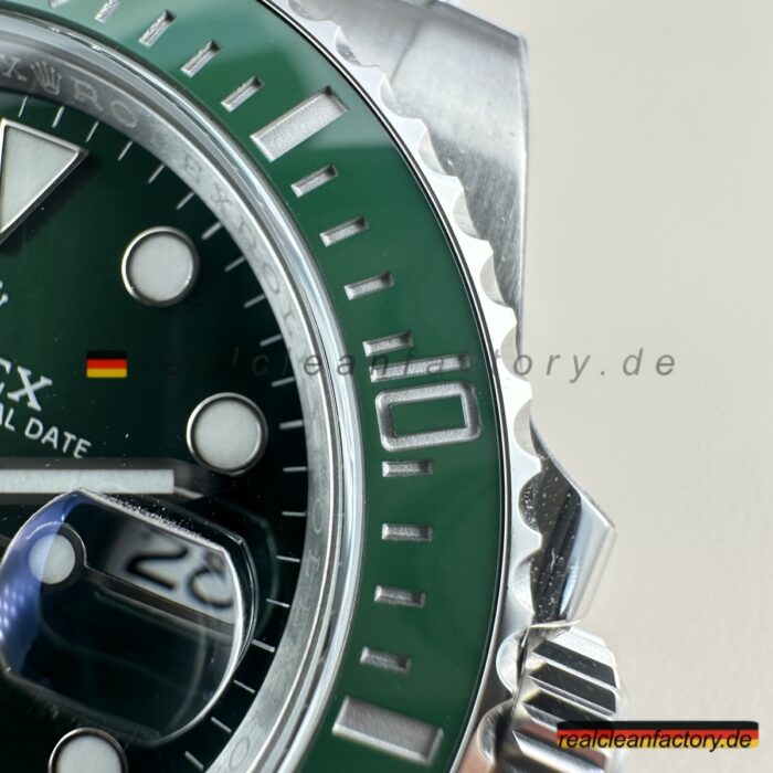 Die Keramiklünette stellt Clean Factory's größte Errungenschaft nach drei Jahren Entwicklung dar — sie löst endlich die hartnäckigste Herausforderung der Branche, nämlich den authentischen Rolex-Grünton perfekt zu treffen. Dank importierter farbstabilisierter Verbindungen behält diese Lünette ihre lebendige Charakteristik dauerhaft bei, ohne zu verblassen, im Gegensatz zu minderwertigen Versionen anderer Hersteller. Die platinbefüllten Ziffern bieten perfekte Tiefe und Definition, während die 120-Klick-unidirektionale Drehfunktion eine knackige, geschmeidige Rotation ohne jegliches Spiel liefert. Jede Drehung fühlt sich bewusst und präzise an, genau wie von Rolex beabsichtigt.