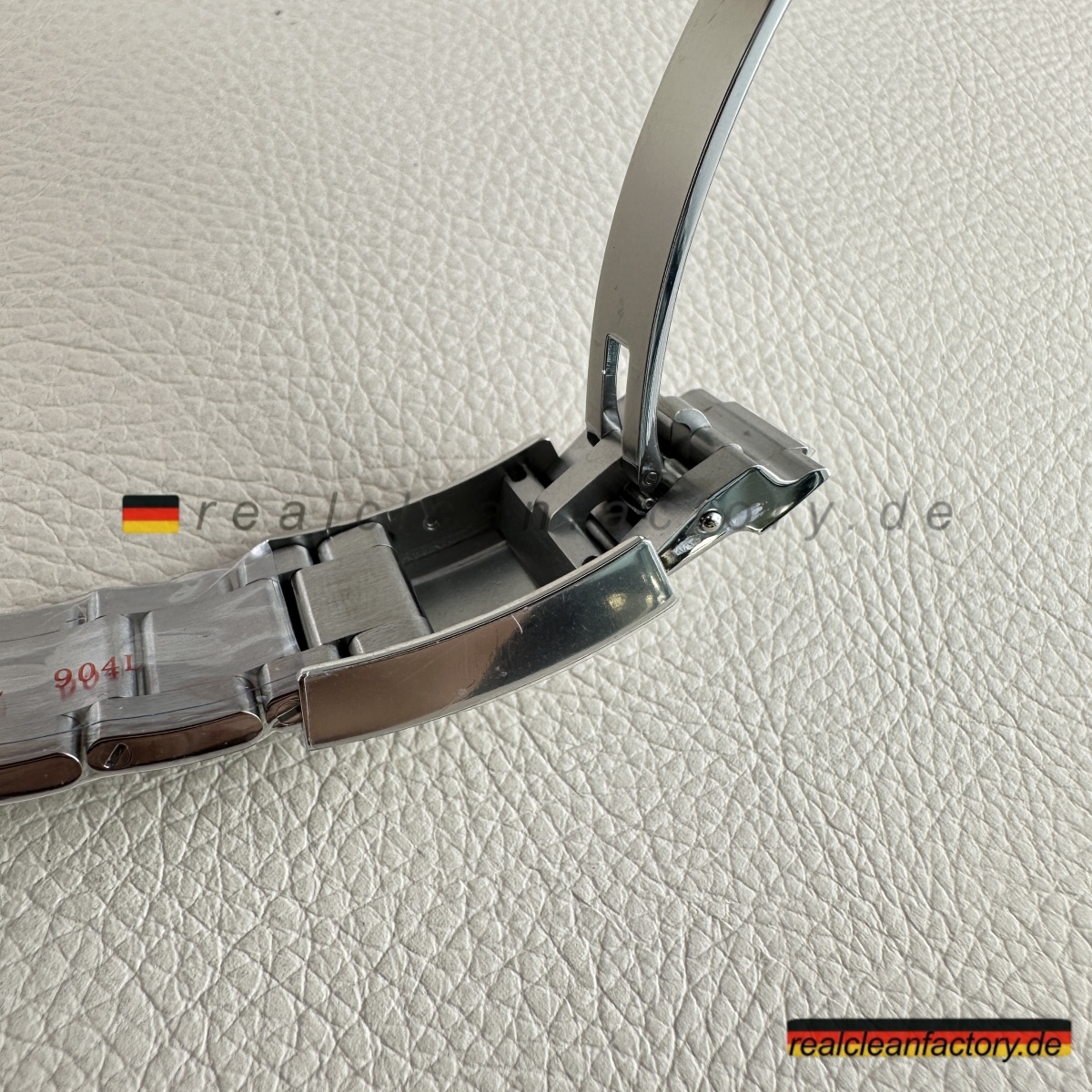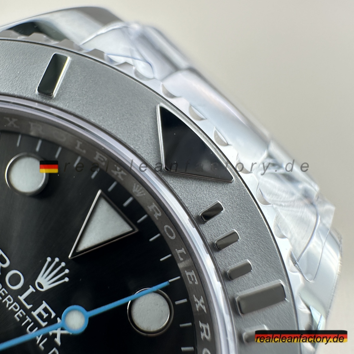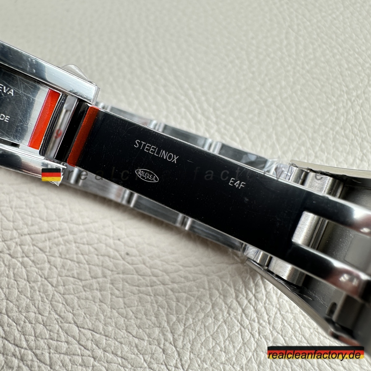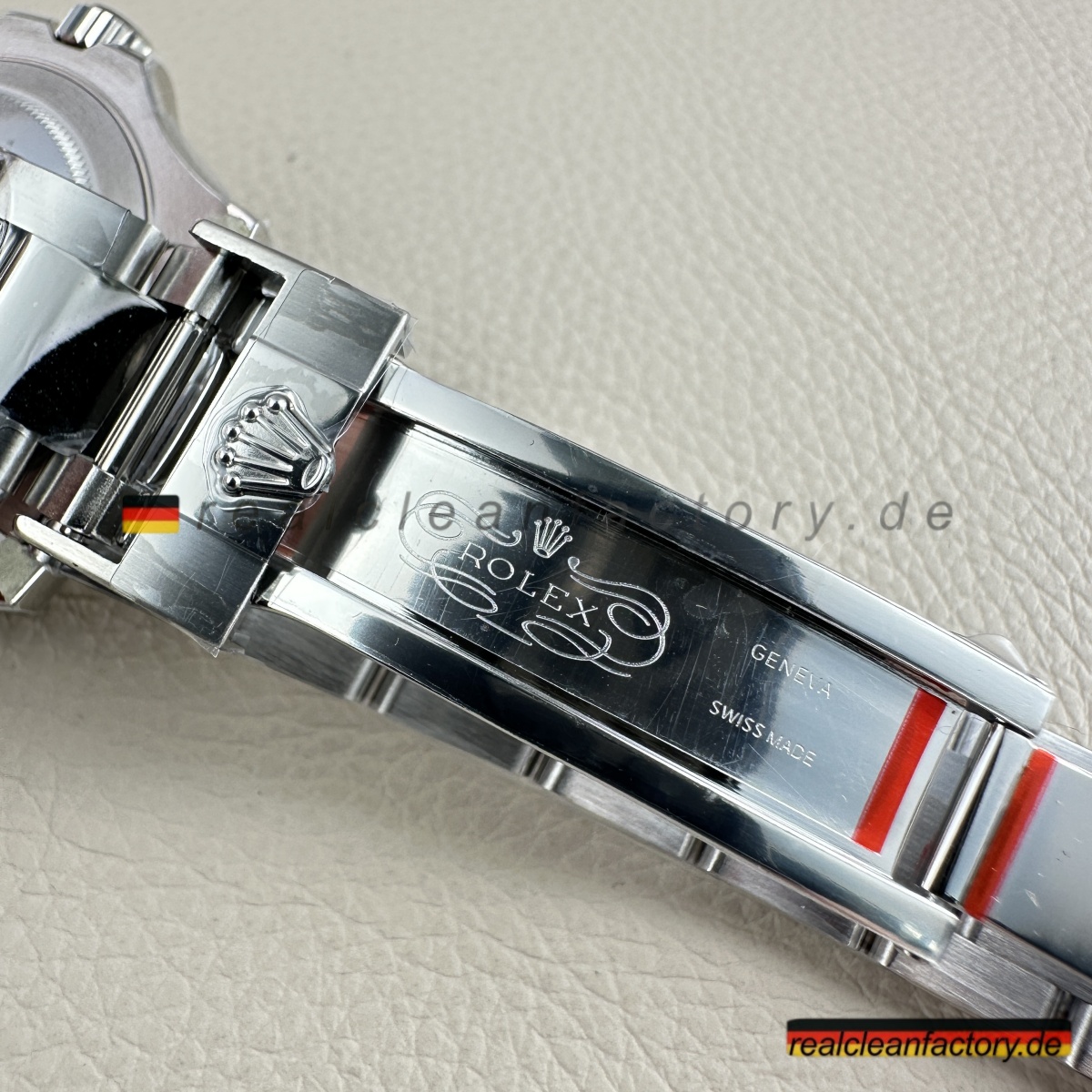 - Das **Oystersteel-Armband** ist vollständig gebürstet mit hochpolierten Mittelgliedern, die den auffälligen Kontrast erzeugen, für den Rolex bekannt ist. Jedes Glied ist massiv, mit perfekter Gelenkigkeit und dem richtigen Gewicht. Die **Oysterlock-Schließe** mit **Easylink 5mm-Komfortverlängerung** funktioniert einwandfrei und hat die gleiche sanfte Bewegung wie die echte – ohne das steife oder lockere Gefühl, das billigere Versionen oft haben.