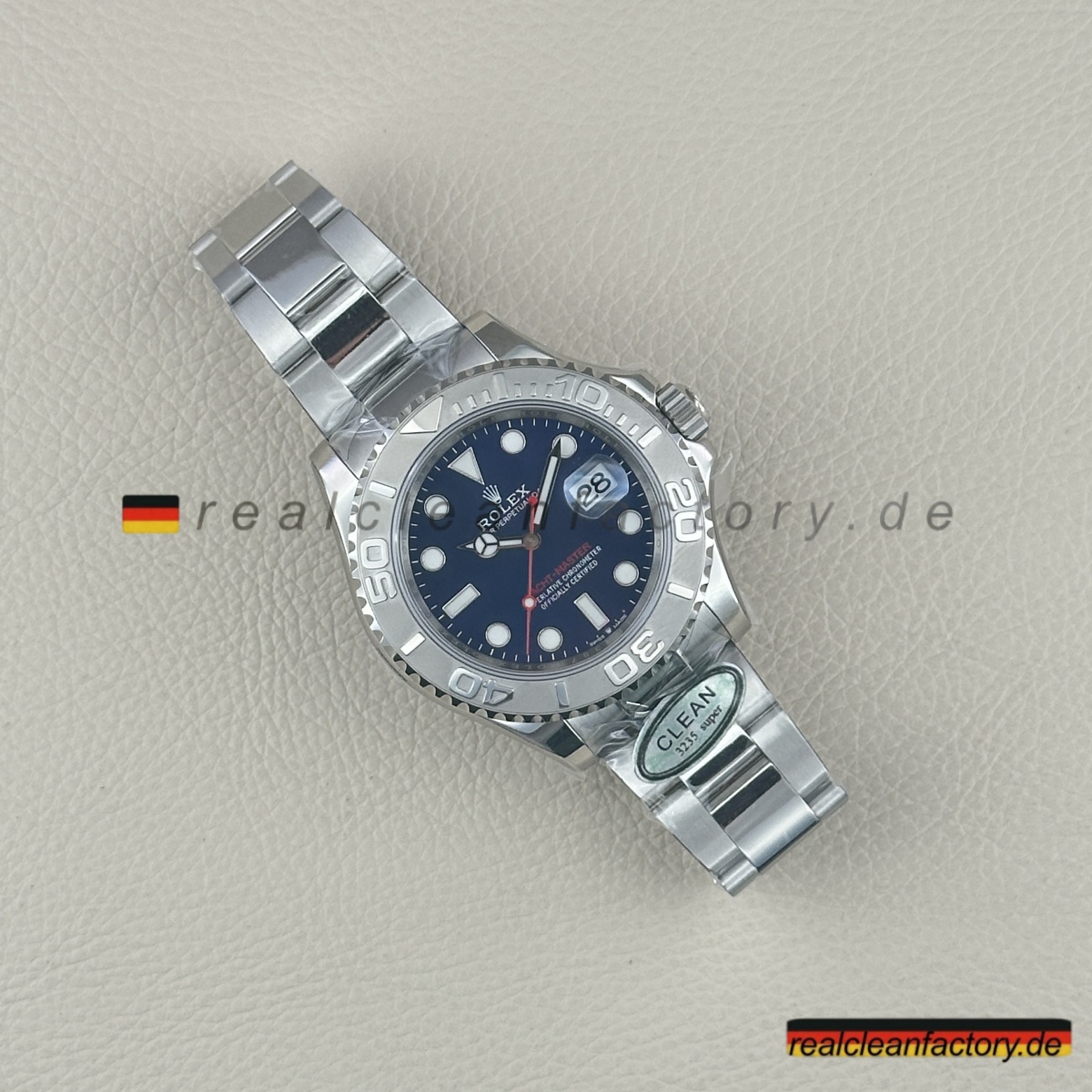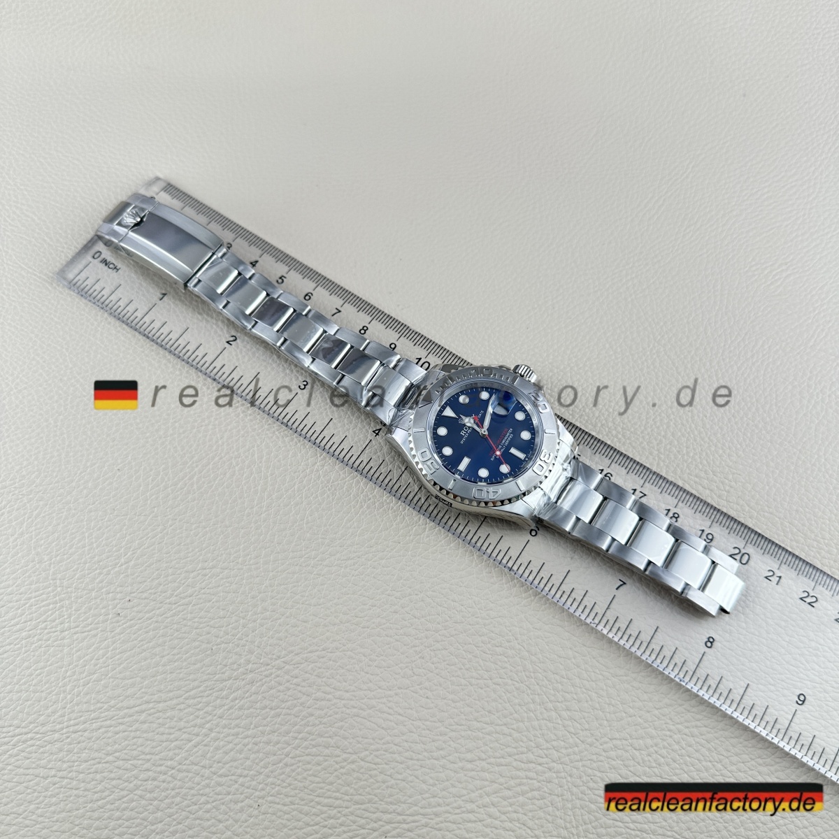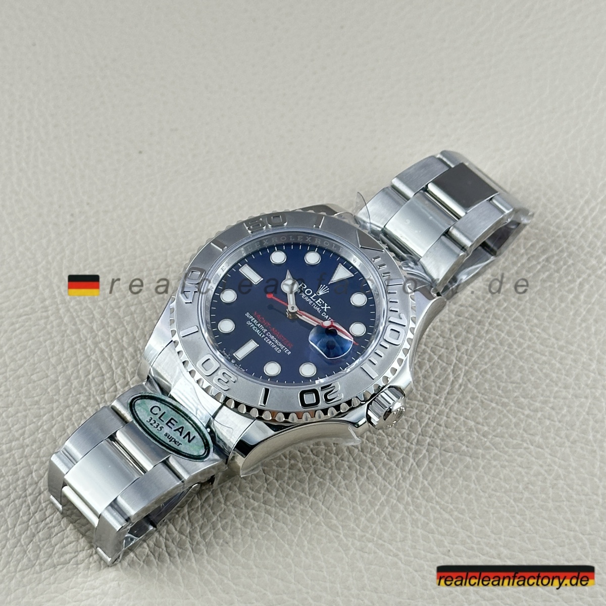 - Charakteristischer roter „Yacht-Master“ Text in exakt echtem Rolex-Farbton – nicht orangestichig rot