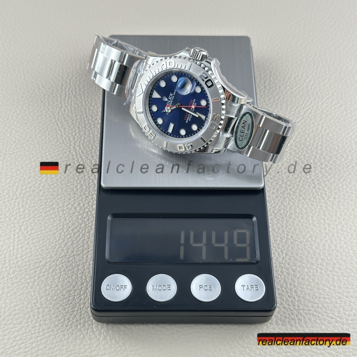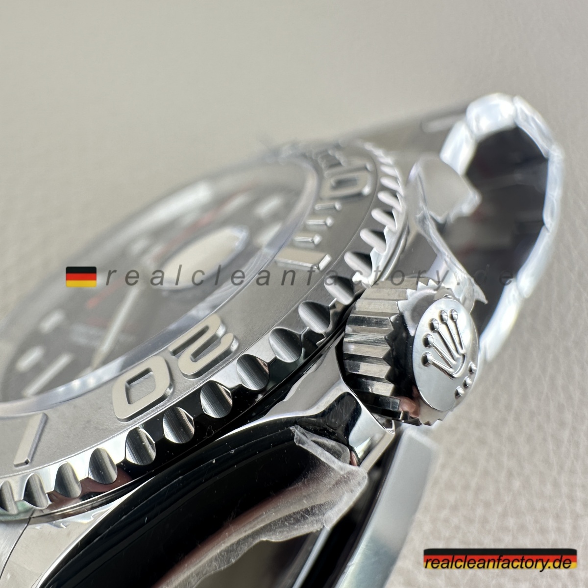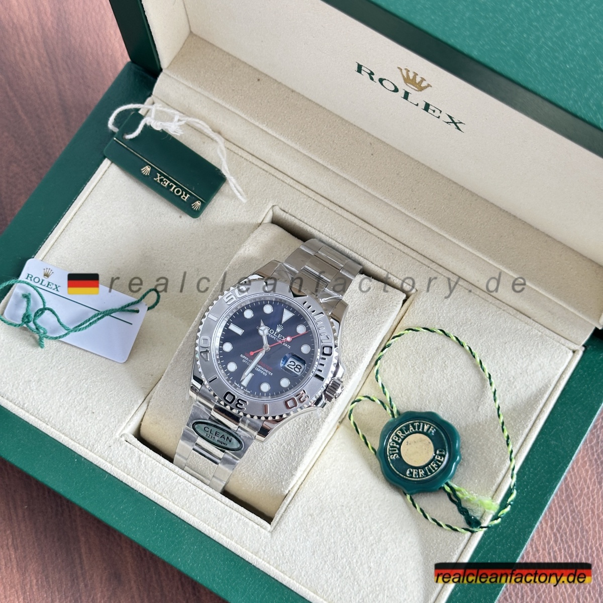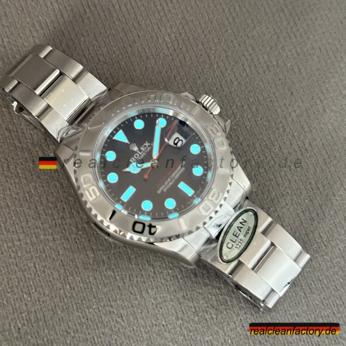 - Charakteristischer roter „Yacht-Master“ Text in exakt echtem Rolex-Farbton – nicht orangestichig rot