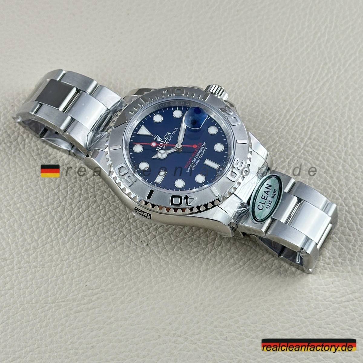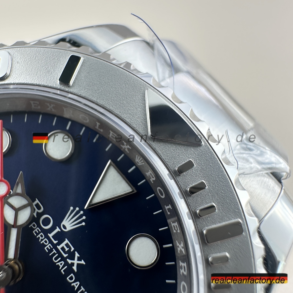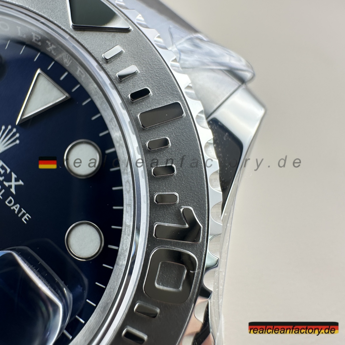 - Dieses blaue Zifferblatt ist etwas Besonderes. Es hat diesen unglaublichen Sunburst-Effekt, der je nach Licht von hellem Azurblau zu tiefem Marineblau wechselt. Die applizierten Indizes sind tadellos verarbeitet mit polierten Kanten, die das Licht aus jedem Winkel einfangen. Unser roter "Yacht-Master"-Schriftzug hat exakt denselben Farbton wie das Original - nicht dieses orangestichige Rot anderer Fabriken. Der weiße Sekundenzeiger schafft den perfekten Kontrast zum blauen Hintergrund.
