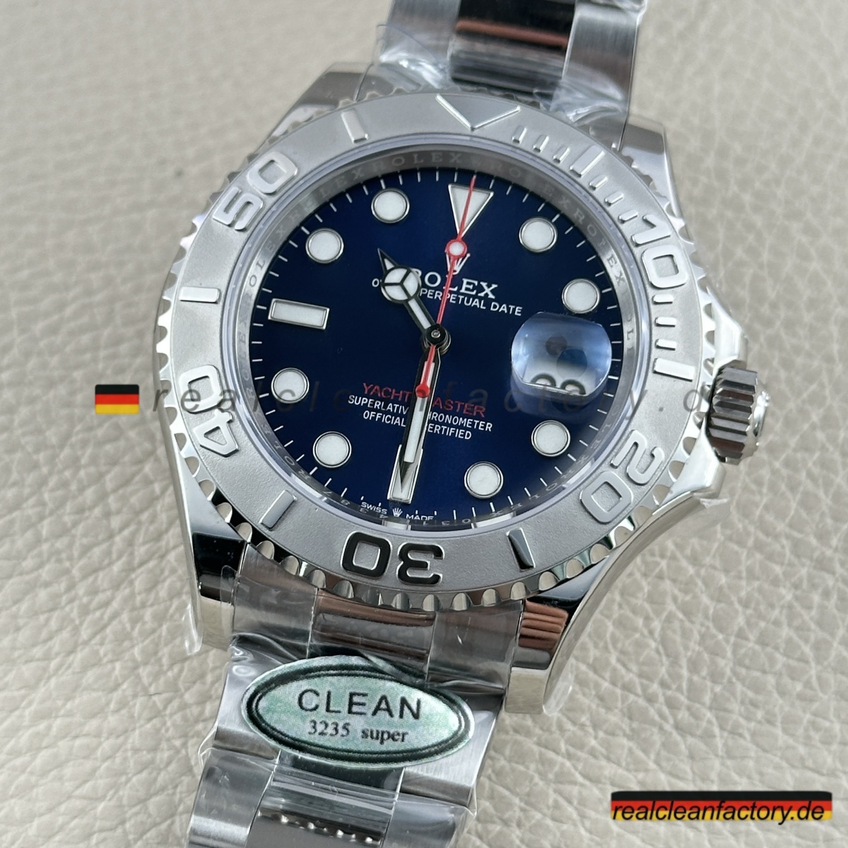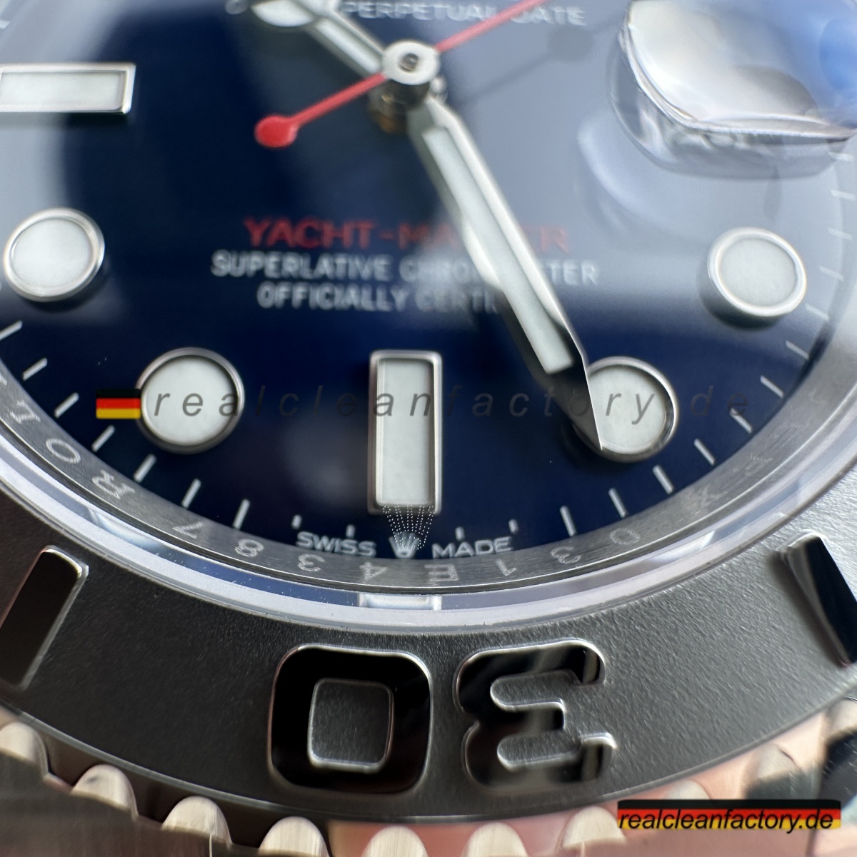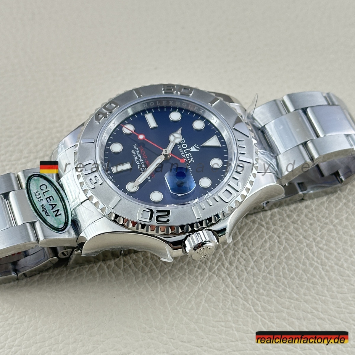 - Dieses blaue Zifferblatt ist etwas Besonderes. Es hat diesen unglaublichen Sunburst-Effekt, der je nach Licht von hellem Azurblau zu tiefem Marineblau wechselt. Die applizierten Indizes sind tadellos verarbeitet mit polierten Kanten, die das Licht aus jedem Winkel einfangen. Unser roter "Yacht-Master"-Schriftzug hat exakt denselben Farbton wie das Original - nicht dieses orangestichige Rot anderer Fabriken. Der weiße Sekundenzeiger schafft den perfekten Kontrast zum blauen Hintergrund.