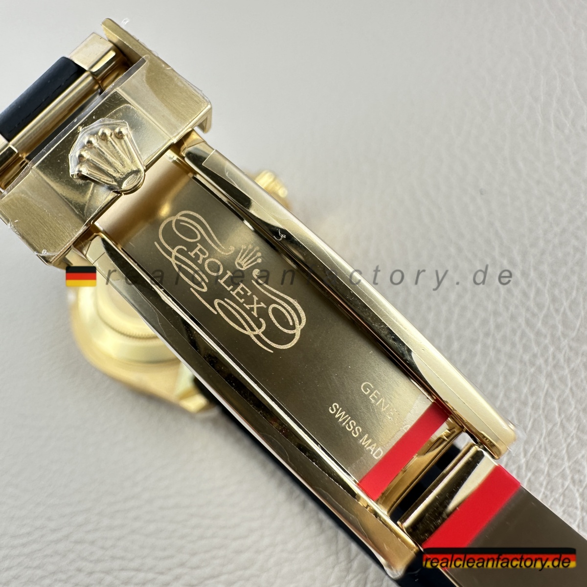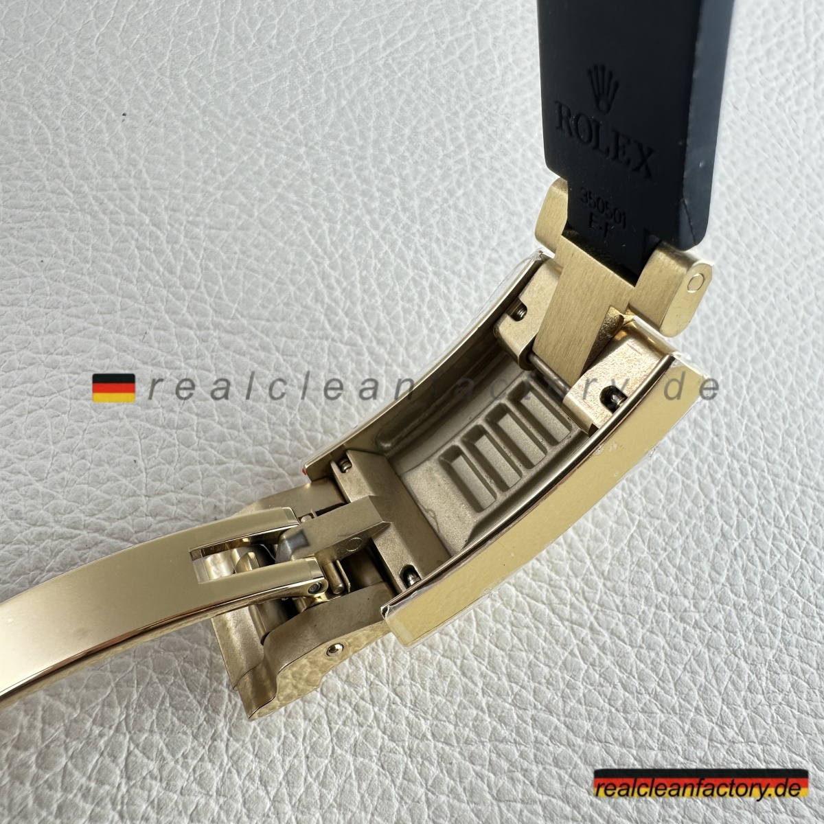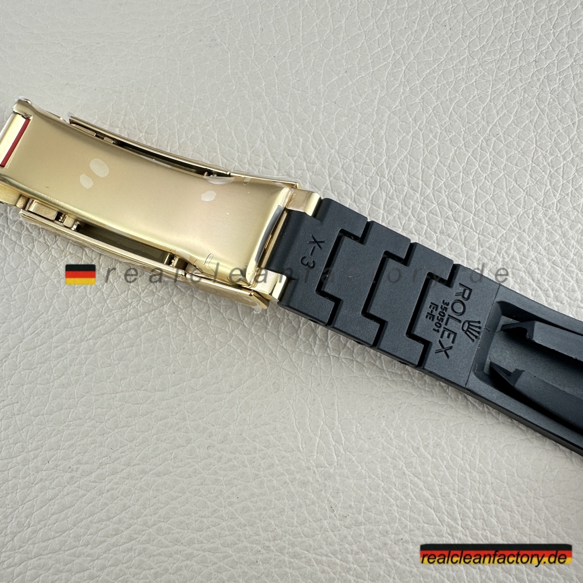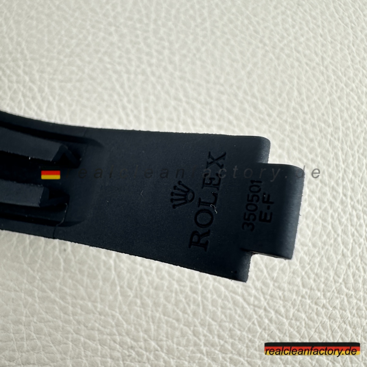 - Das Oysterflex-Armband ist wo das wirklich interessant wird. Das ist nicht normaler Gummi - es hat dieselbe flexible Metallblatt-Struktur innen wie echte Rolex, umspritzt mit Hochleistungs-Elastomer. Wir verwenden dasselbe D, E, F Größenkombinationssystem wie das Original - du mischst und kombinierst die Größen, um die perfekte Passform zu bekommen. Das Metall-Innere bietet die strukturelle Integrität, während das Gummi-Äußere flexibel und komfortabel bleibt, sogar bei verschiedenen Temperaturen.