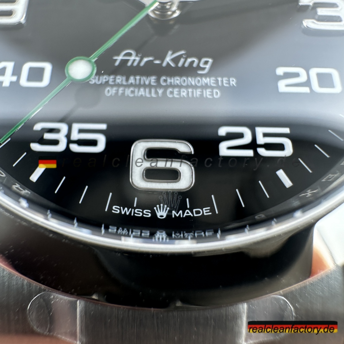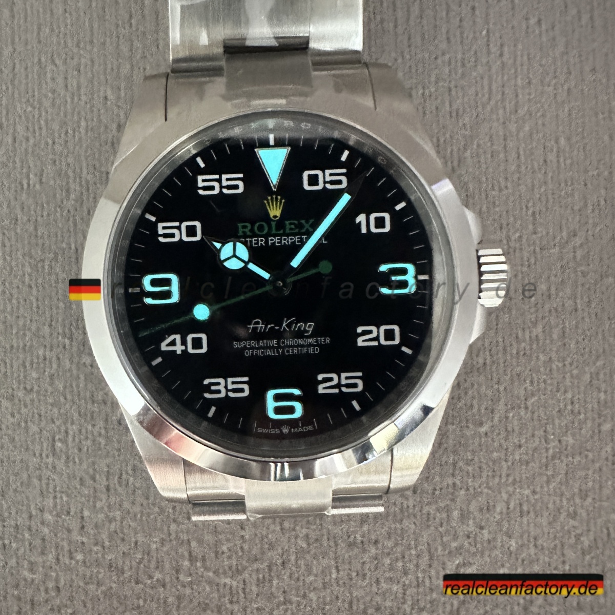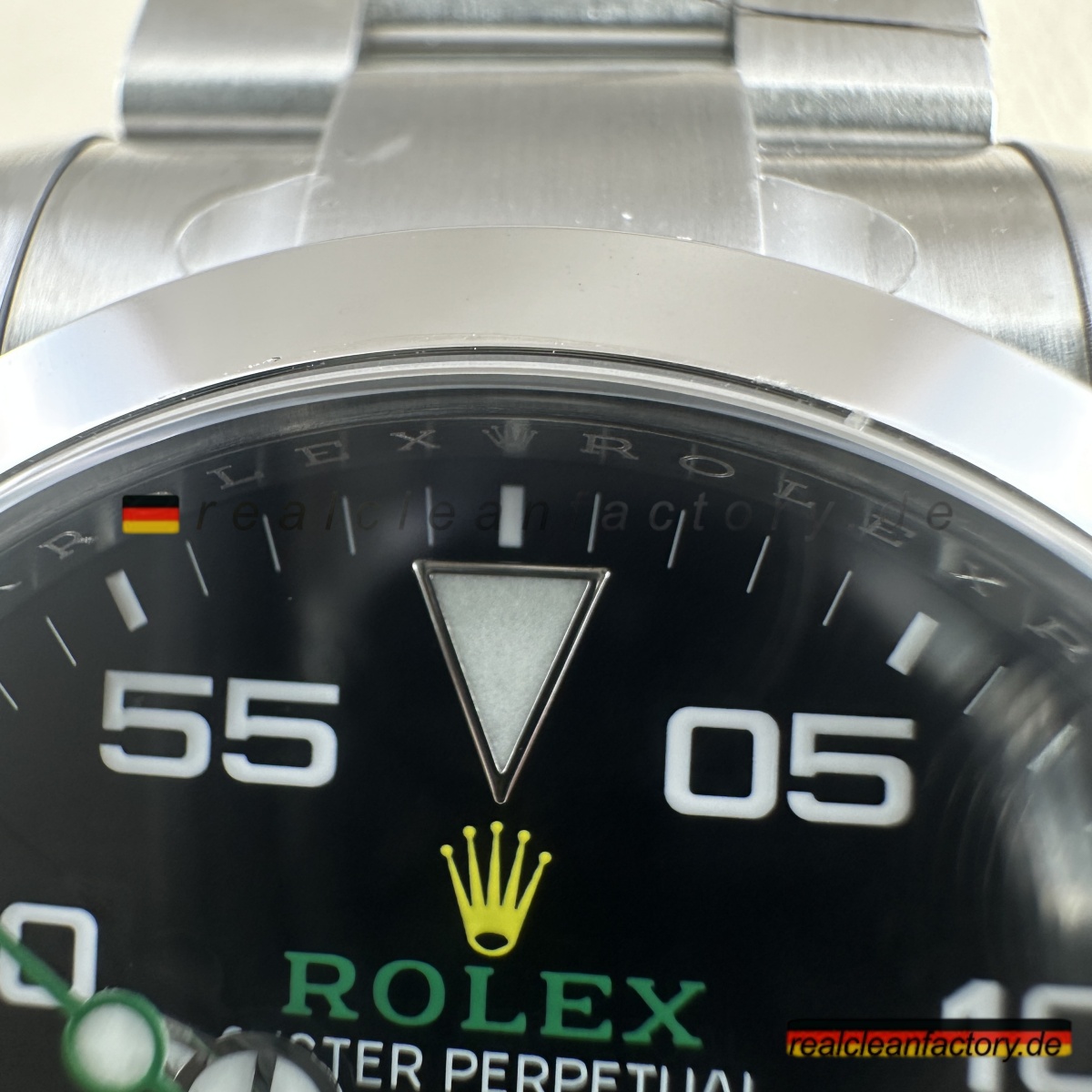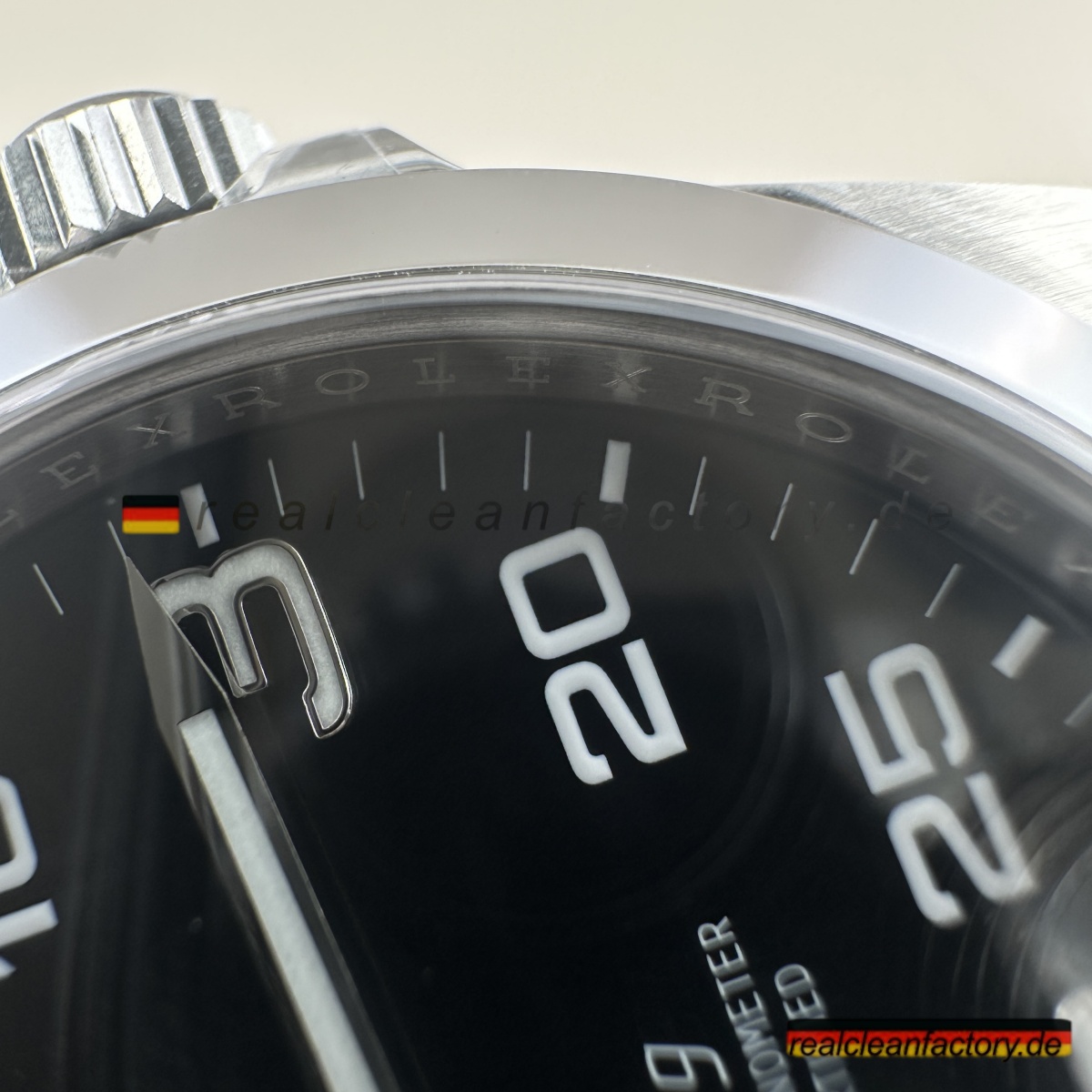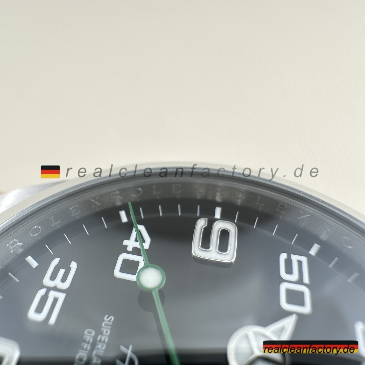 • Alright, let me tell you about our Air-King 126900-0001. Been working with these for months now and honestly, this one's really good. That green "ROLEX" lettering everyone talks about? We actually got it right. I've seen so many reps where the green is off - too bright, too dark, whatever. Ours matches.