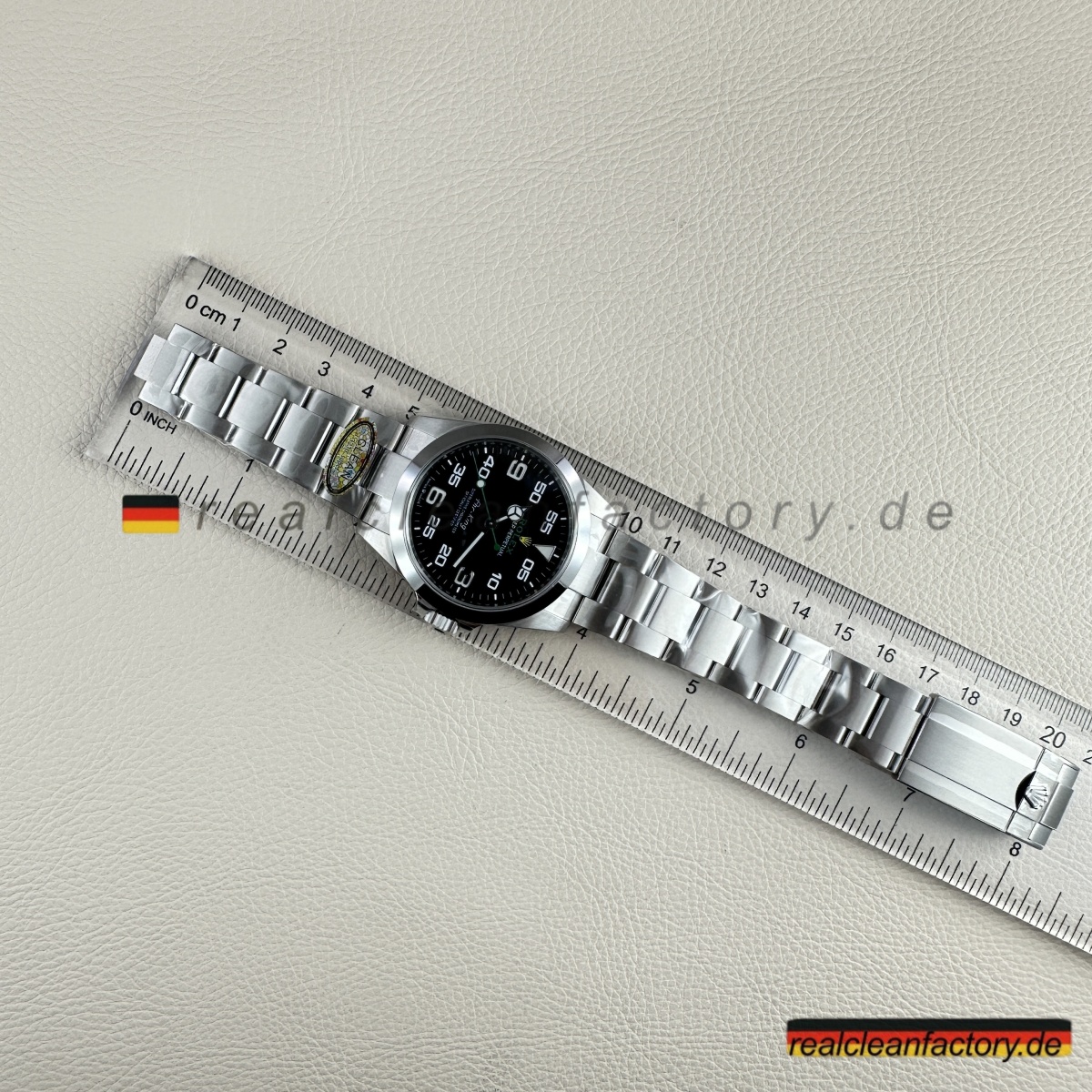 • 40mm case feels right. Not trying to be bigger than it should be. The brushed finish has that tool watch look that the Air-King is supposed to have. I wear mine sometimes and people just assume it's genuine. The green second hand sweeping around catches people's eye - that's the Air-King signature right there.