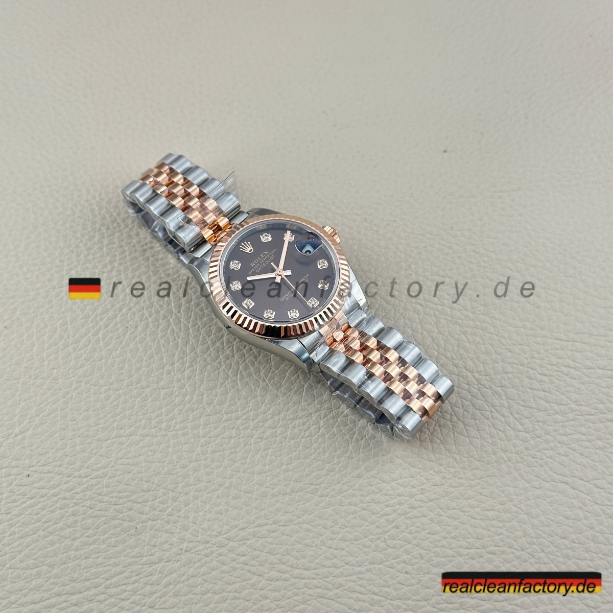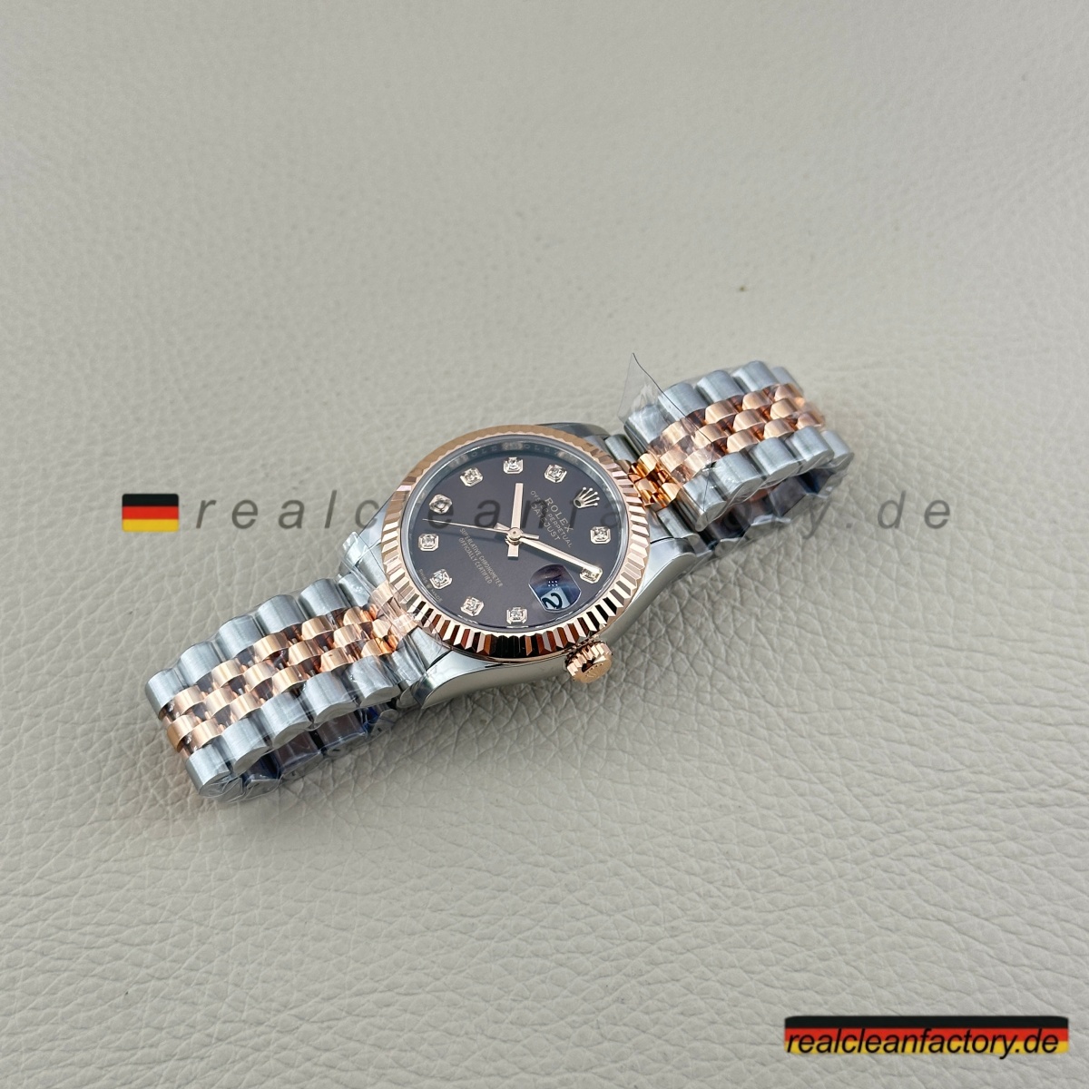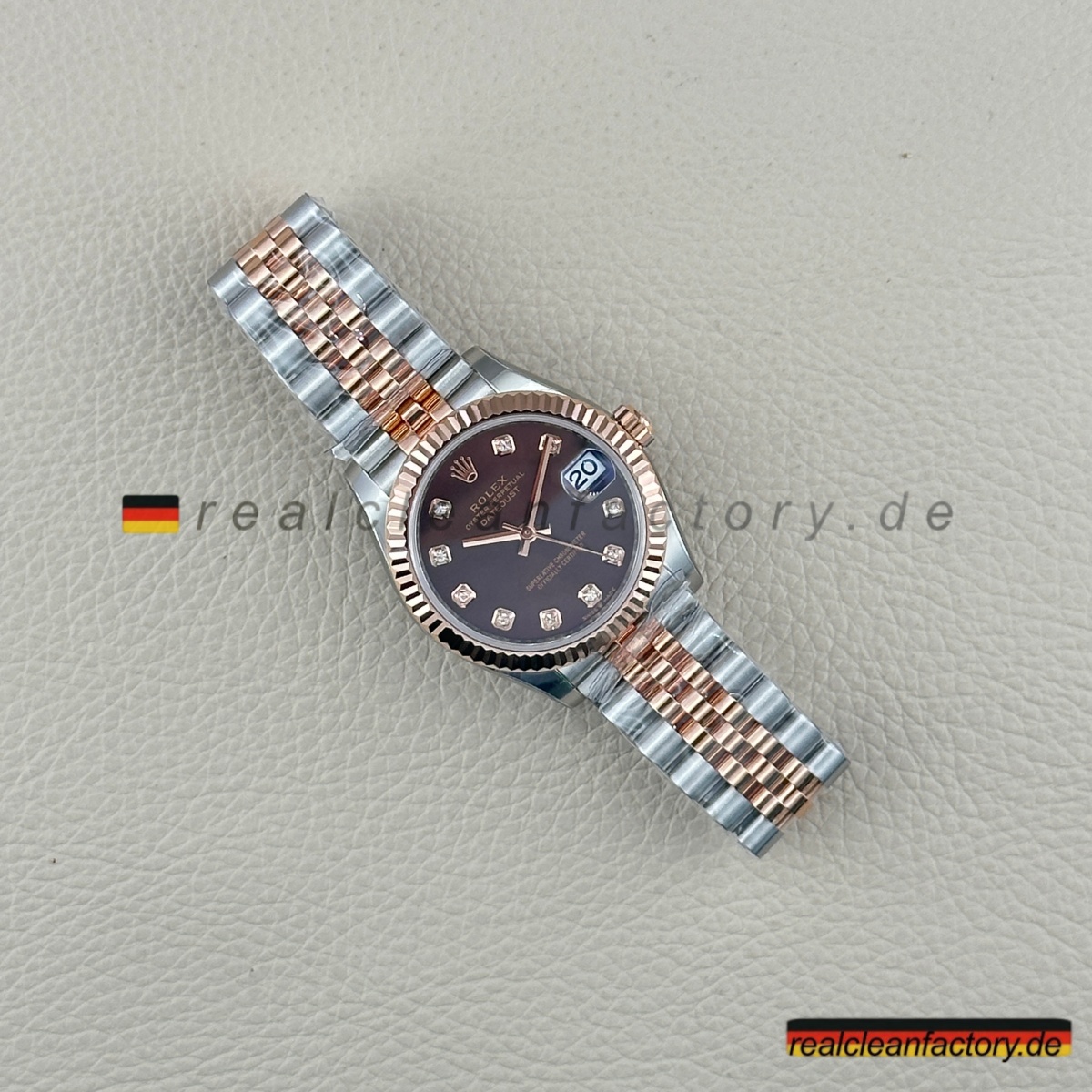 - Die Lady Datejust 278271-0028 von Clean Factory vereint die warme Tiefe eines schokoladenfarbenen Zifferblatts mit der Brillanz echter Moissanite – verpackt in einer eleganten 31-mm-Konfiguration. Die zweifarbige Everose-Konstruktion verwandelt diese Uhr von einem einfachen Zeitmesser in ein edles Schmuckstück. Dank hochwertiger Moissanit-Steine, die Diamanten in Feuer und Funkeln sogar übertreffen, wird jedes Detail zum Blickfang.