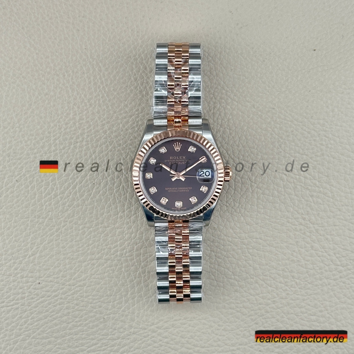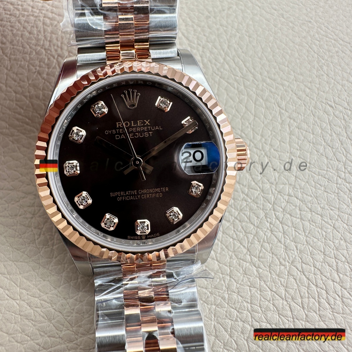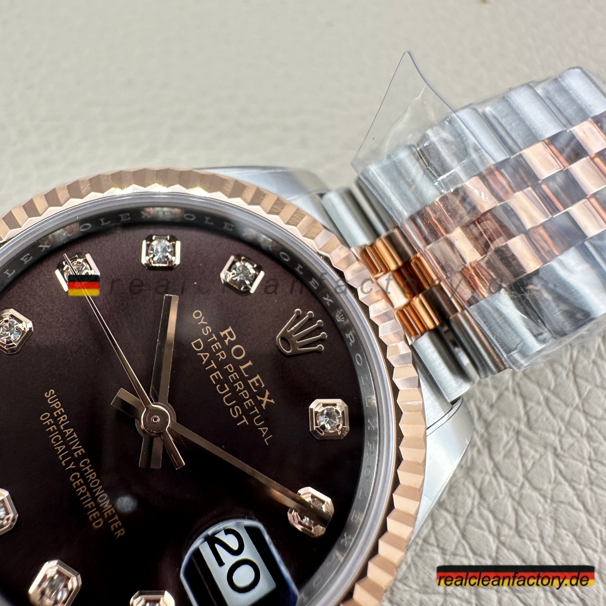 - Die Lady Datejust 278271-0028 von Clean Factory vereint die warme Tiefe eines schokoladenfarbenen Zifferblatts mit der Brillanz echter Moissanite – verpackt in einer eleganten 31-mm-Konfiguration. Die zweifarbige Everose-Konstruktion verwandelt diese Uhr von einem einfachen Zeitmesser in ein edles Schmuckstück. Dank hochwertiger Moissanit-Steine, die Diamanten in Feuer und Funkeln sogar übertreffen, wird jedes Detail zum Blickfang.
