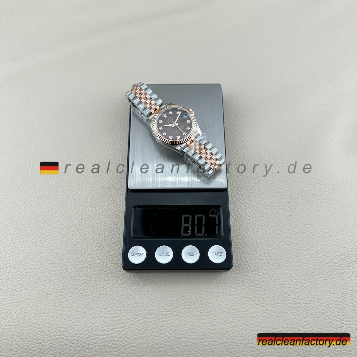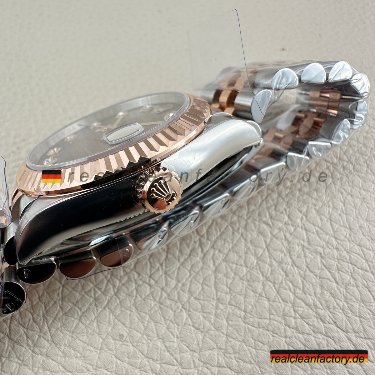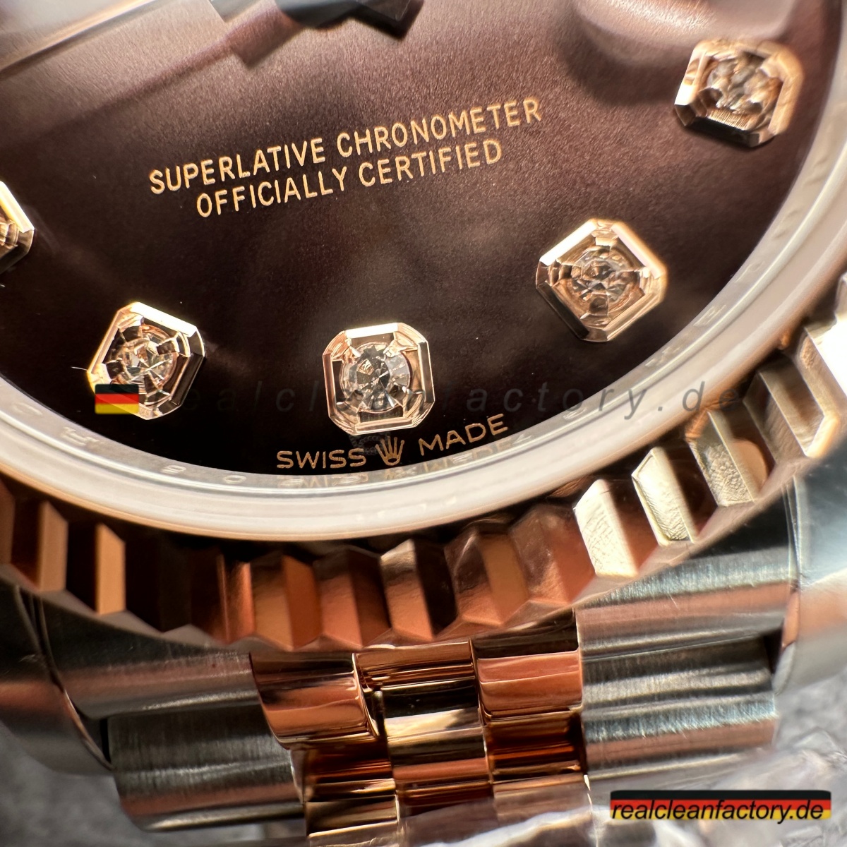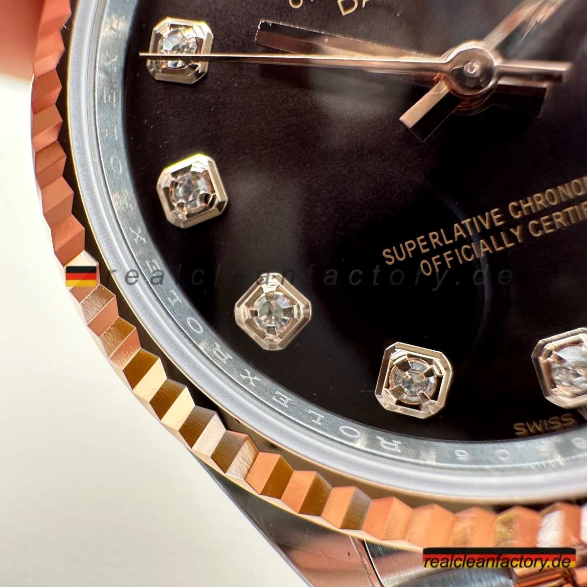 - Besonders beeindruckend ist, wie alle Komponenten harmonisch zusammenspielen: Die warme Tiefe des Zifferblatts, das kühle Feuer der Steine und die ausgewogene Rosé-Tönung des Metalls ergeben ein stimmiges Gesamtbild – durchdacht statt überladen. Clean Factory hat bei jedem Aspekt – von der Farbabstimmung über die Edelsteinfassung bis zur Goldformel – auf Perfektion geachtet. Das Ergebnis: eine Replica, die dem Original in nichts nachsteht.