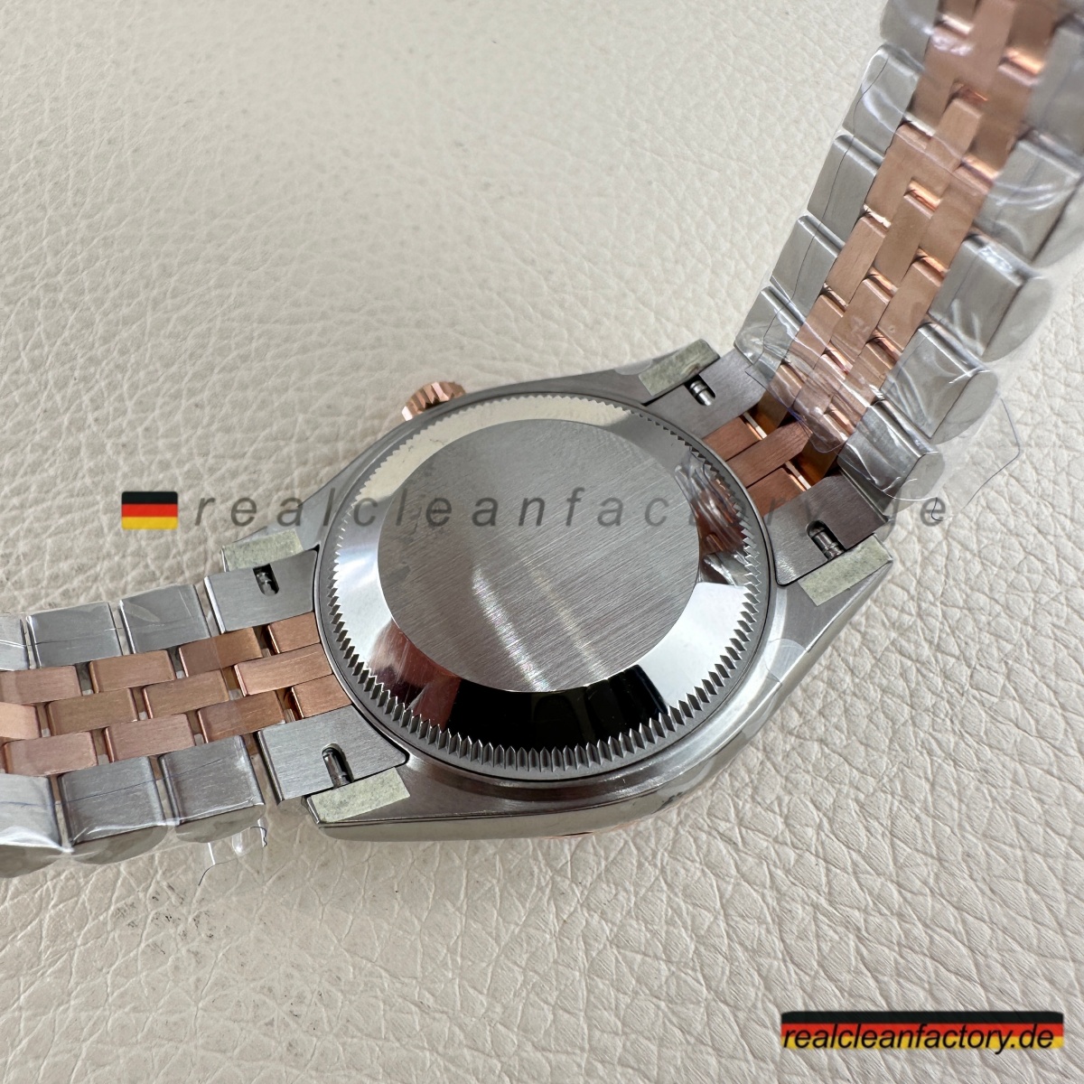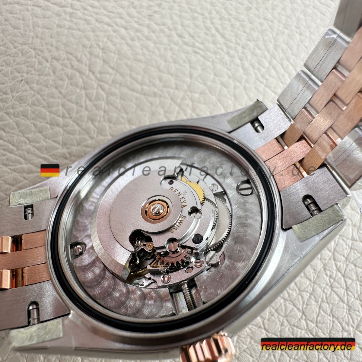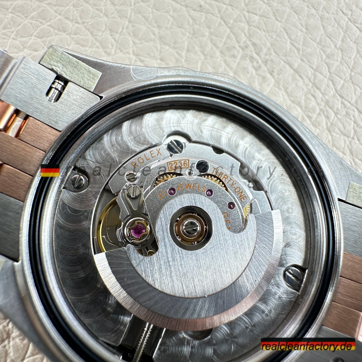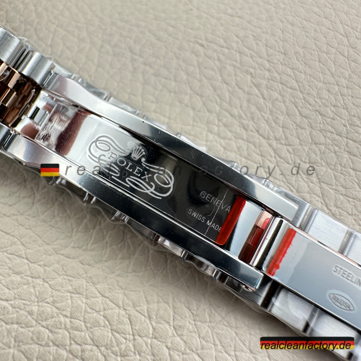 - Das Everose-Gold verdient besondere Erwähnung. Hier handelt es sich nicht um klassisches Roségold, das mit der Zeit ausbleicht oder orange wird. Clean Factory integriert – genau wie Rolex – Platin in die Goldlegierung, um den rosé-kupferfarbenen Ton dauerhaft zu stabilisieren. Dank molekularer Verbindung verschmilzt das Gold auf atomarer Ebene mit dem Stahl – es ist kein Überzug, sondern ein integraler Bestandteil des Gehäuses.