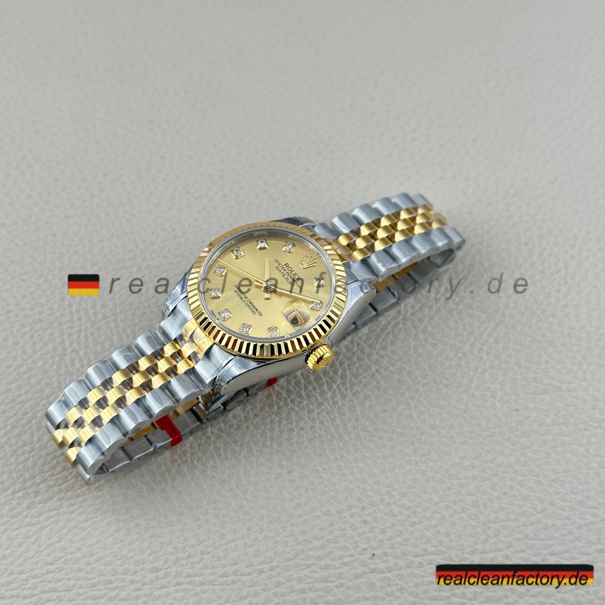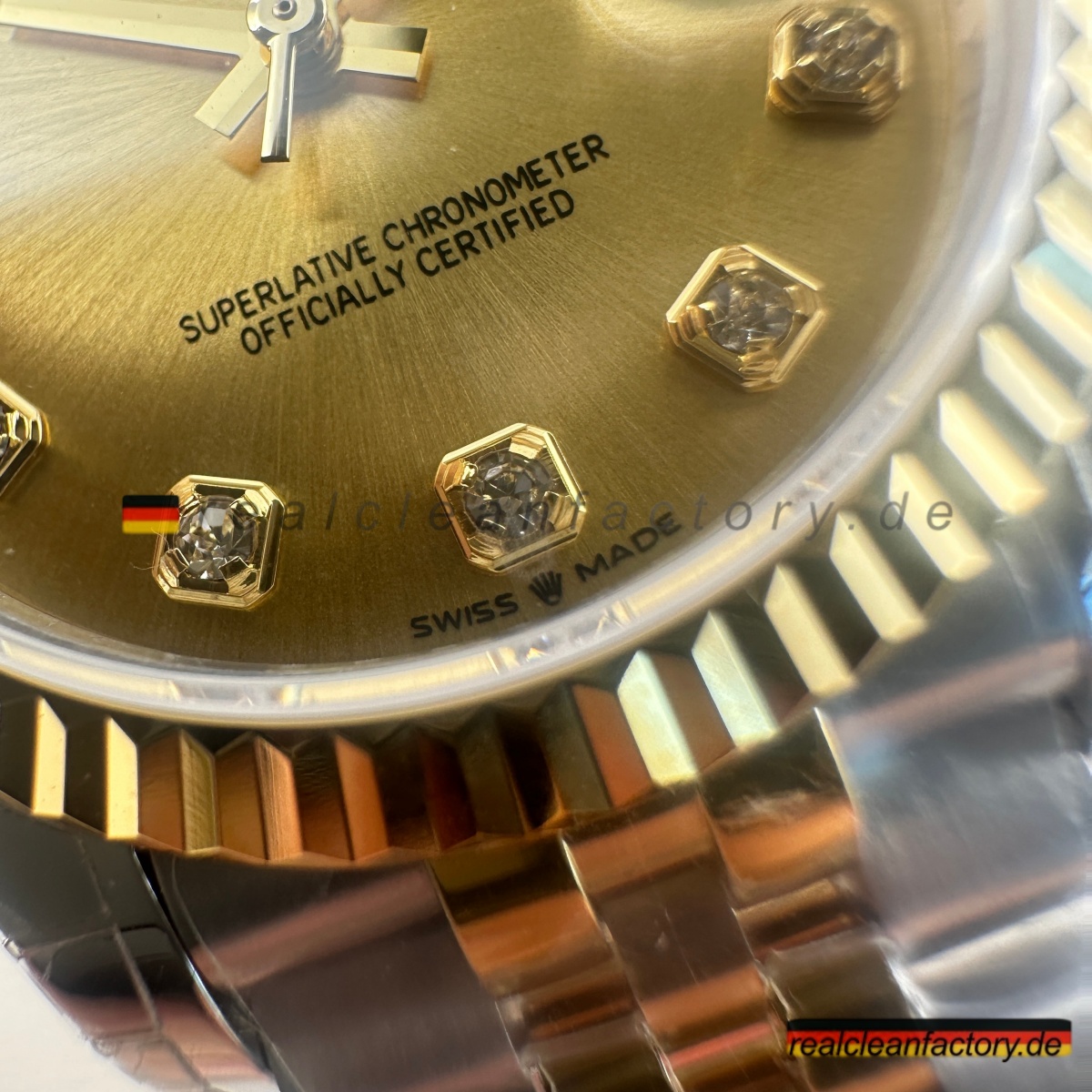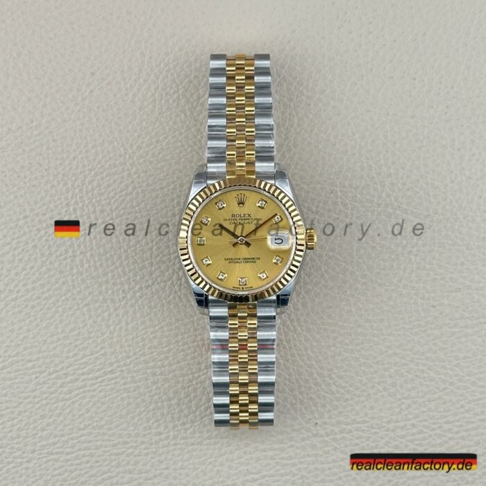 - Die beste Replik Rolex Lady Datejust 278273-0026 von Clean Factory vereint Champagner und Gelbgold in perfekter Harmonie – eine Kombination, die die Zeit überdauert hat und heute dank funkelnder Moissanite-Markierungen heller strahlt denn je. Mit 31 mm fängt sie den Zauber der „goldenen Stunde“ ein – zeitlose Eleganz, die heute genauso aktuell ist wie damals.