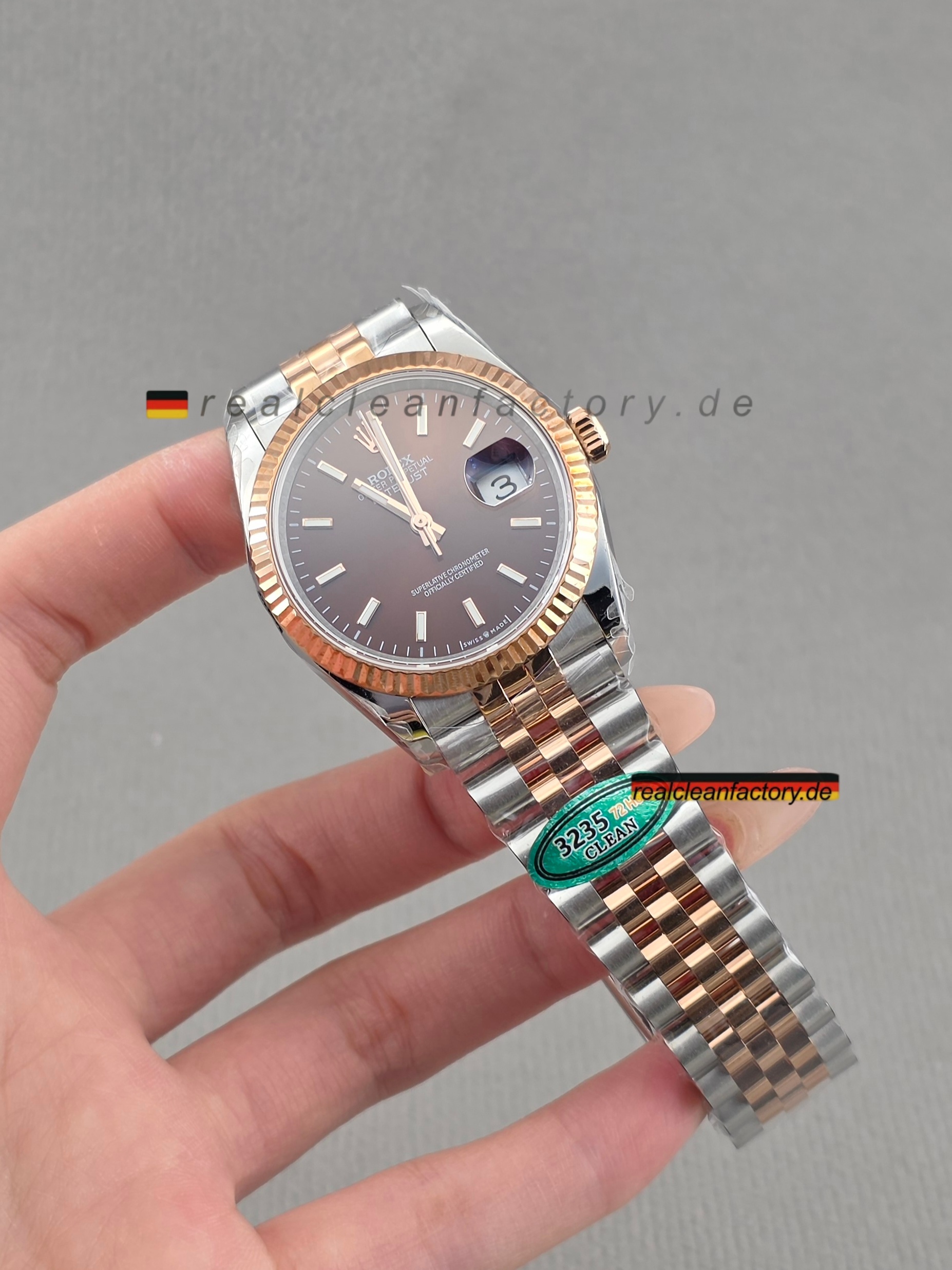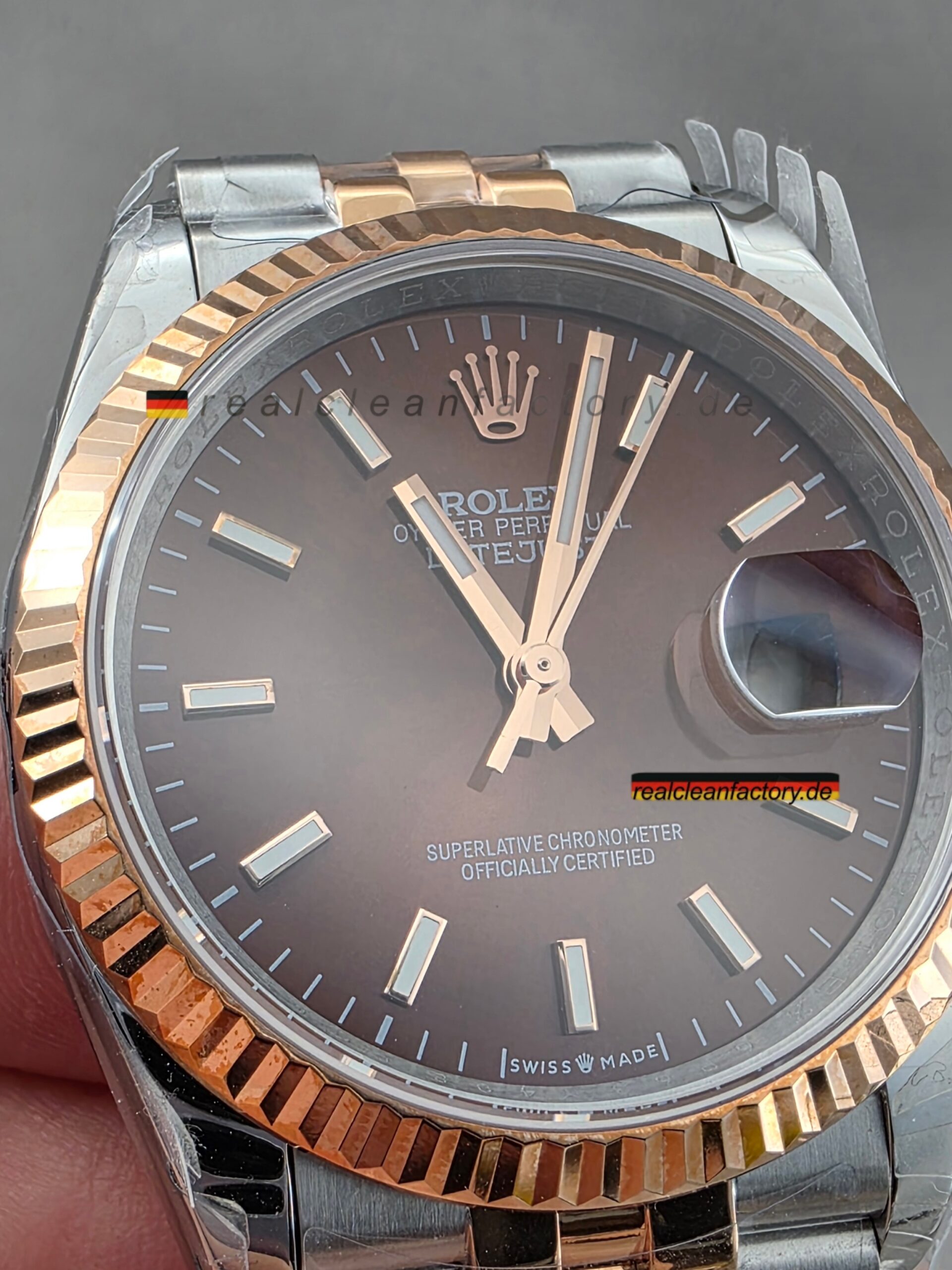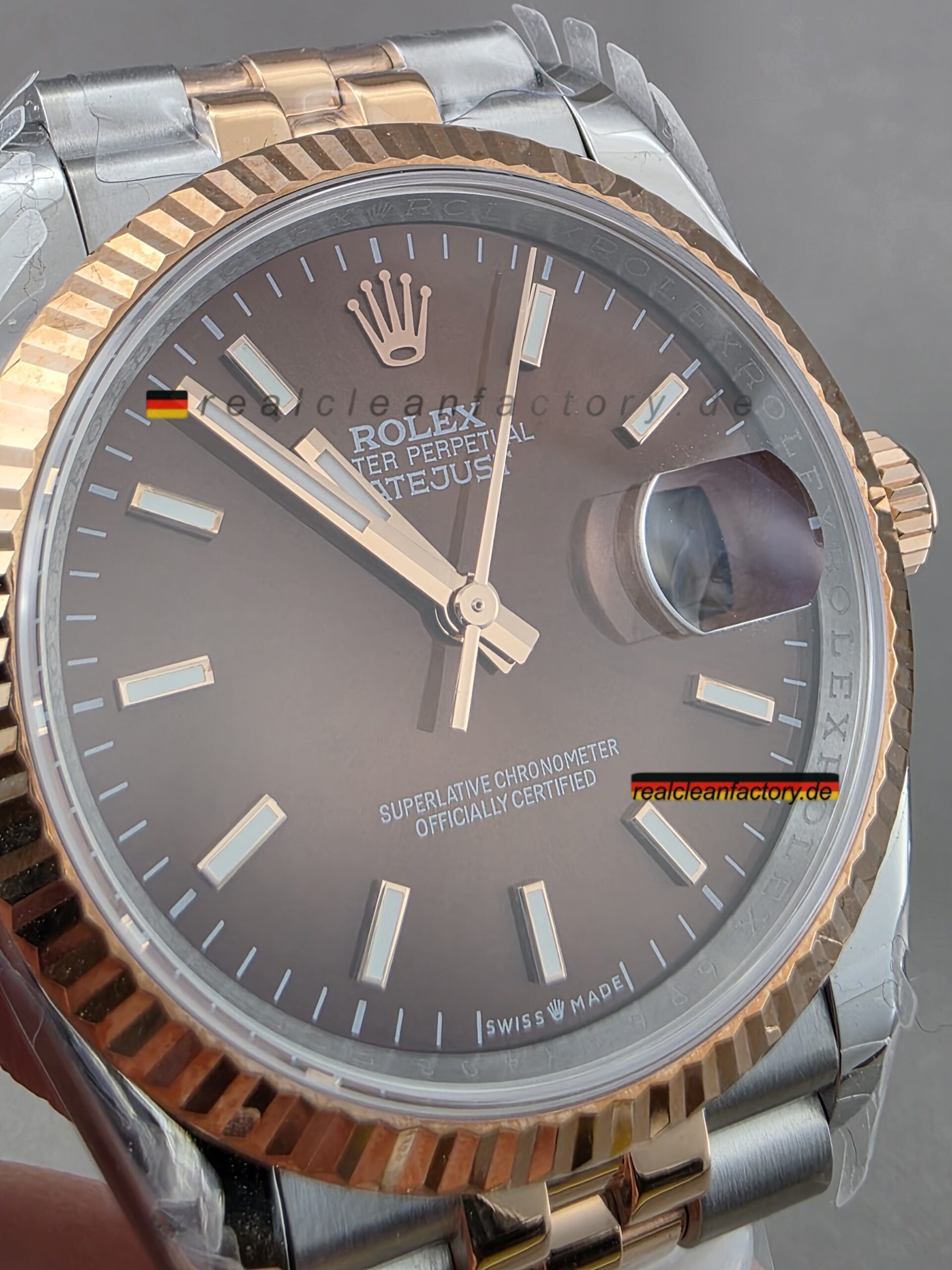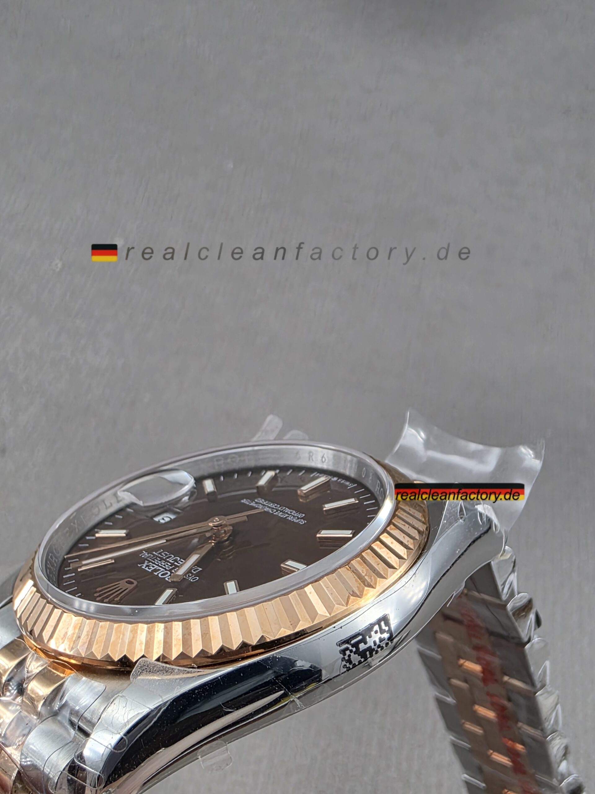• Clean Factorys Super Clone Rolex Datejust 126231-0043 vereint das reiche Schokoladen-Sunburst-Zifferblatt mit warmem Everose-Gold in einer zweifarbigen Jubilee-Konfiguration. Das Ergebnis: eine Uhr, die dezente Eleganz und technische Perfektion in sich trägt.