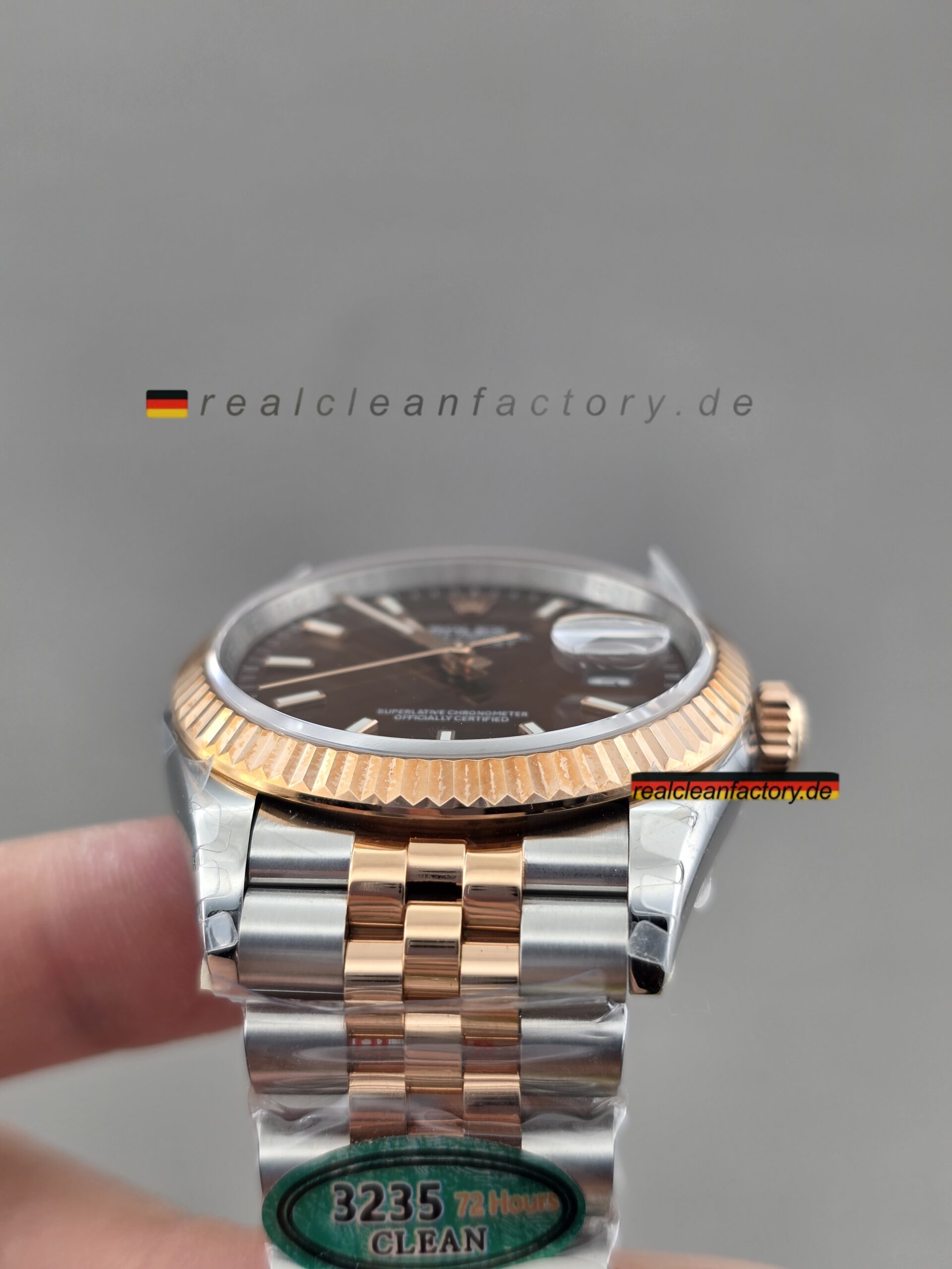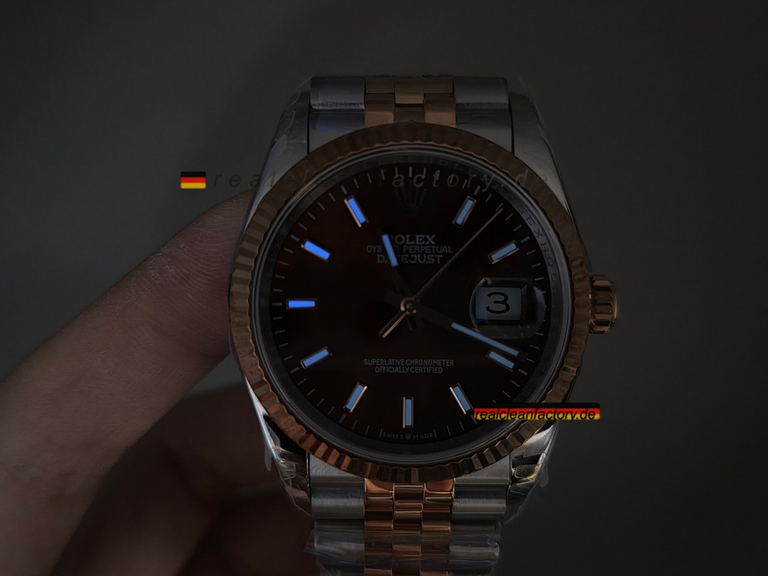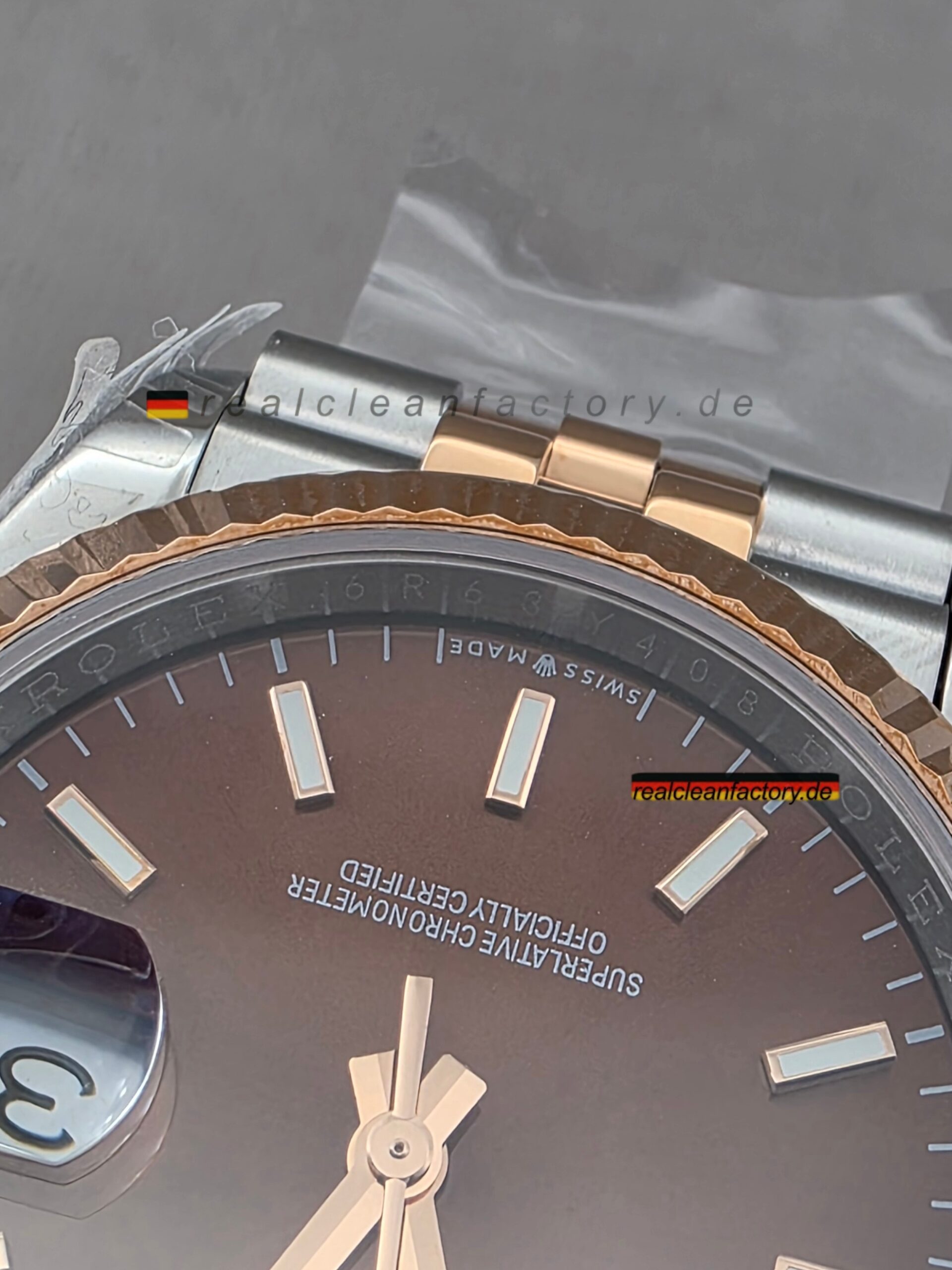 • Clean Factorys Super Clone Rolex Datejust 126231-0043 vereint das reiche Schokoladen-Sunburst-Zifferblatt mit warmem Everose-Gold in einer zweifarbigen Jubilee-Konfiguration. Das Ergebnis: eine Uhr, die dezente Eleganz und technische Perfektion in sich trägt.