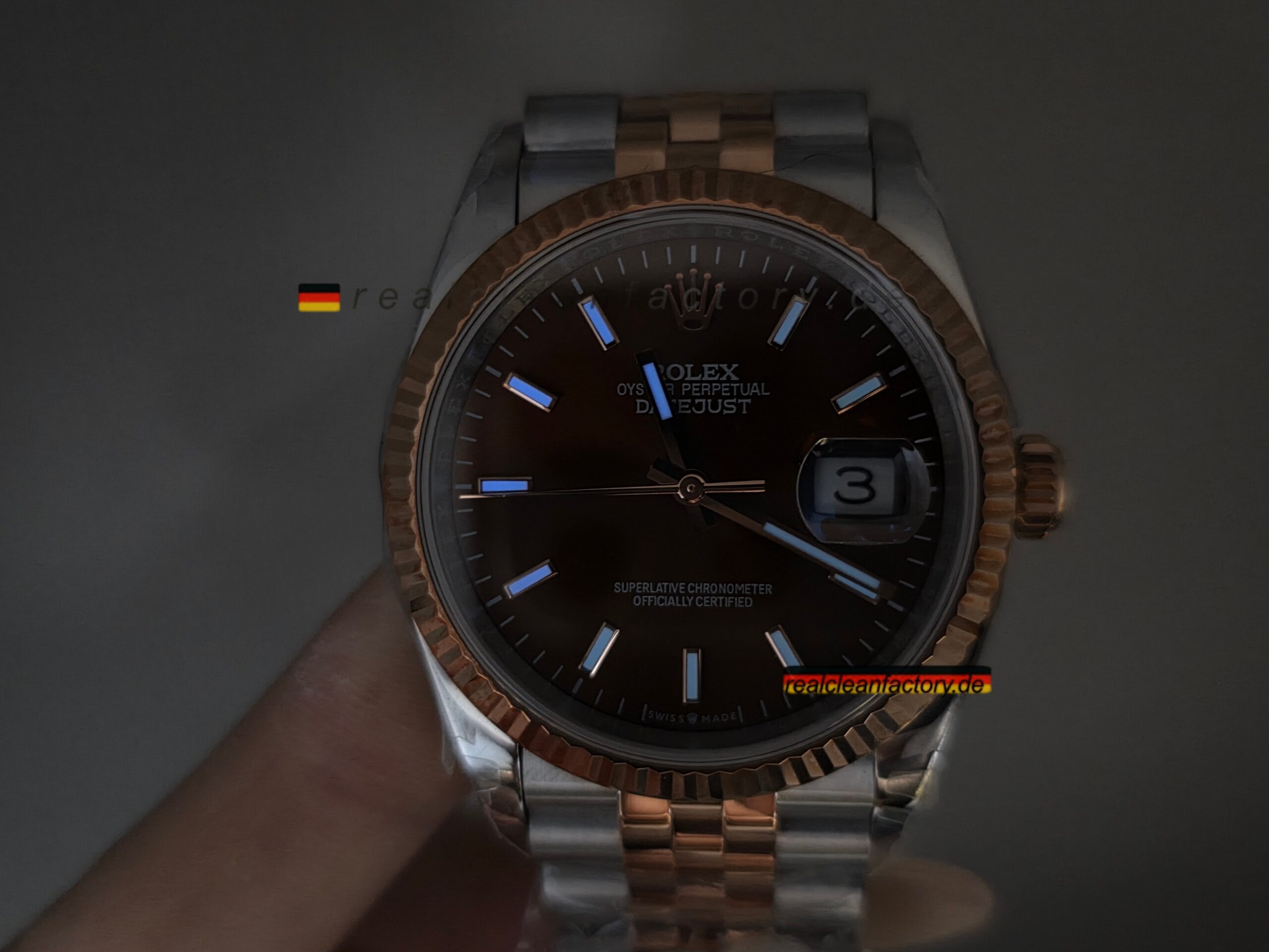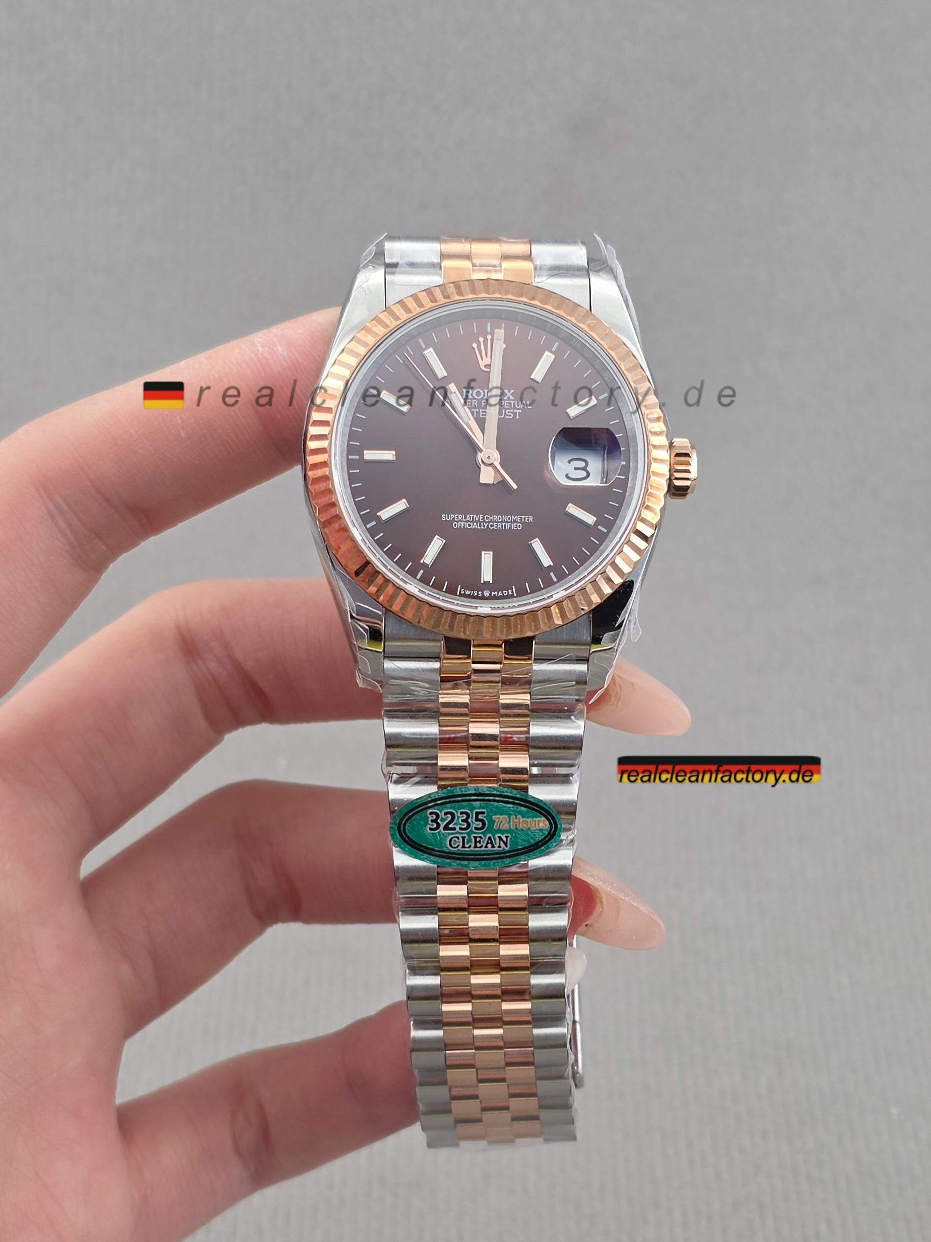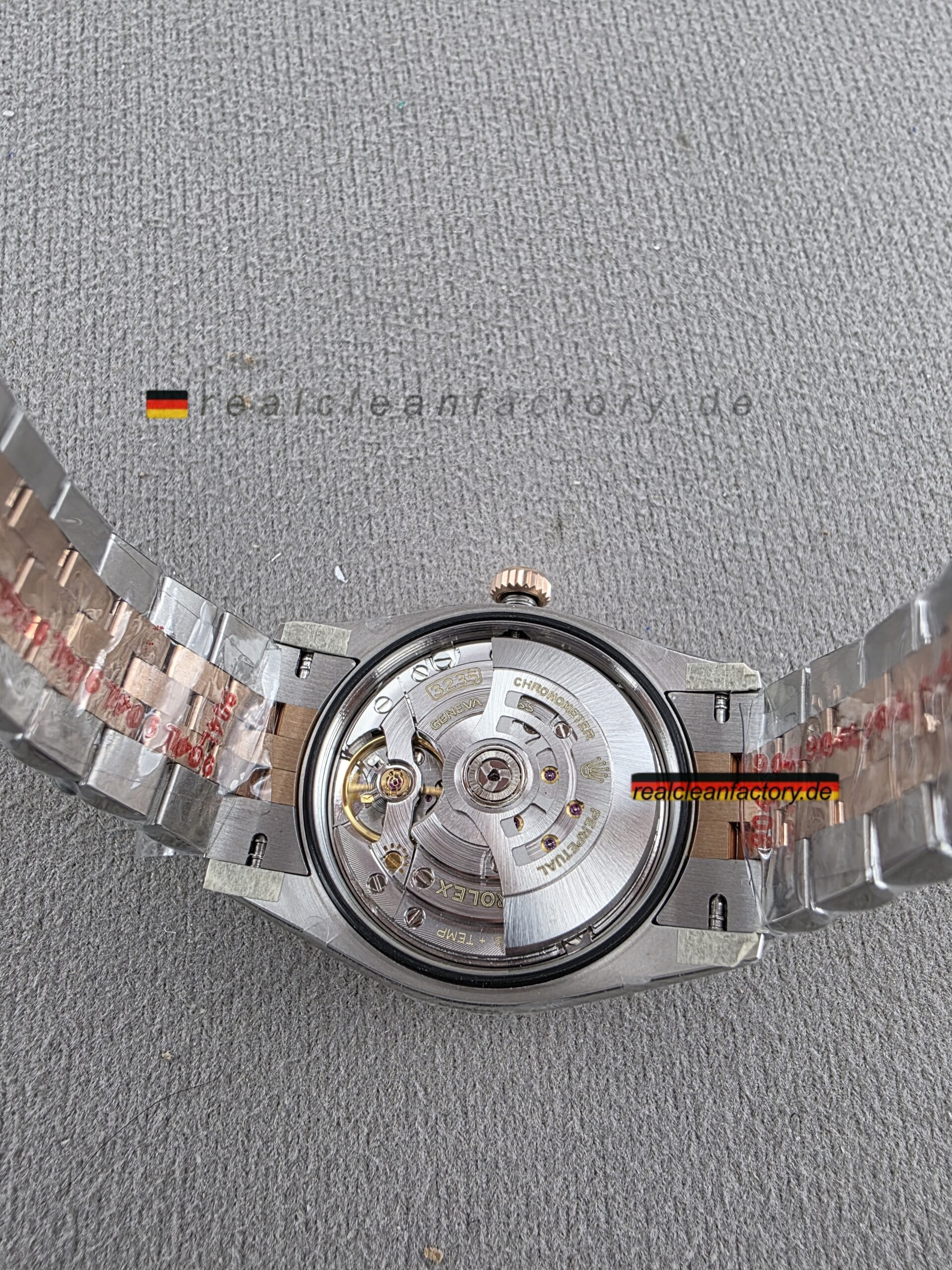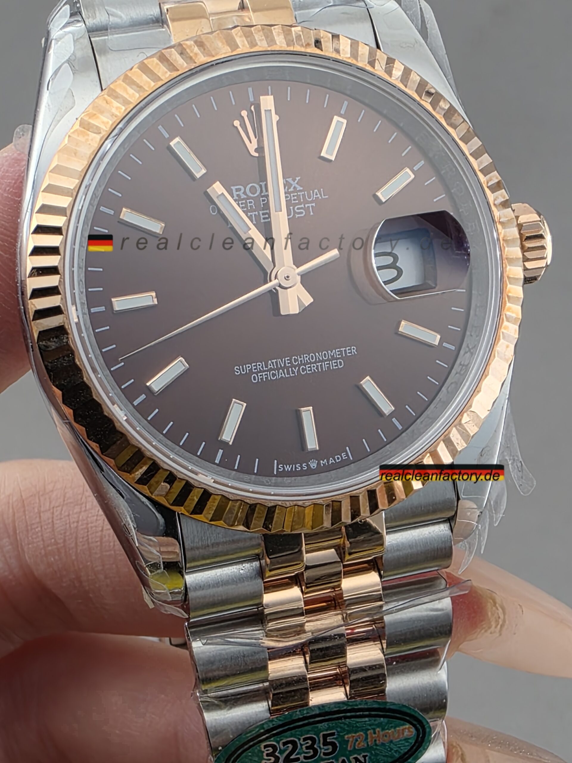 • Clean Factorys Super Clone Rolex Datejust 126231-0043 vereint das reiche Schokoladen-Sunburst-Zifferblatt mit warmem Everose-Gold in einer zweifarbigen Jubilee-Konfiguration. Das Ergebnis: eine Uhr, die dezente Eleganz und technische Perfektion in sich trägt.