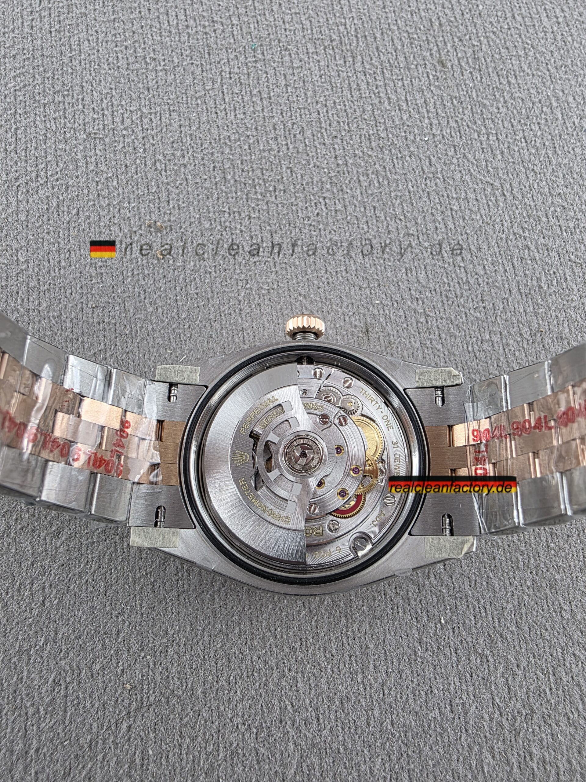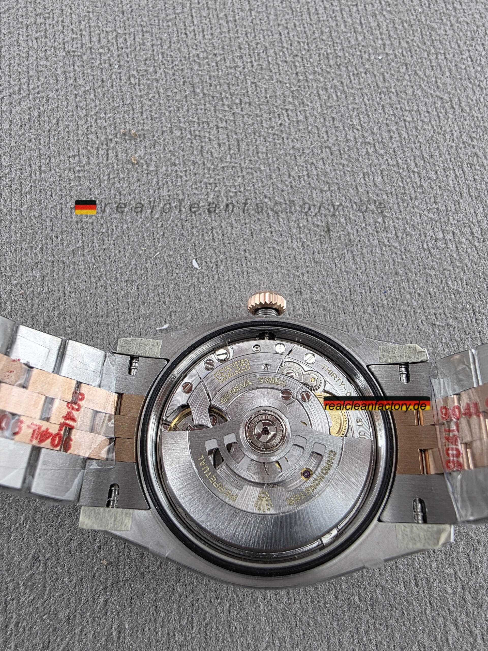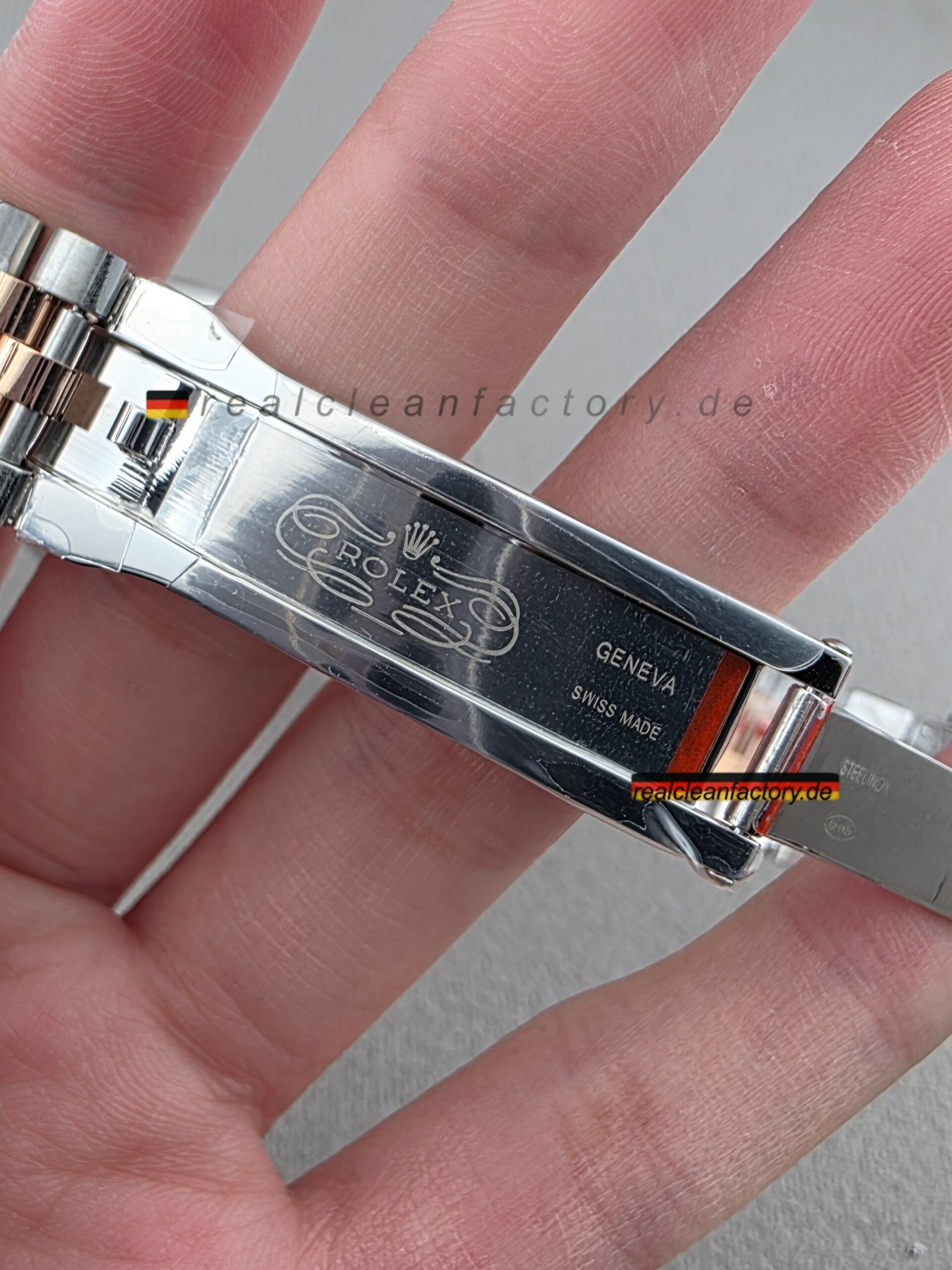 • Im Inneren arbeitet das Super Swiss-Level 3235 Uhrwerk – Clean Factorys Meisterstück. Mit 70 Stunden Gangreserve, sofortigem Datumswechsel und authentischem Aufzugsgefühl bietet es alles, was von einem echten Rolex-Kaliber erwartet wird. Auch das Finish mit Genfer Streifen, Perlage und Anglage wurde originalgetreu nachgebildet.