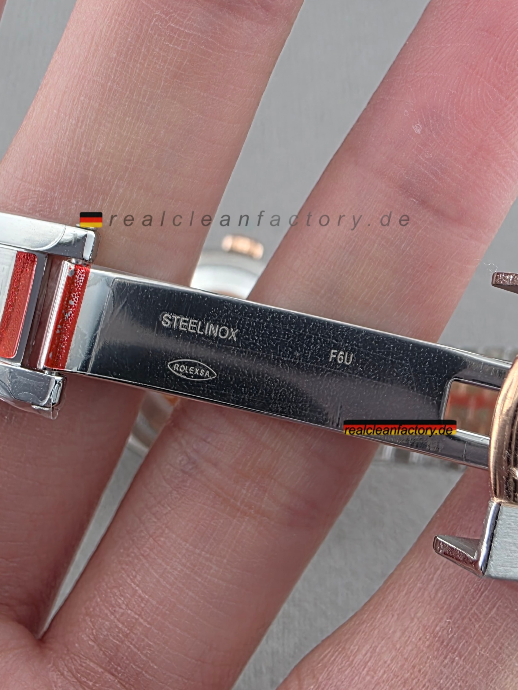 • Die Everose-Gold-Elemente ergänzen das Zifferblatt mit harmonischer Wärme. Im Gegensatz zu normalem Roségold, das oxidieren kann, enthält Everose Platin, um den Ton dauerhaft zu stabilisieren. Clean Factorys molekulare Verbindungstechnologie stellt sicher, dass das Gold dauerhaft mit dem Stahl verschmilzt – ohne Abnutzung oder Verfärbung.