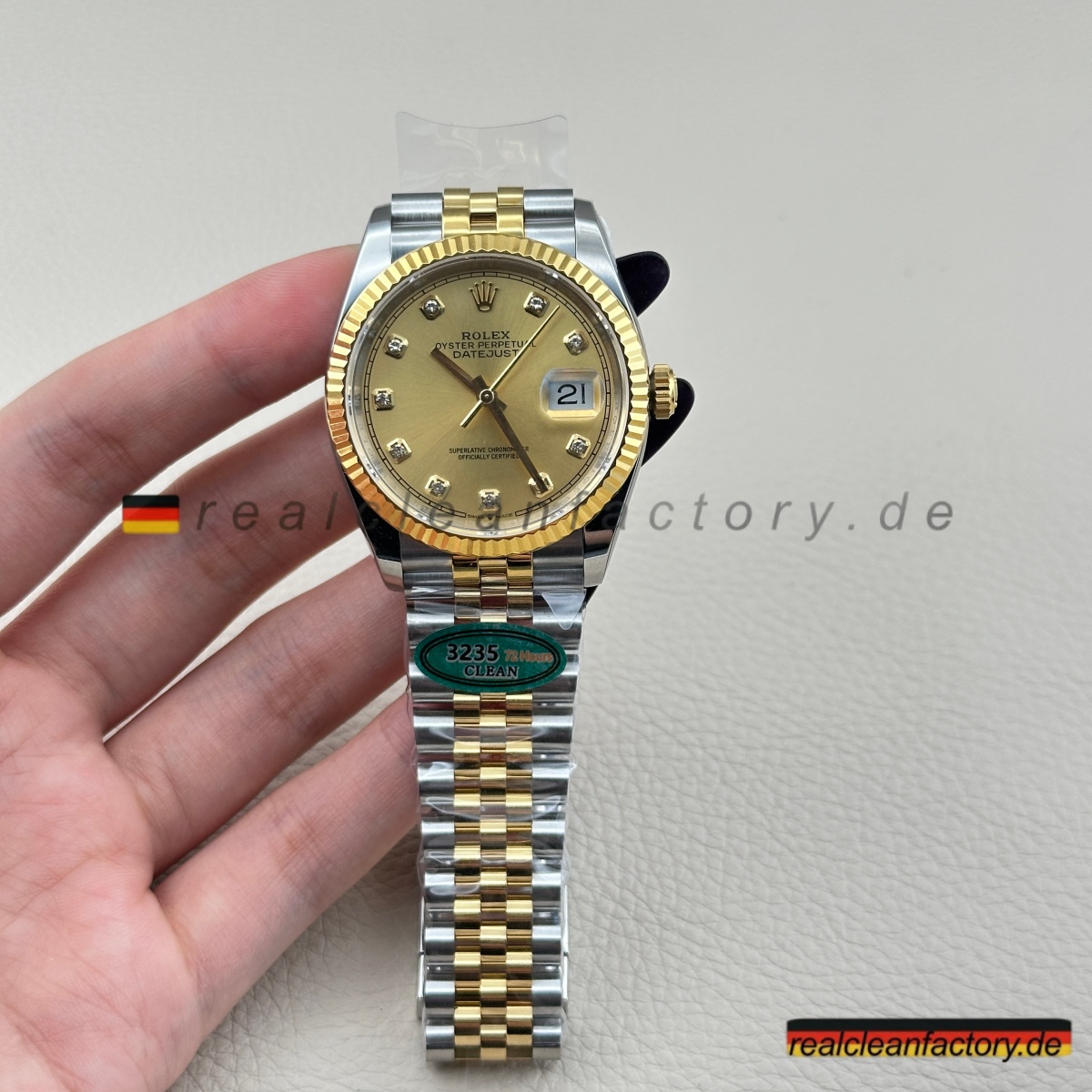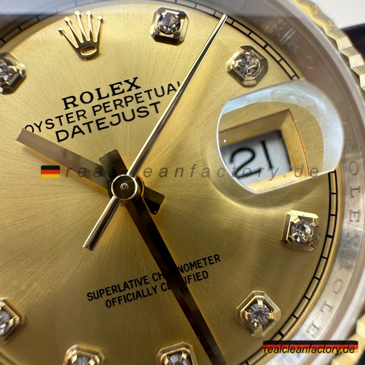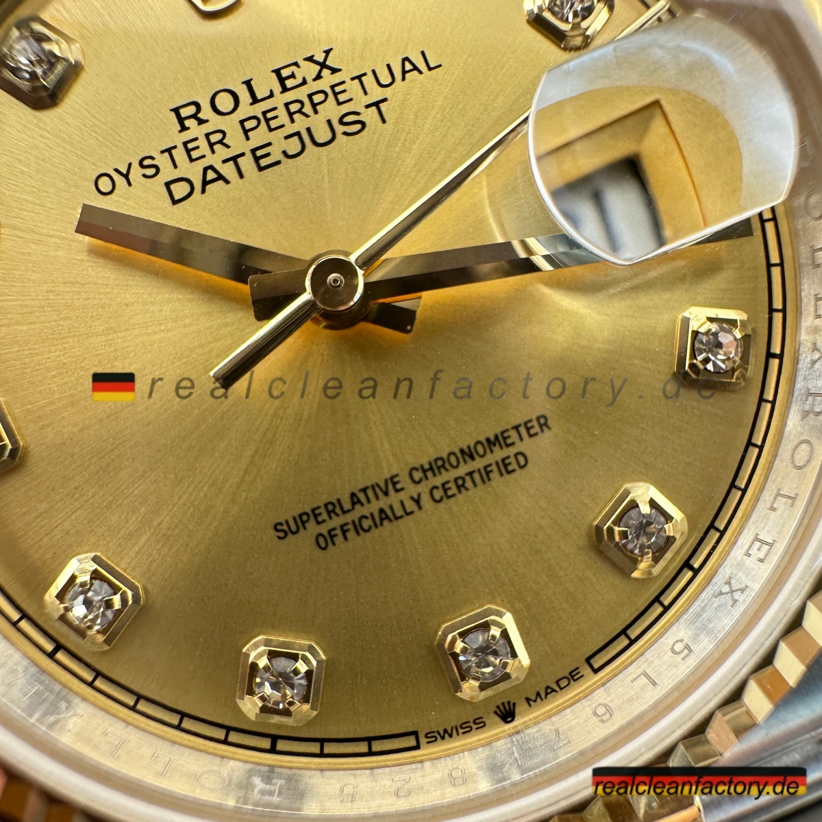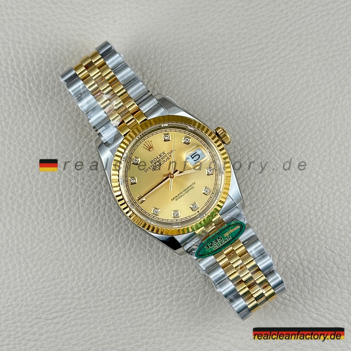 - Clean Factory’s Super Clone Rolex Datejust 126233-0017 pairs the iconic champagne dial with genuine moissanite diamond markers and warm two-tone yellow gold, resulting in a striking watch that feels every bit as luxurious as it looks. This isn’t a replica that relies on cheap materials or shortcuts. From the carefully sourced moissanite stones to the proprietary gold application process, every element is designed to stand up to close scrutiny—and time itself.