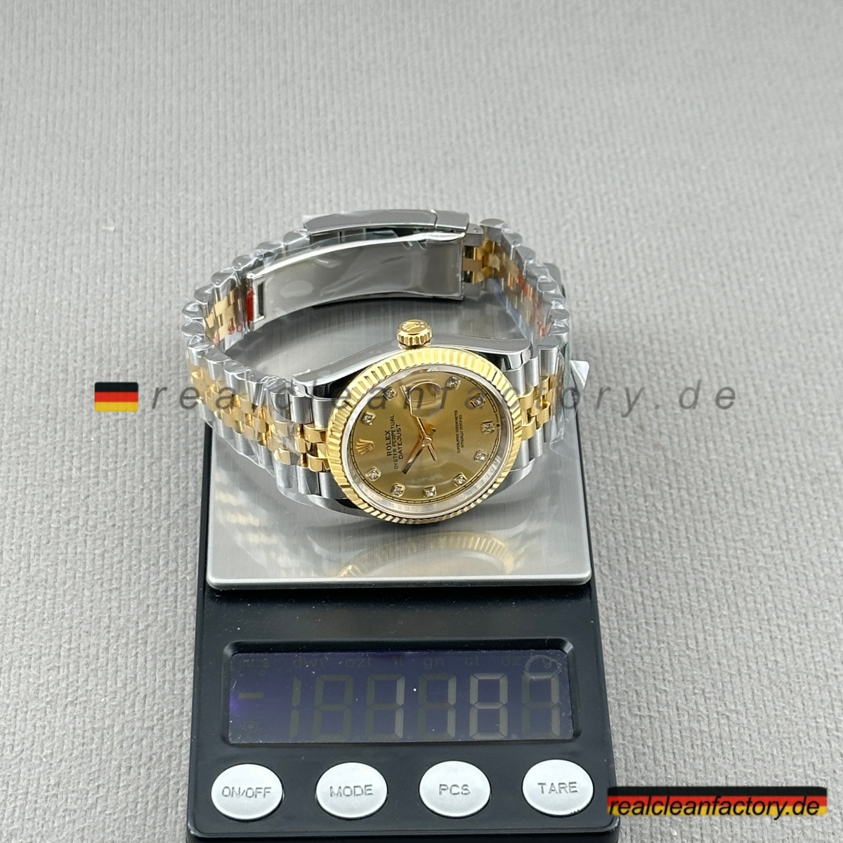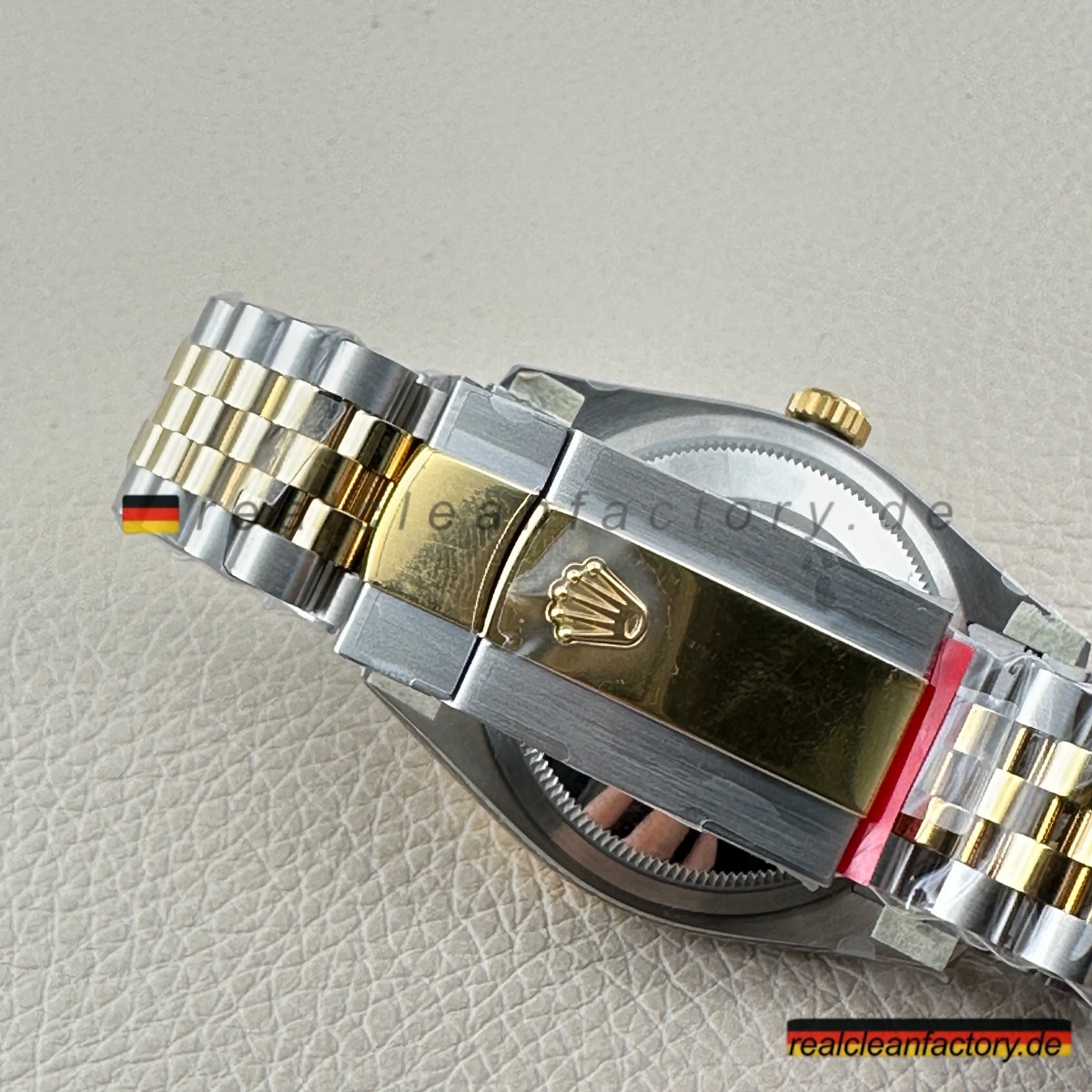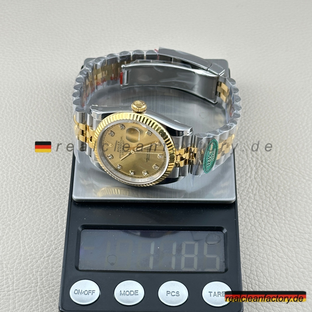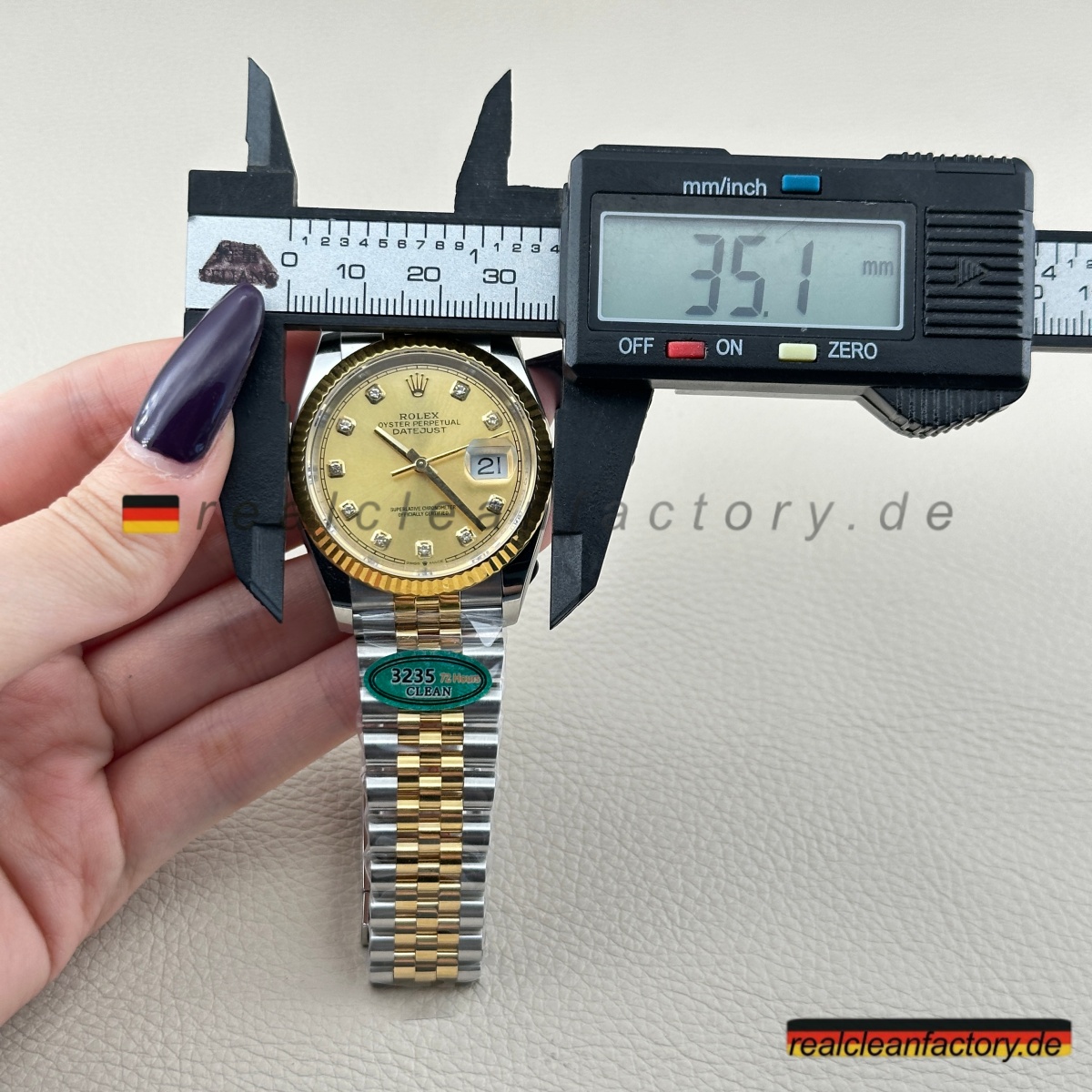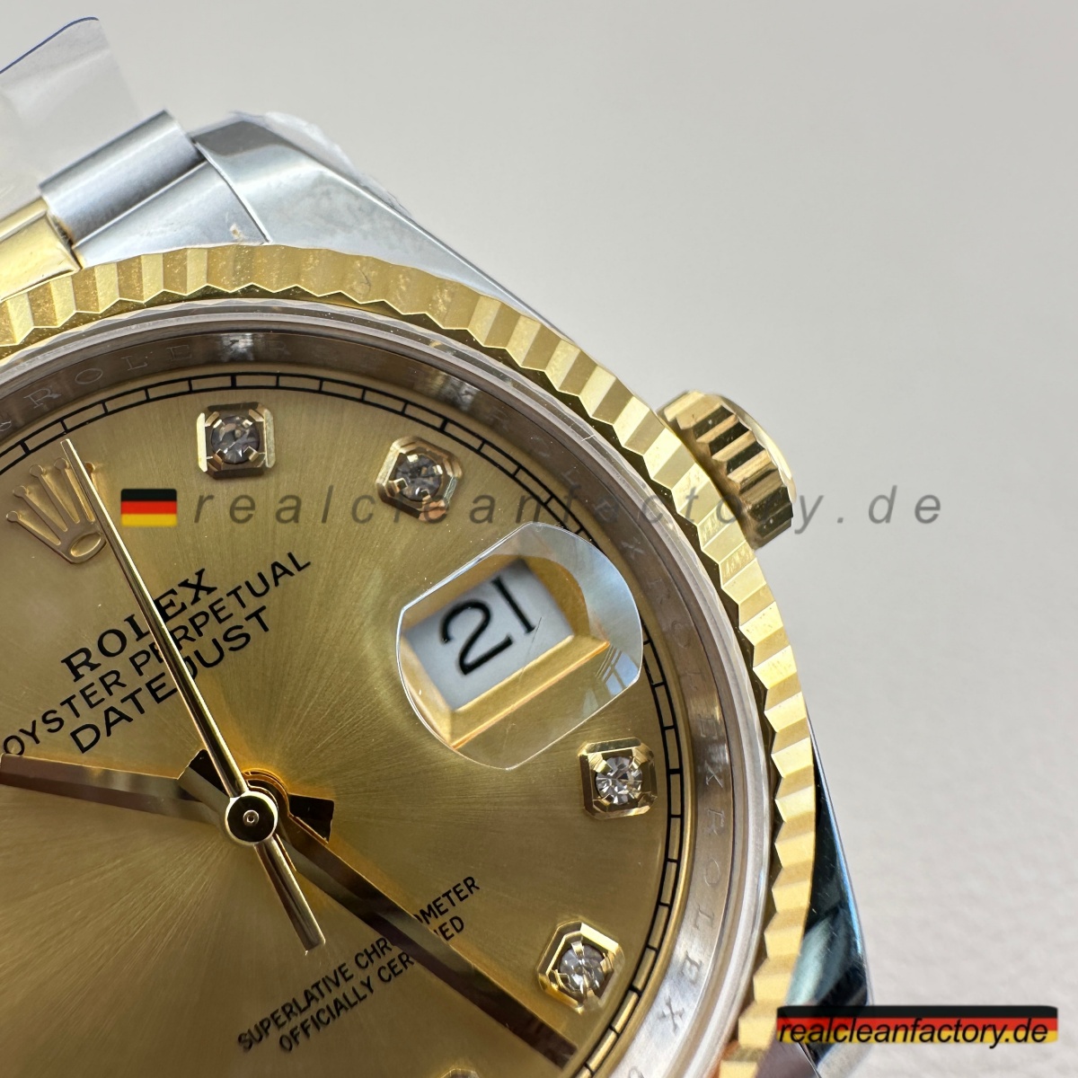 - Clean Factory’s Super Clone Rolex Datejust 126233-0017 pairs the iconic champagne dial with genuine moissanite diamond markers and warm two-tone yellow gold, resulting in a striking watch that feels every bit as luxurious as it looks. This isn’t a replica that relies on cheap materials or shortcuts. From the carefully sourced moissanite stones to the proprietary gold application process, every element is designed to stand up to close scrutiny—and time itself.