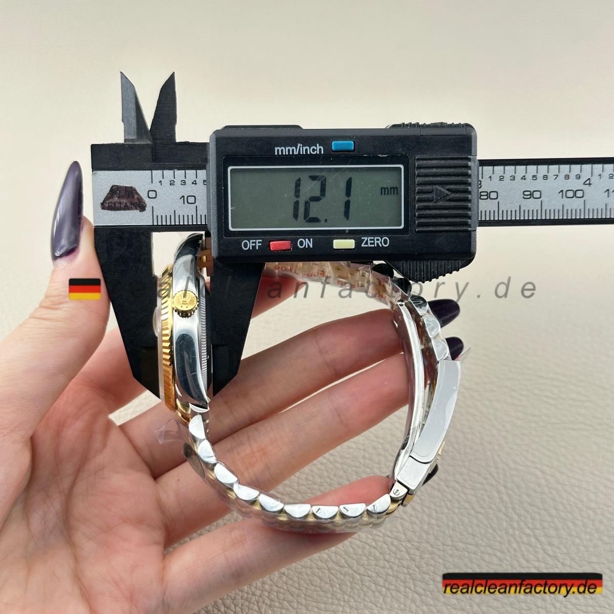 - At 36mm, this piece hits a sweet spot—large enough to showcase the diamonds and dial detail, but sized for classic elegance that suits any wrist. Clean Factory’s case proportions are true to the original, ensuring the watch feels comfortable and balanced no matter how long you wear it.