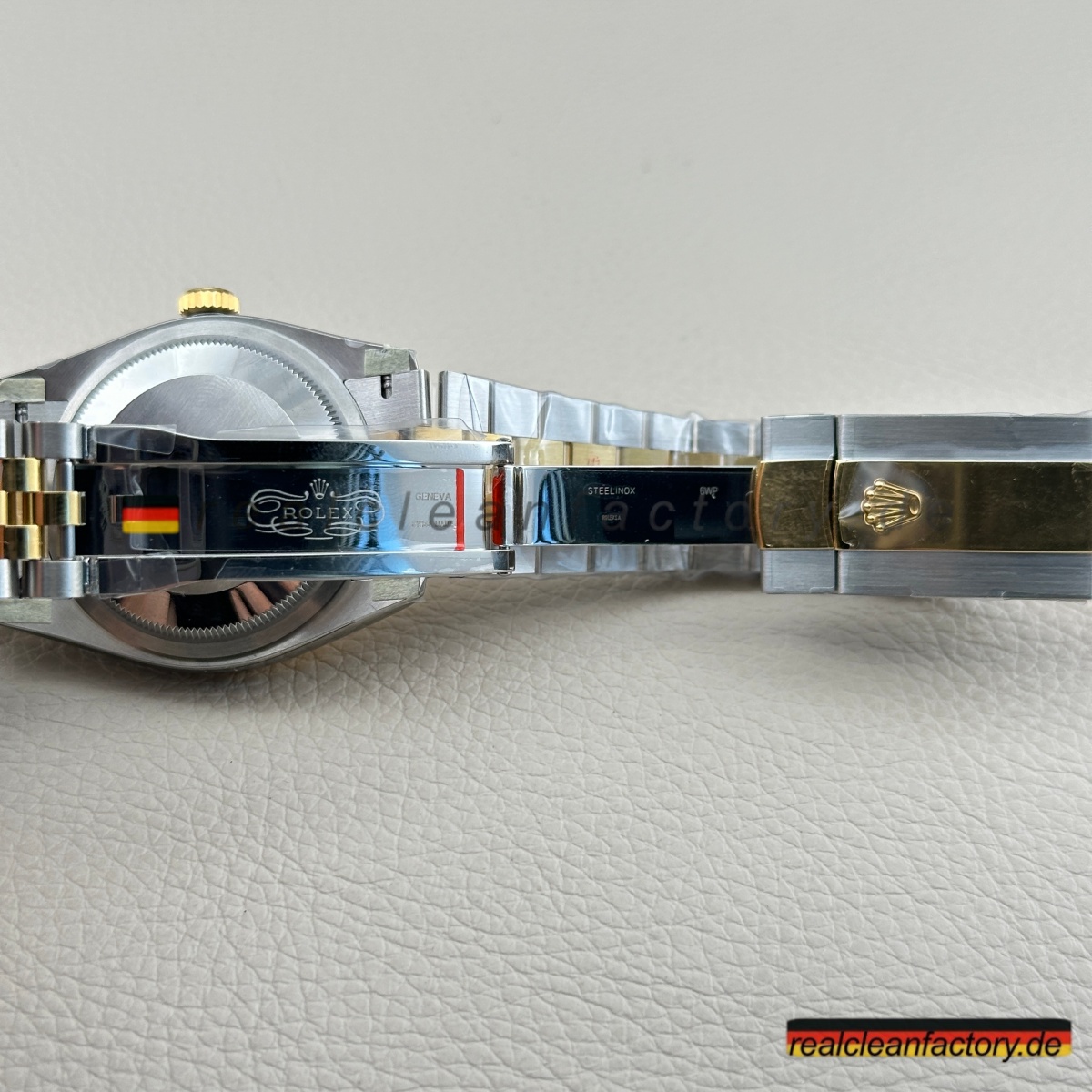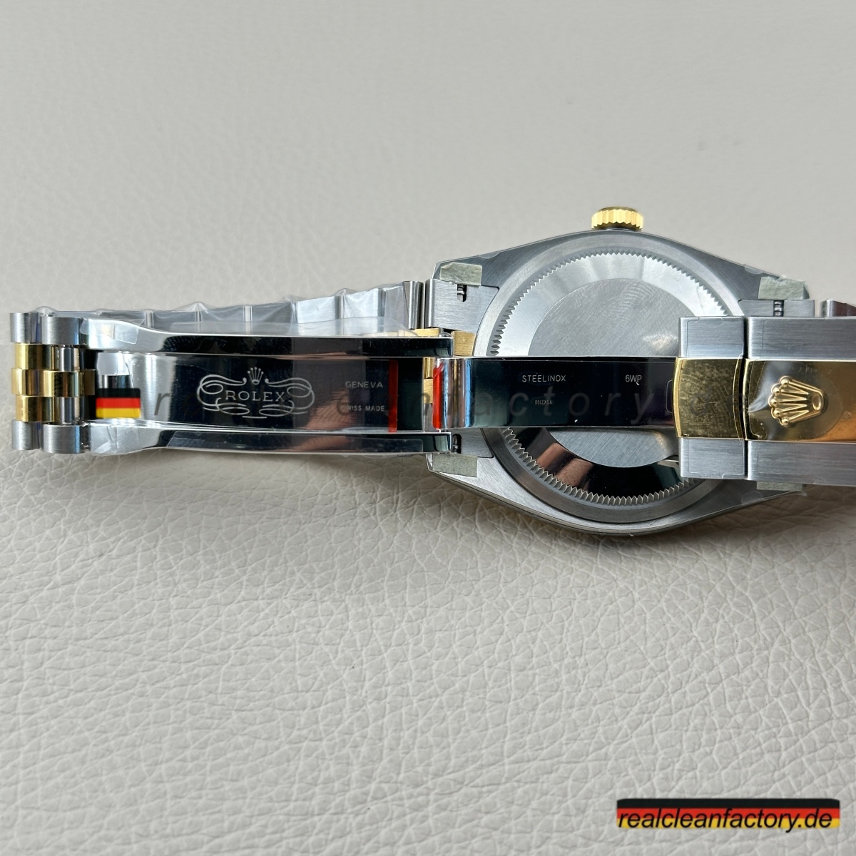 - The two-tone construction underscores the watch’s refined character. Clean Factory’s approach to yellow gold isn’t just electroplating that will fade or chip. Instead, they use a proprietary bonding method that fuses the gold to the steel base at the molecular level. The result is lasting color, consistent tone across every component, and a reassuring weight that feels immediately authentic. The fluted bezel is a perfect example: all 48 ridges are crisply defined, with gold coverage that doesn’t thin out at the edges—so you never risk exposing steel beneath.