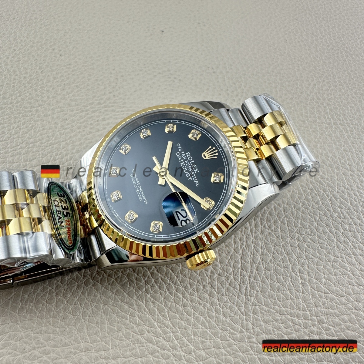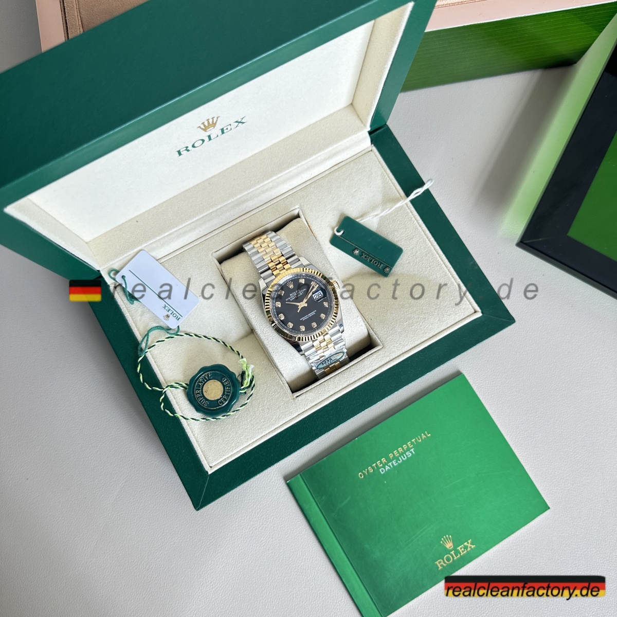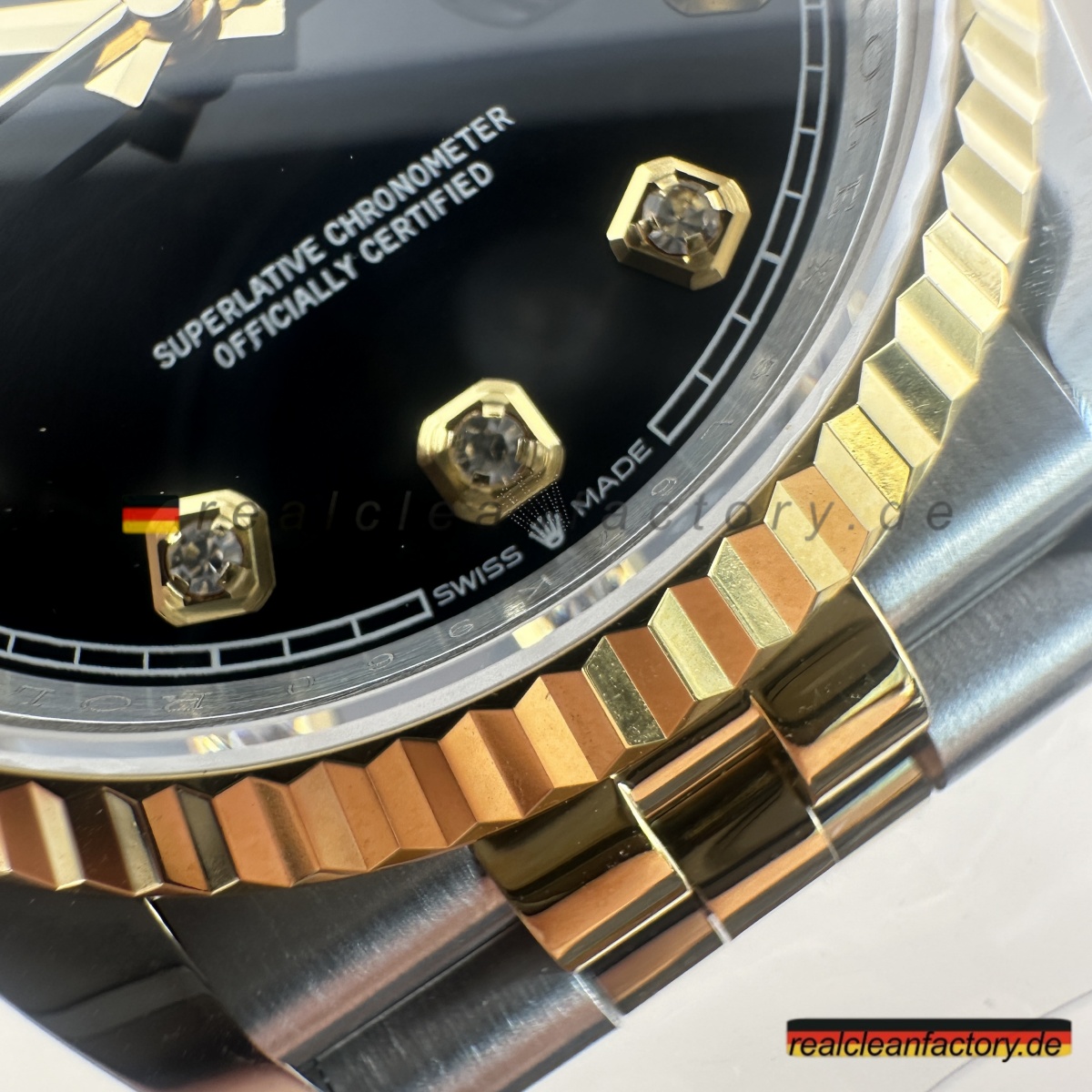 - Die Clean Factory Super Clone Rolex Datejust 126233-0021 kombiniert das dramatische schwarze Zifferblatt, brillante Moissanit-Diamant-Indizes und warmes zweifarbiges Gelbgold zu einer Uhr, die klassische Rolex-Finesse mit unverwechselbarem zeitgenössischem Flair vereint. Diese Konfiguration ist nicht auf Kompromisse ausgerichtet – sie ist ein mutiges Statement für Meisterschaft in Materialwahl und Ausführung, die darauf abzielt, das Original in jeder Hinsicht zu übertreffen.