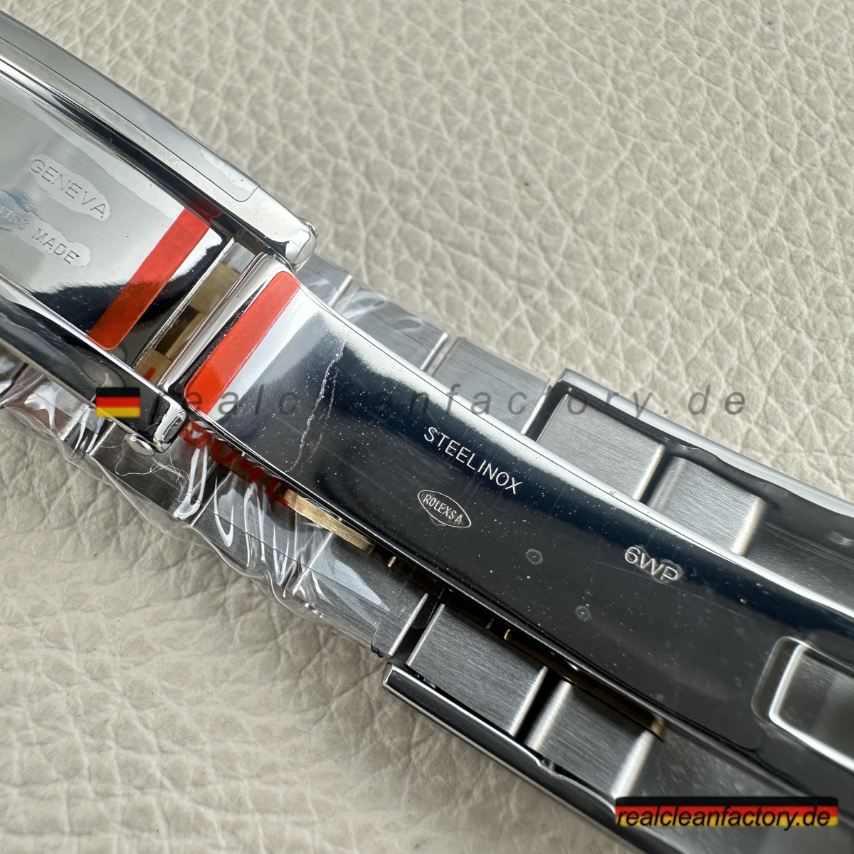 - Die zweifarbige Gelbgold-Konstruktion rundet alles ab und wärmt die Intensität des schwarzen Zifferblatts, während sie gleichzeitig einen unverwechselbaren Luxus hinzufügt. Im Gegensatz zu billigeren Replikaten, die auf dünne Galvanisierung setzen, verwendet Clean Factory ein proprietäres Bonding-Verfahren, das das Gold auf molekularer Ebene mit dem Stahl verbindet. Das bedeutet keine Verblassung, kein Abblättern und keine ungleichmäßige Farbe – nur ein reichhaltiger, gleichmäßiger Ton, der die Zeit überdauert.