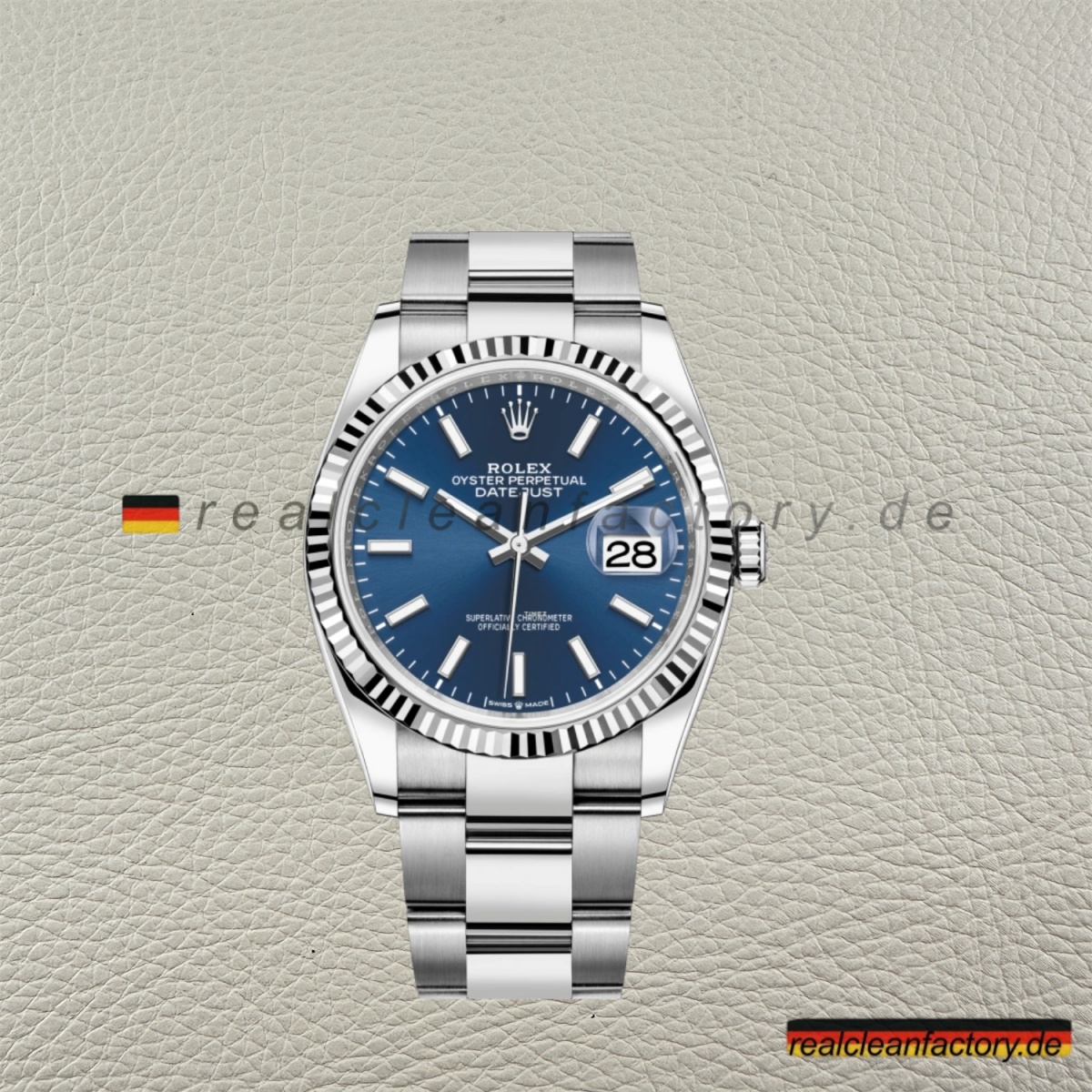 - Die Clean Factory Super Clone Rolex Datejust 126234-0018 kombiniert das unverwechselbare blaue Sunburst-Zifferblatt von Rolex mit dem klassischen 36-mm-Gehäuse, einem weißen Gold Fluted Bezel und dem robusten Oyster-Armband. Diese Konfiguration demonstriert perfekt, dass wahre Luxus-Uhren nicht auf komplizierte Verzierungen angewiesen sind – es geht darum, die Grundlagen genau richtig zu machen.