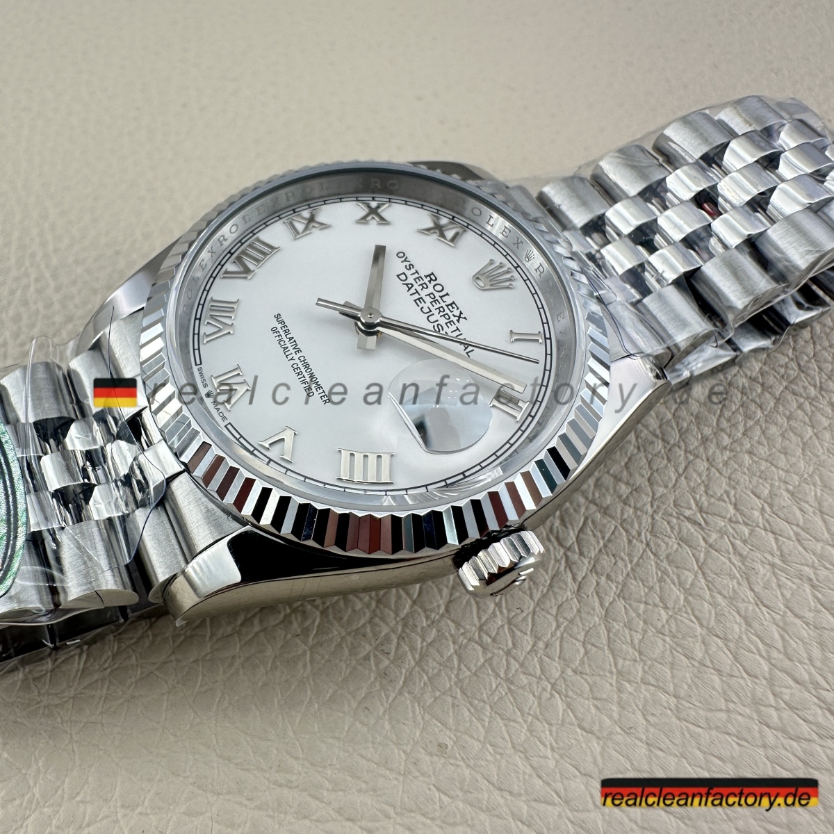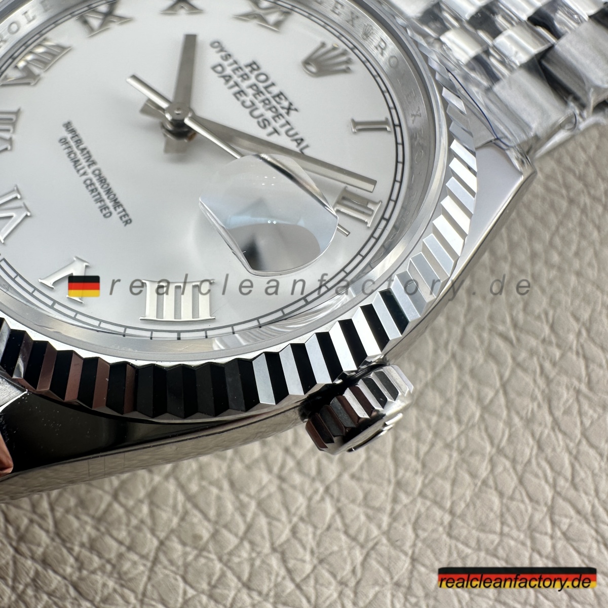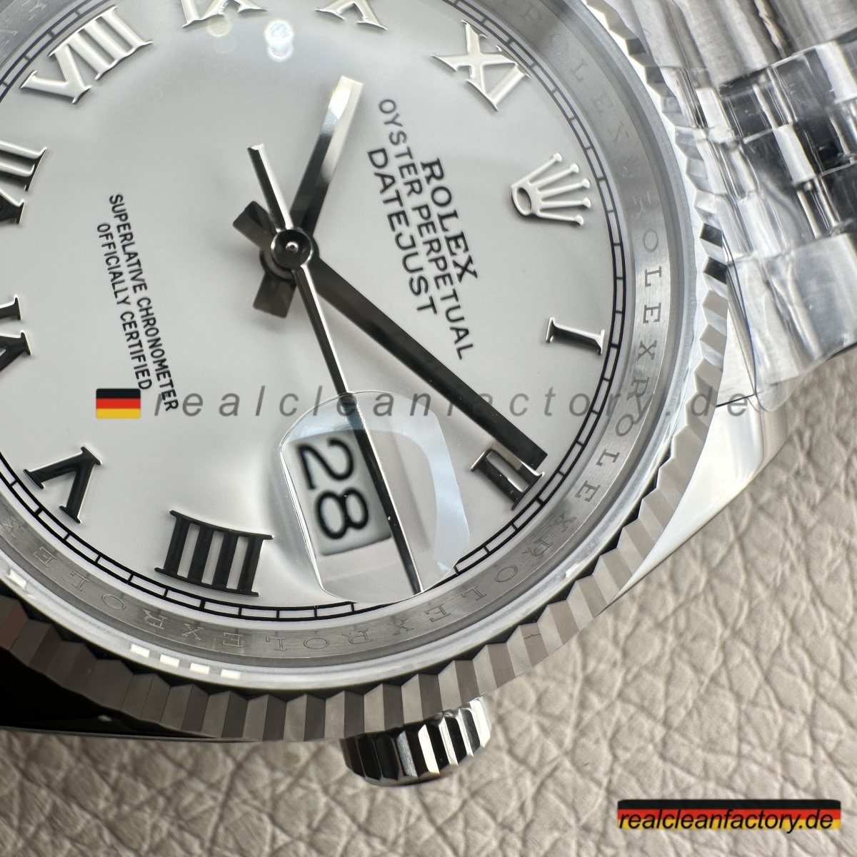 • Clean Factorys Super Clone Rolex Datejust 126234-0025 definiert das klassische weiße Zifferblatt mit römischen Ziffern neu – eingefasst in hochwertigem Edelstahl und vollendet durch eine geriffelte Weißgold-Lünette. Diese Konfiguration verbindet zeitlose Eleganz mit makelloser Ausführung und zeigt, dass Schlichtheit durch meisterhafte Handwerkskunst zur höchsten Form von Luxus werden kann. Die Kombination aus römischen Ziffern und weißem Zifferblatt verkörpert Rolex’ dauerhafteste formale Ästhetik – durch Clean Factorys dauerhafte Weißgold-Technologie und präzise Zifferngestaltung auf ein neues Level gehoben.